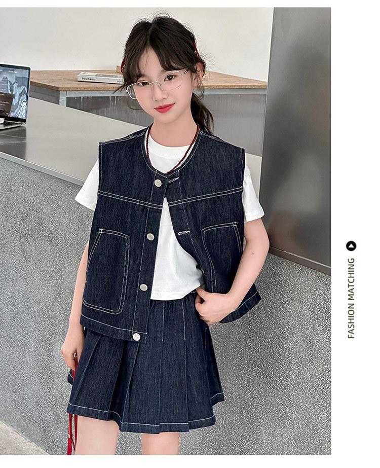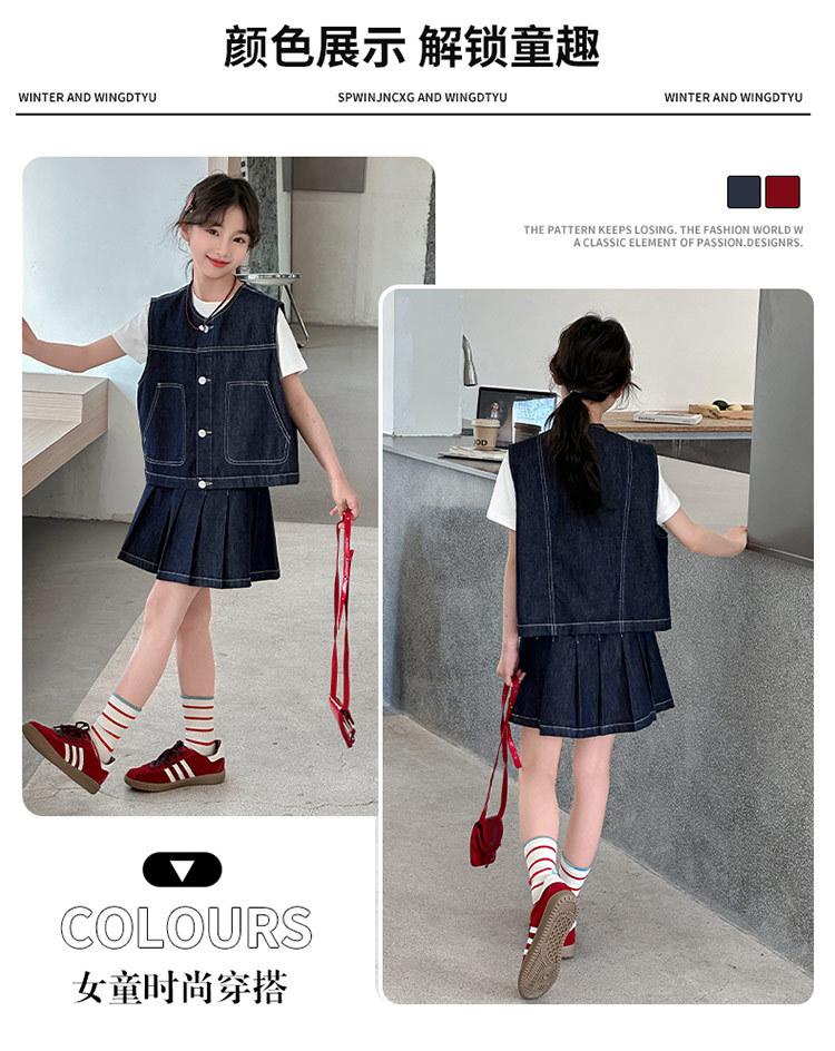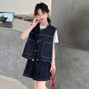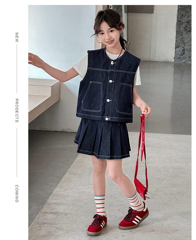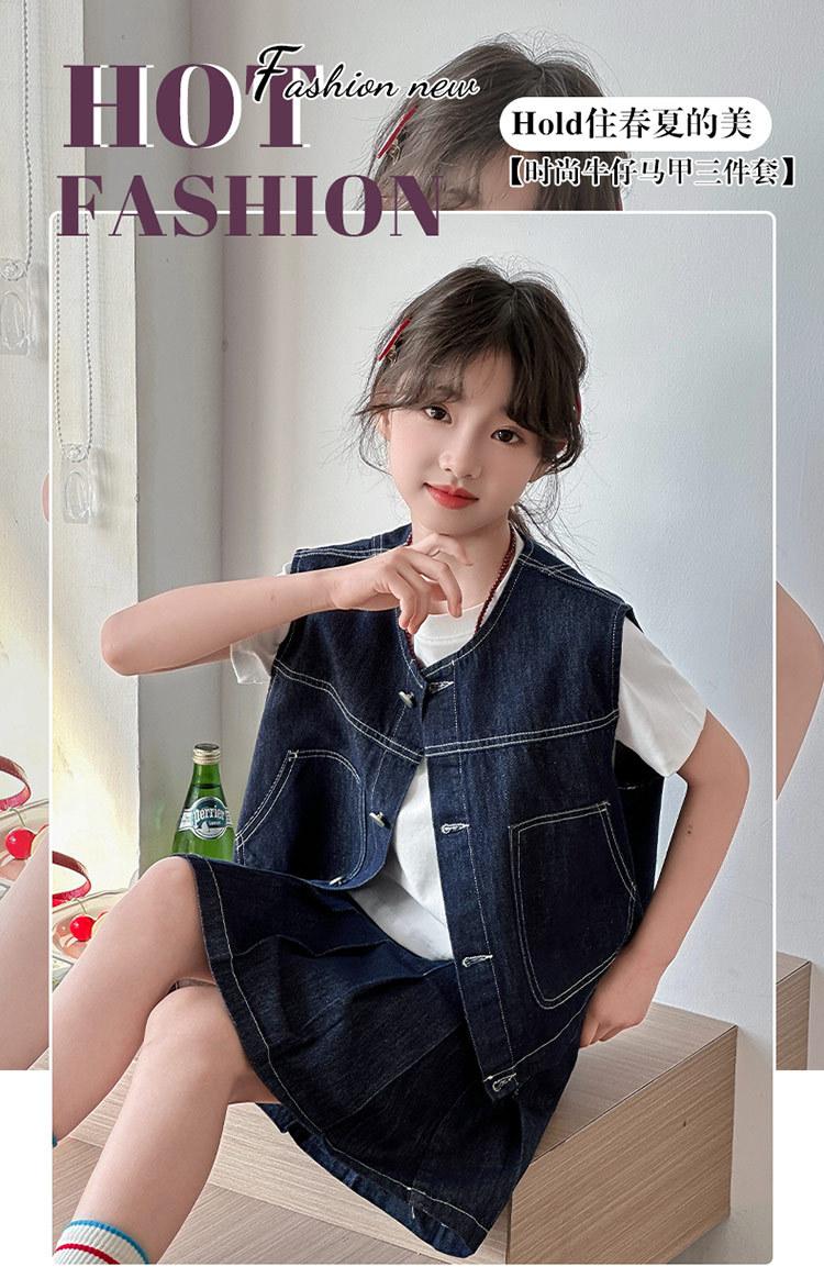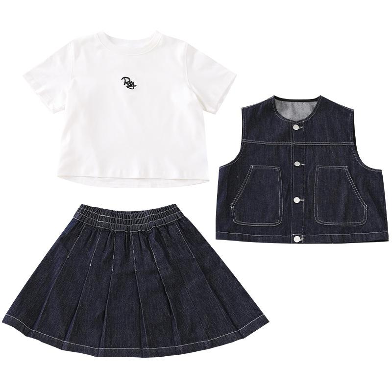 Traje de mezclilla para niña 2025 Primavera y Verano Nuevo Estilo Chaleco de Moda para Niños Camiseta Conjunto Americano de Tres Piezas para Niños Medianos y Grandes