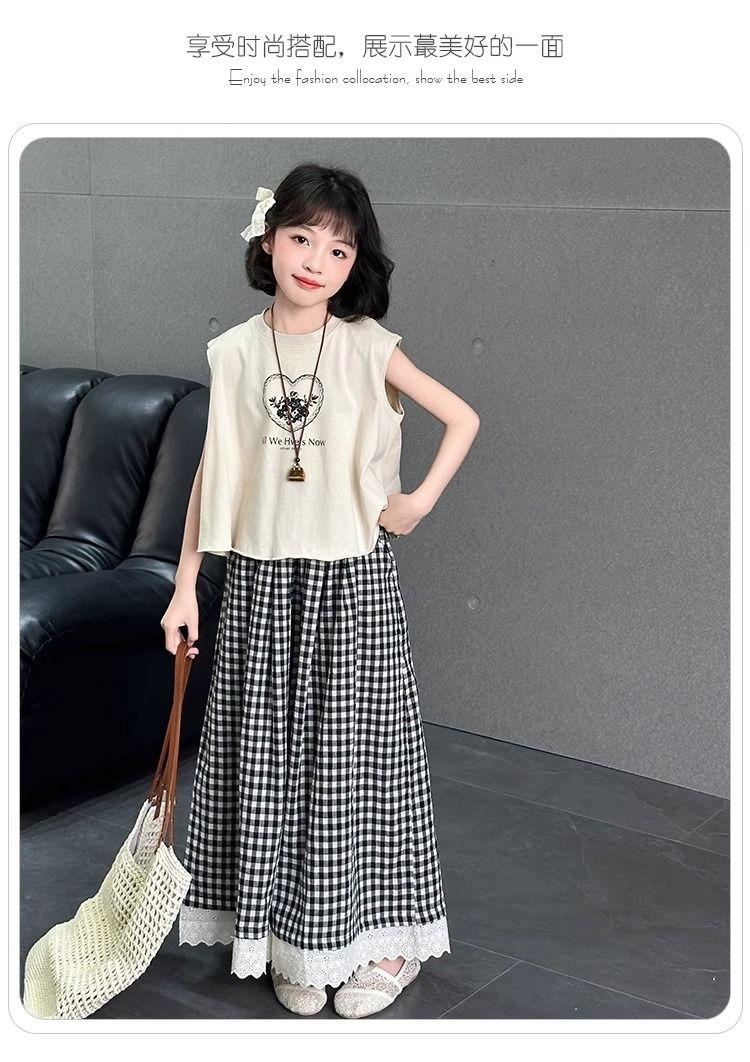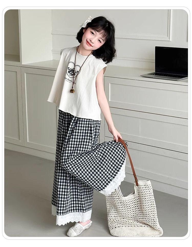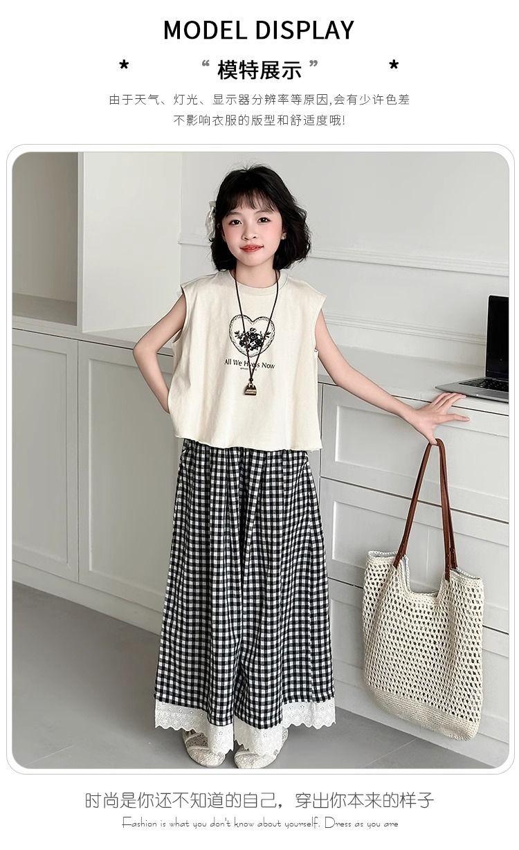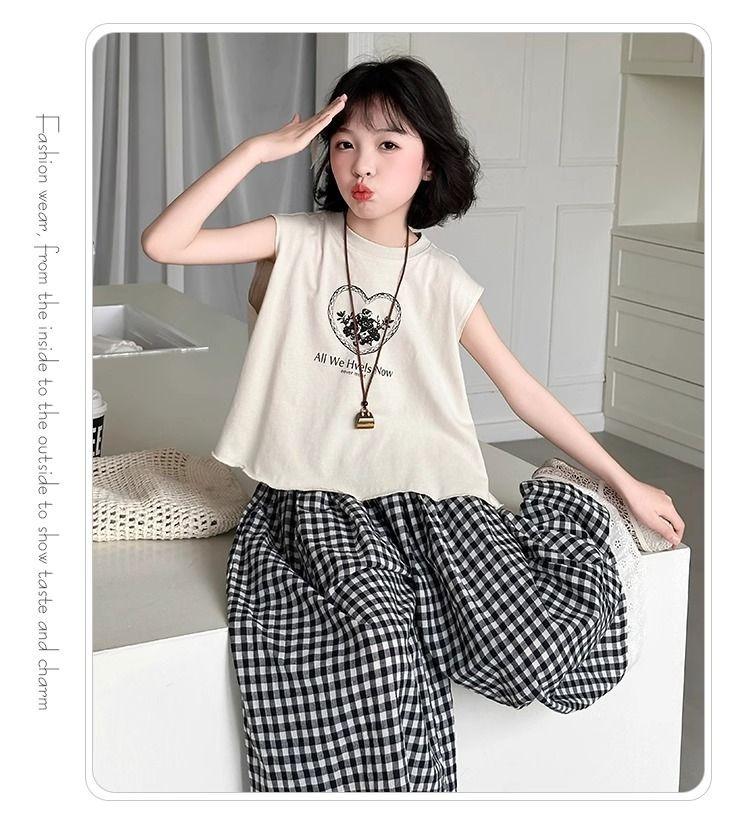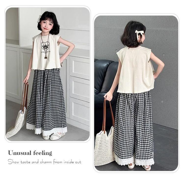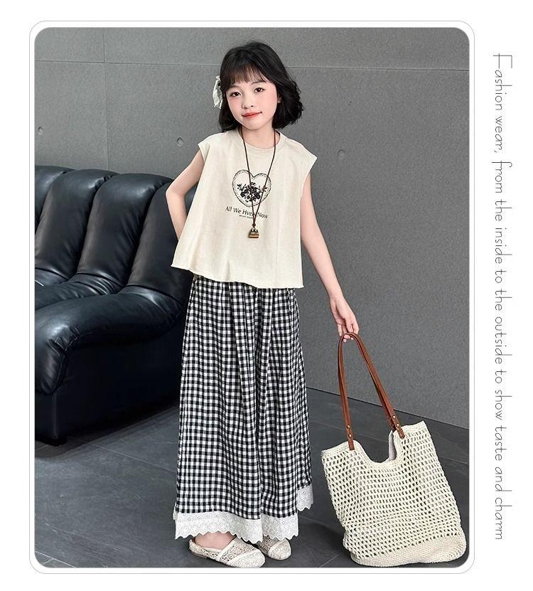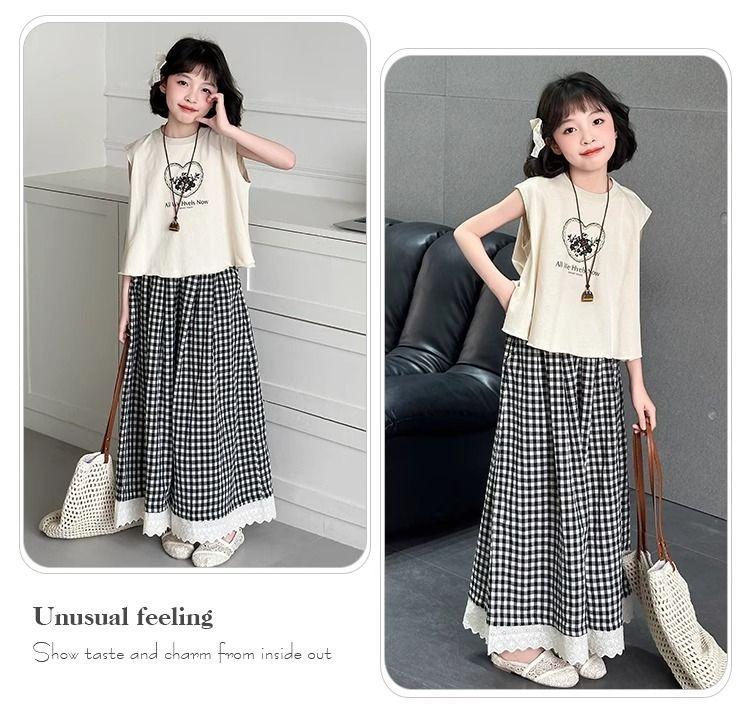 Traje de Verano para Niñas 2025 Nuevo Estilo Camiseta Casual sin Mangas para Niñas Mediana y Grande Encaje para Niños Suelto Pantalón a Cuadros Falda