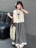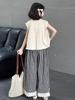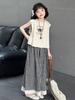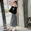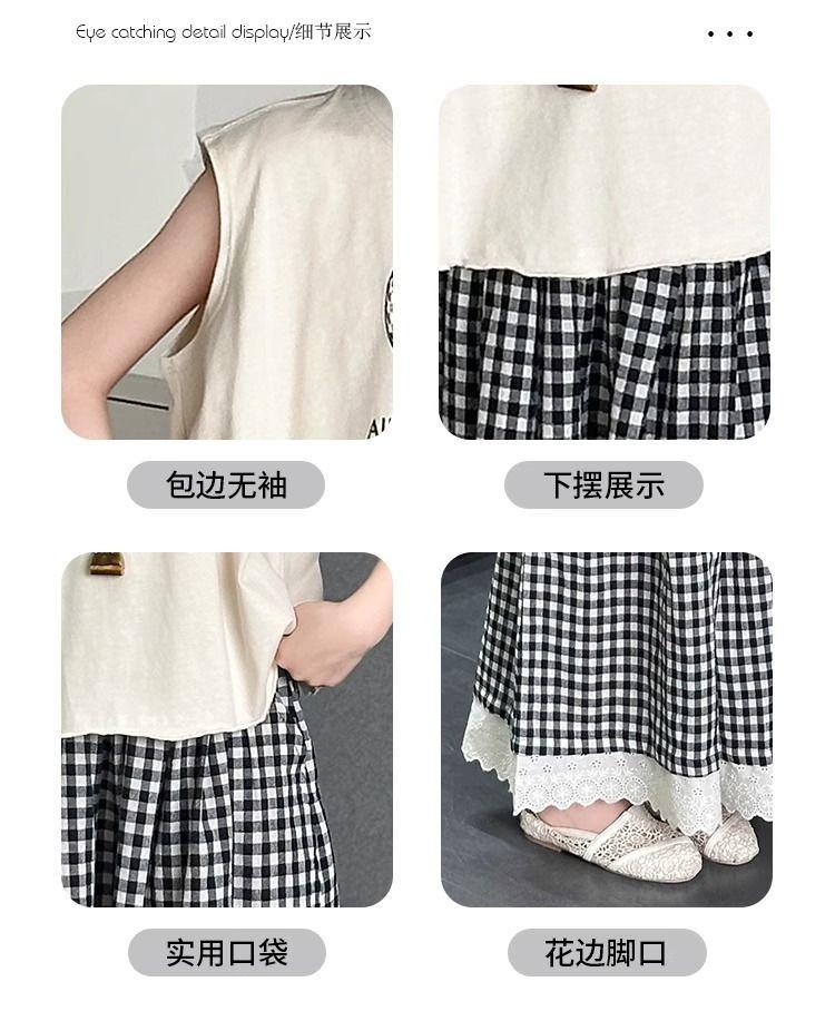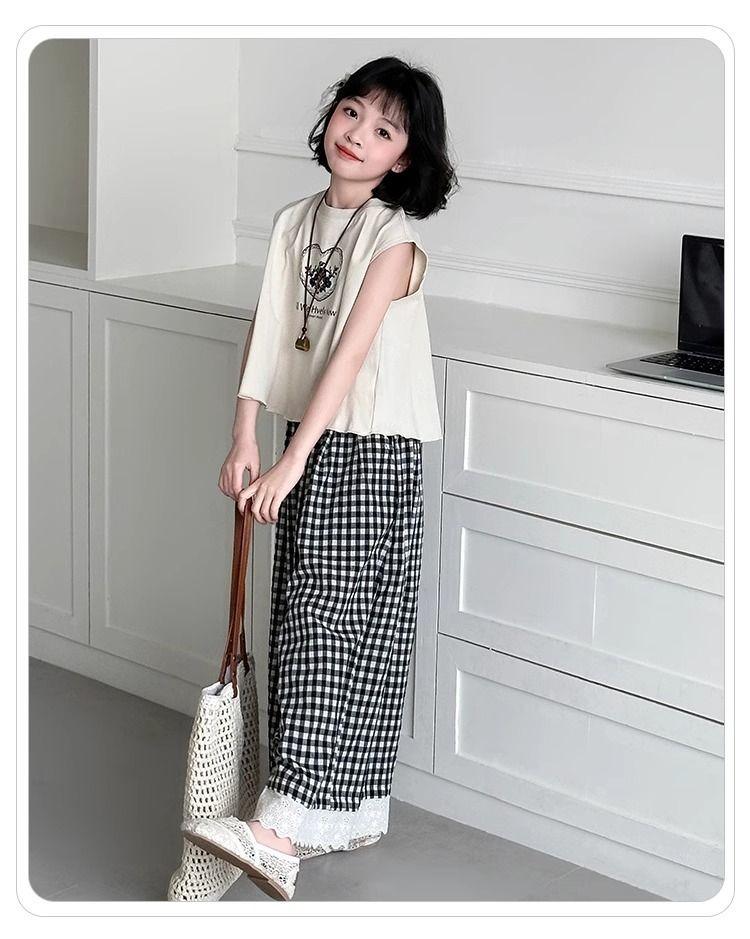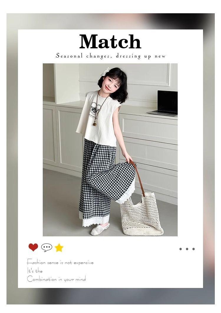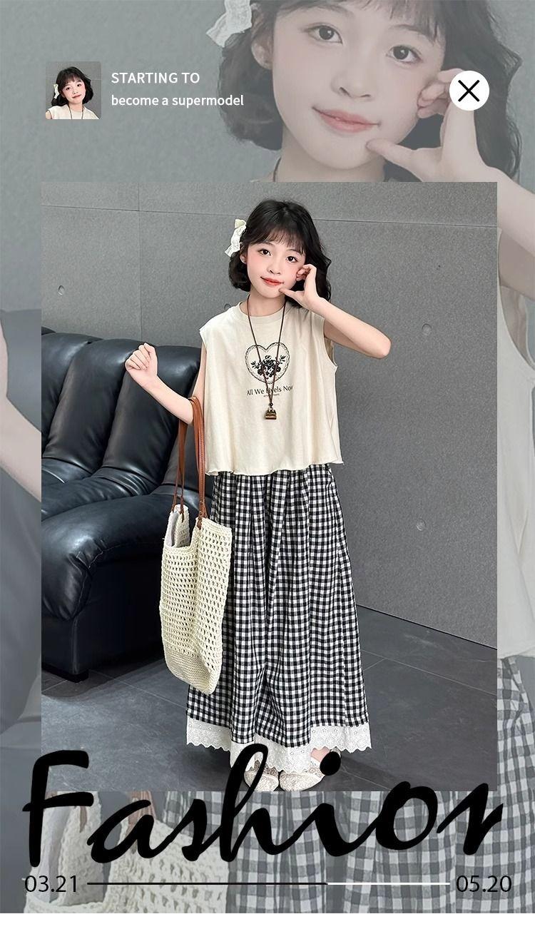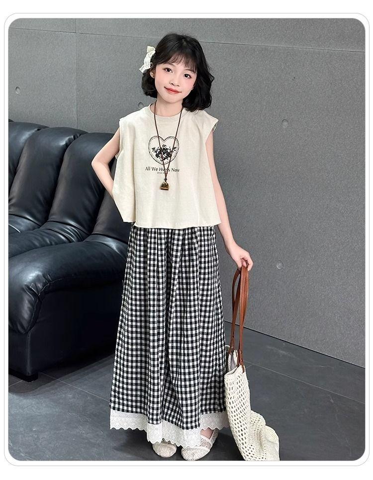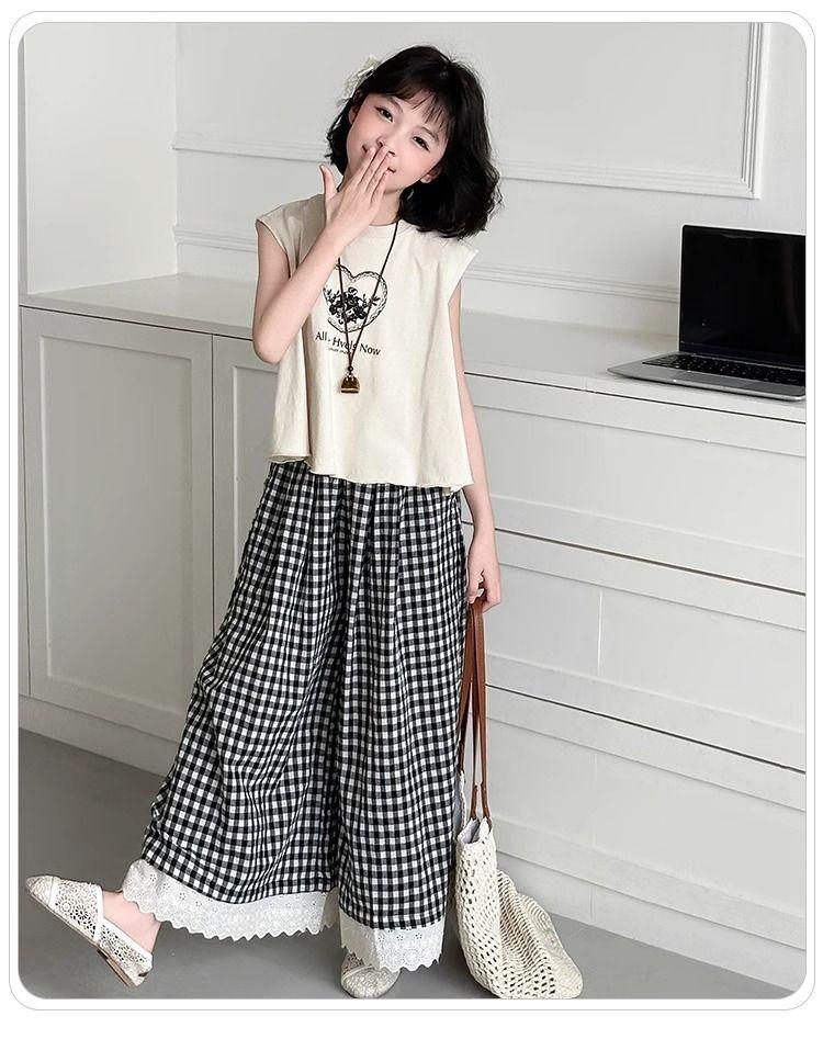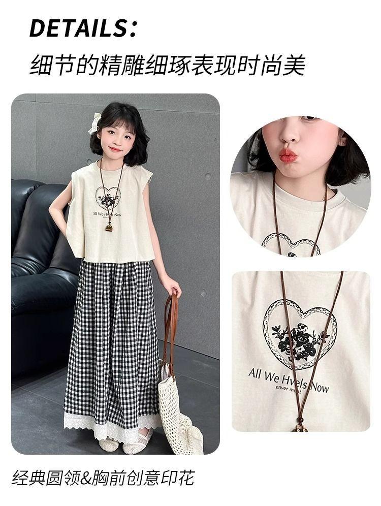 Traje de Verano para Niñas 2025 Nuevo Estilo Camiseta Casual sin Mangas para Niñas Mediana y Grande Encaje para Niños Suelto Pantalón a Cuadros Falda