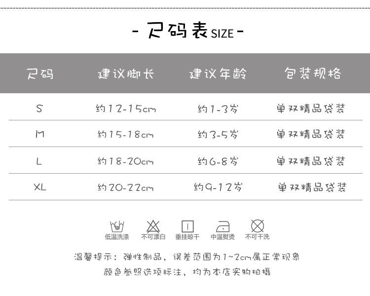 S (about 1-3 years old), M (about 3-5 years old), L (about 6-8 years old), XL (approximately 9-12 years old)