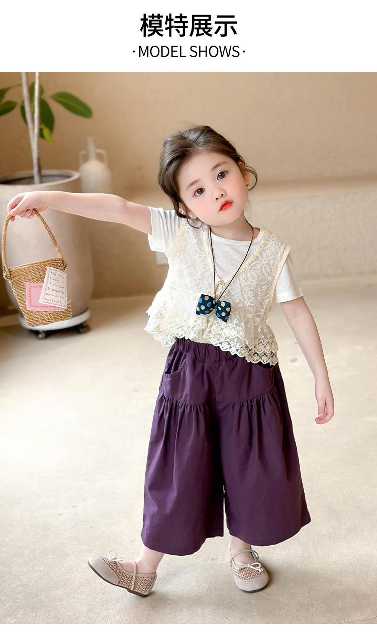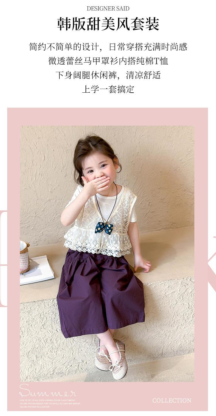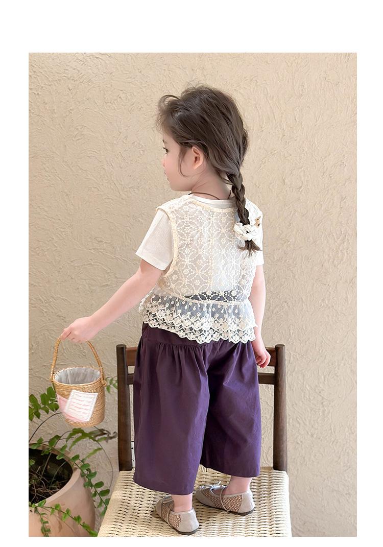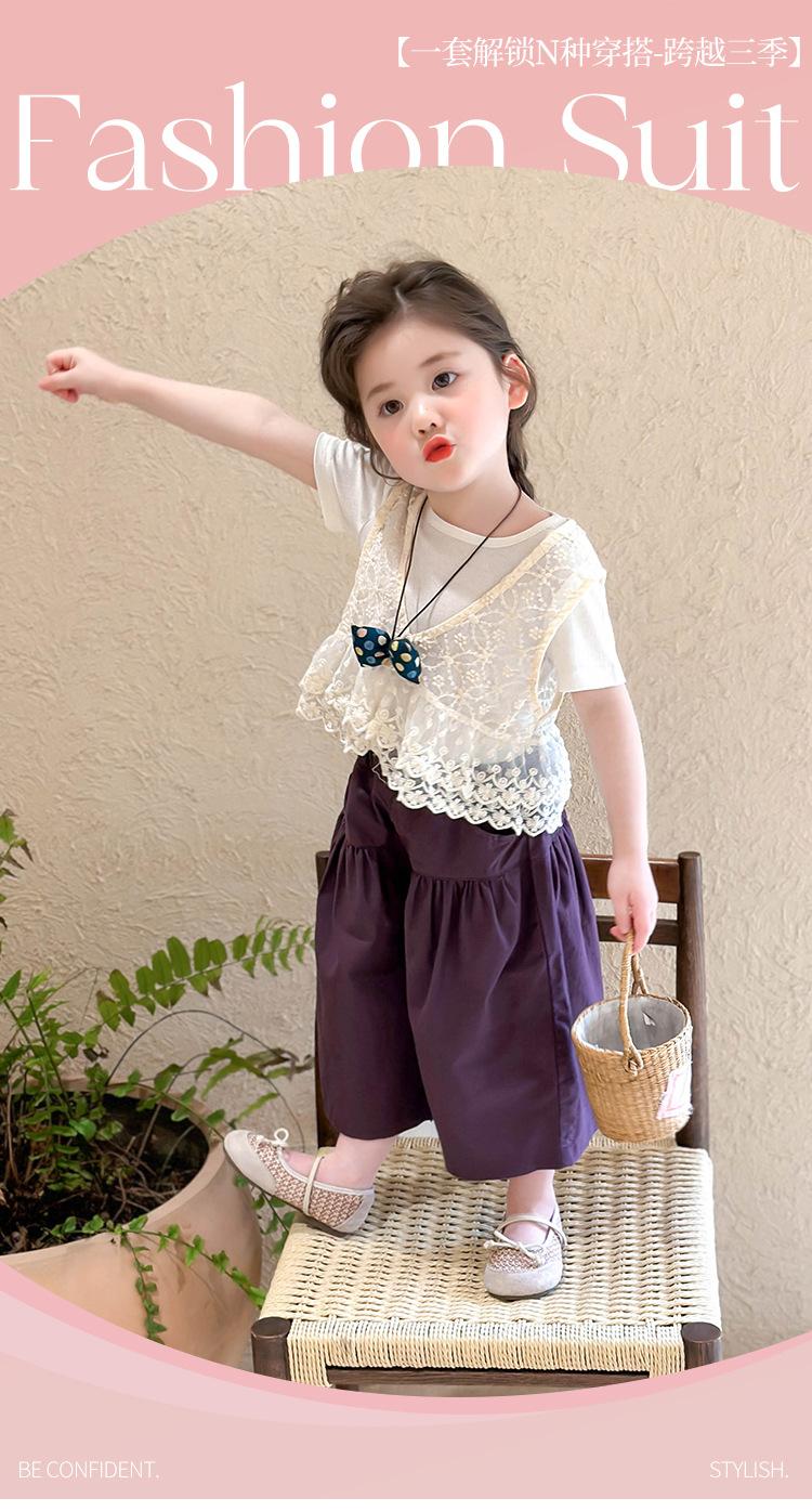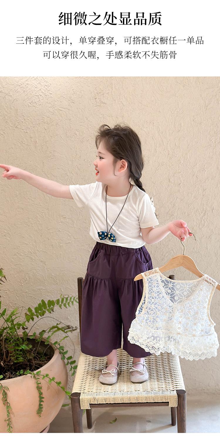 Traje de Verano de Manga Corta para Niñas 2025 Nuevo Conjunto de Tres Piezas para Bebé Infantil Dulce y Elegante con Chaleco de Encaje y Pantalones de Pierna Ancha