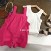 Bowknot fuchsia dungaree shorts + white vest, Bowknot Rose Red Overalls Shorts, White Tank Top YULIN