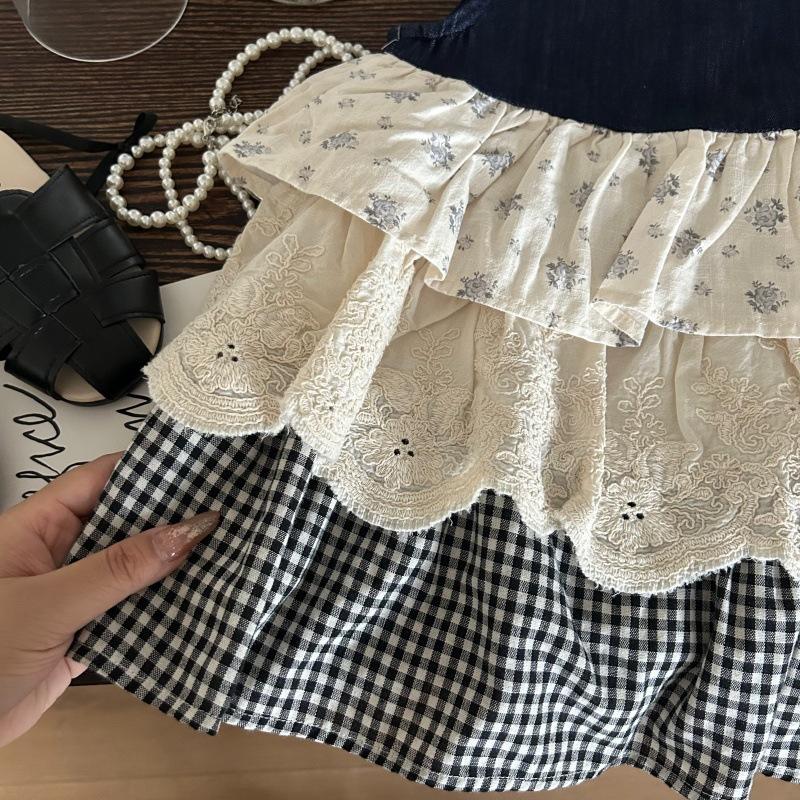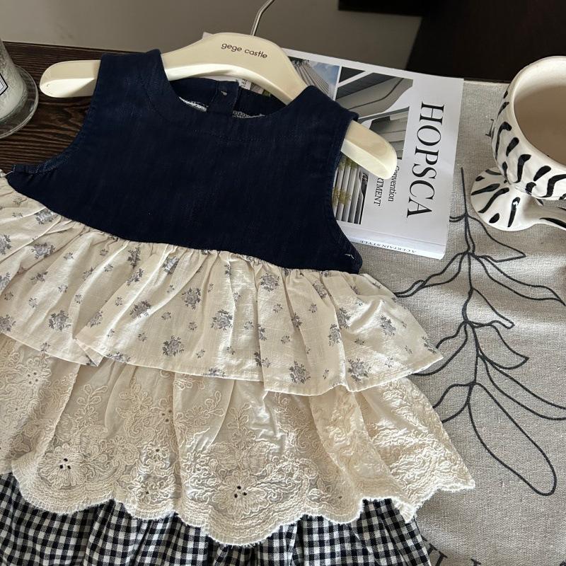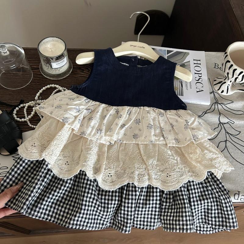 Vestido Chaleco sin Mangas para Niñas Verano Nuevo Niñas Floral Cuadros Empalme Falda Bebé Niña Falda de Pastel Vestido Apilado