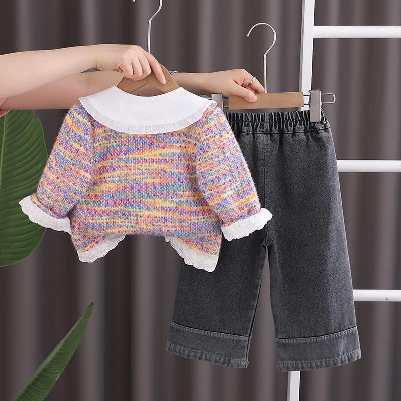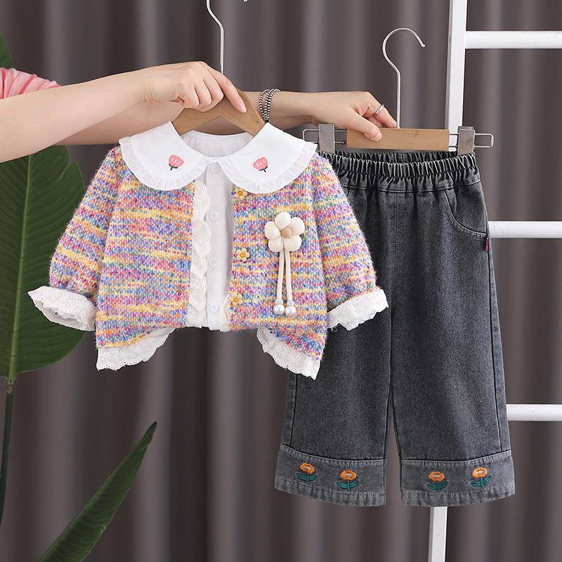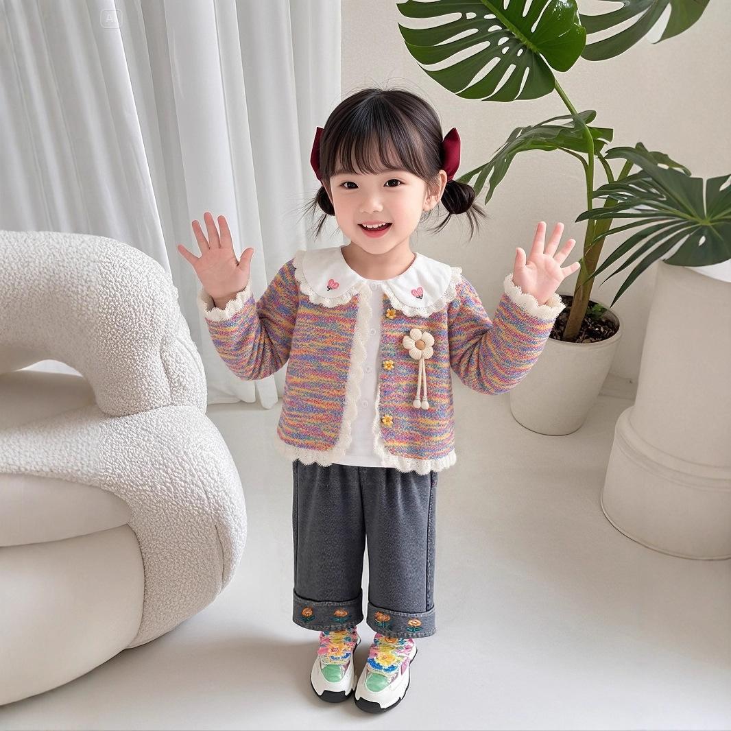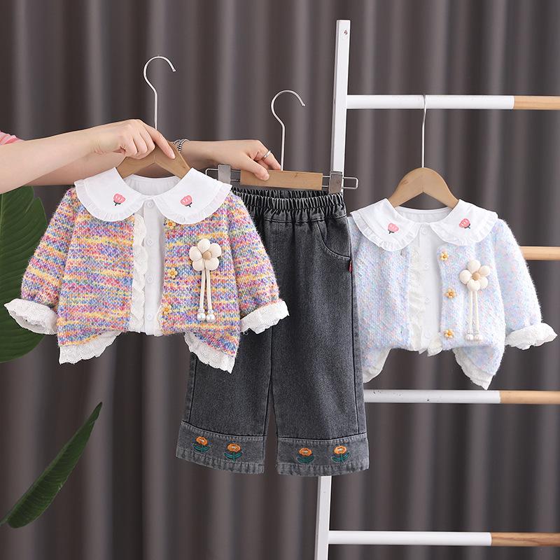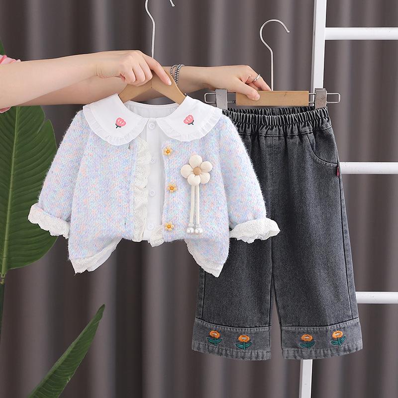 Conjunto de Otoño para Niñas 2025 Nuevo Conjunto de Tres Piezas de Encaje de Girasol para Niños de Moda Ropa de Primavera y Otoño para Bebé Estilo Coreano