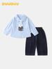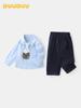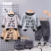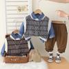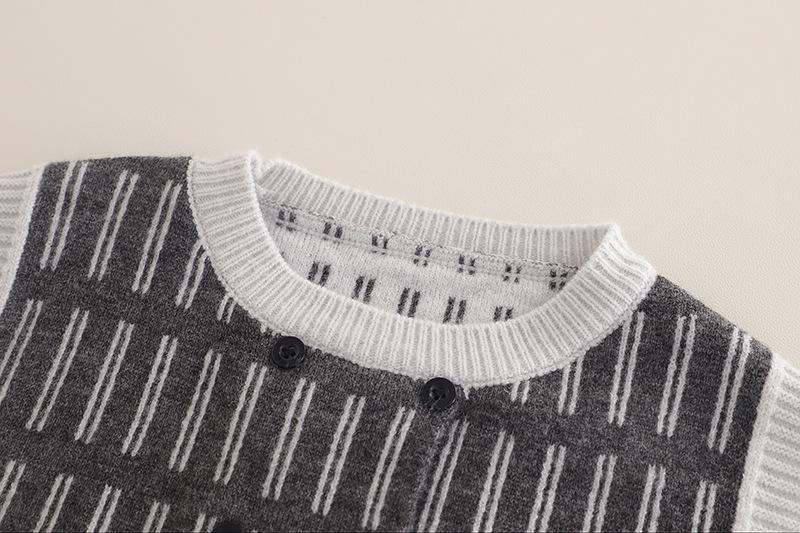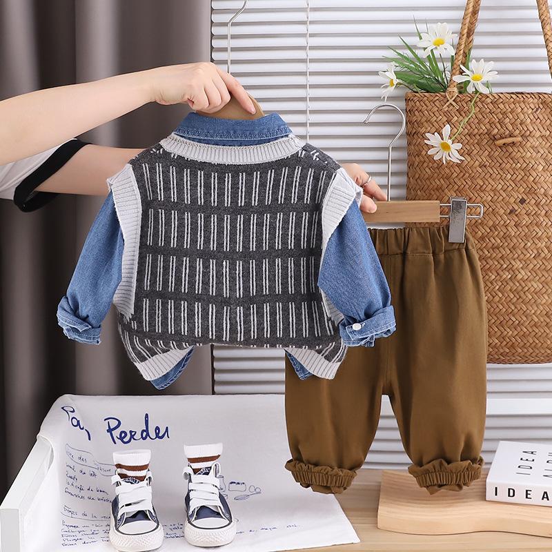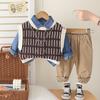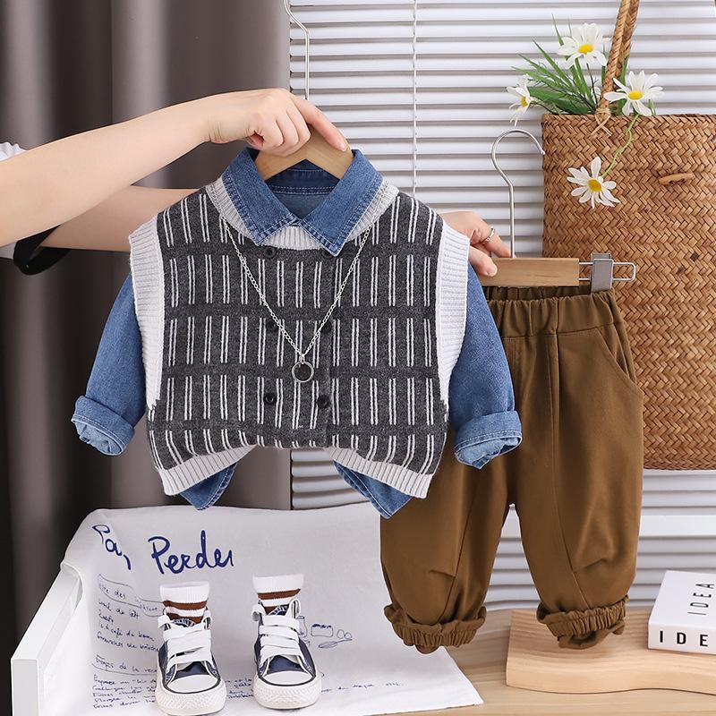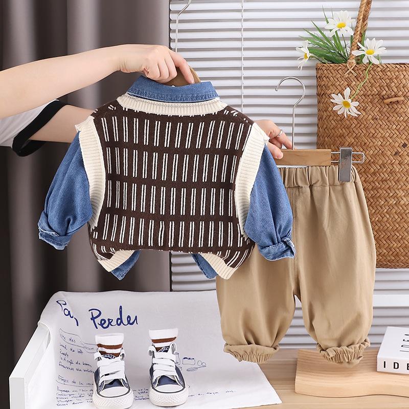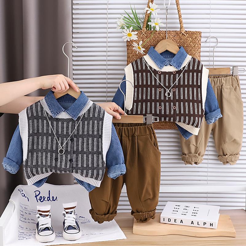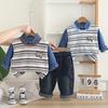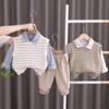 Conjunto de tres piezas de chaleco suéter abotonado de rayas verticales para bebé niño, estilo coreano, ropa para niños, ropa de moda para bebés, niño de un año