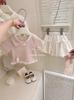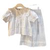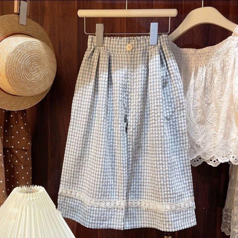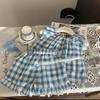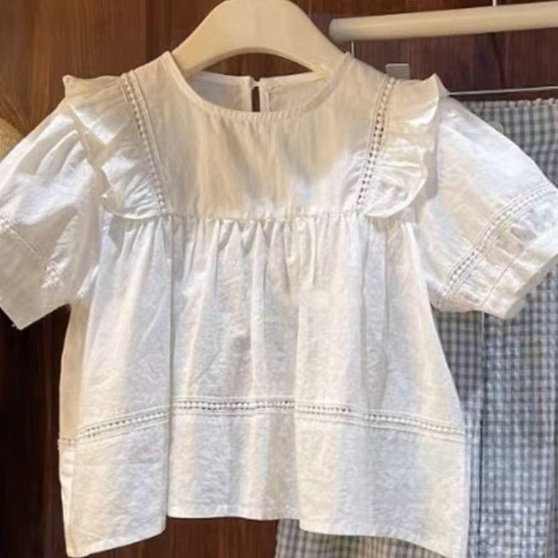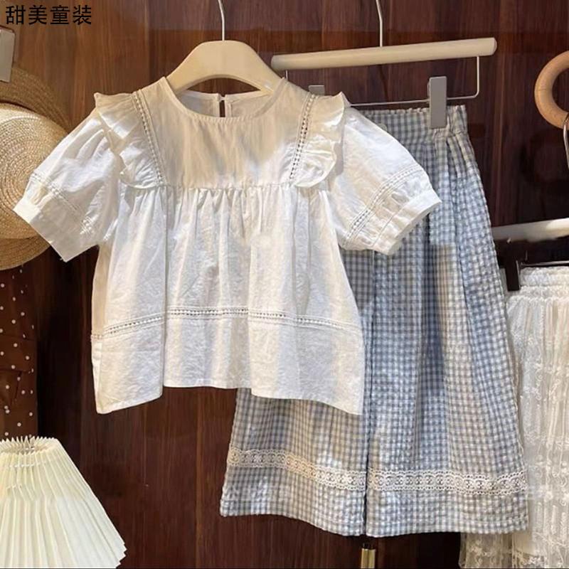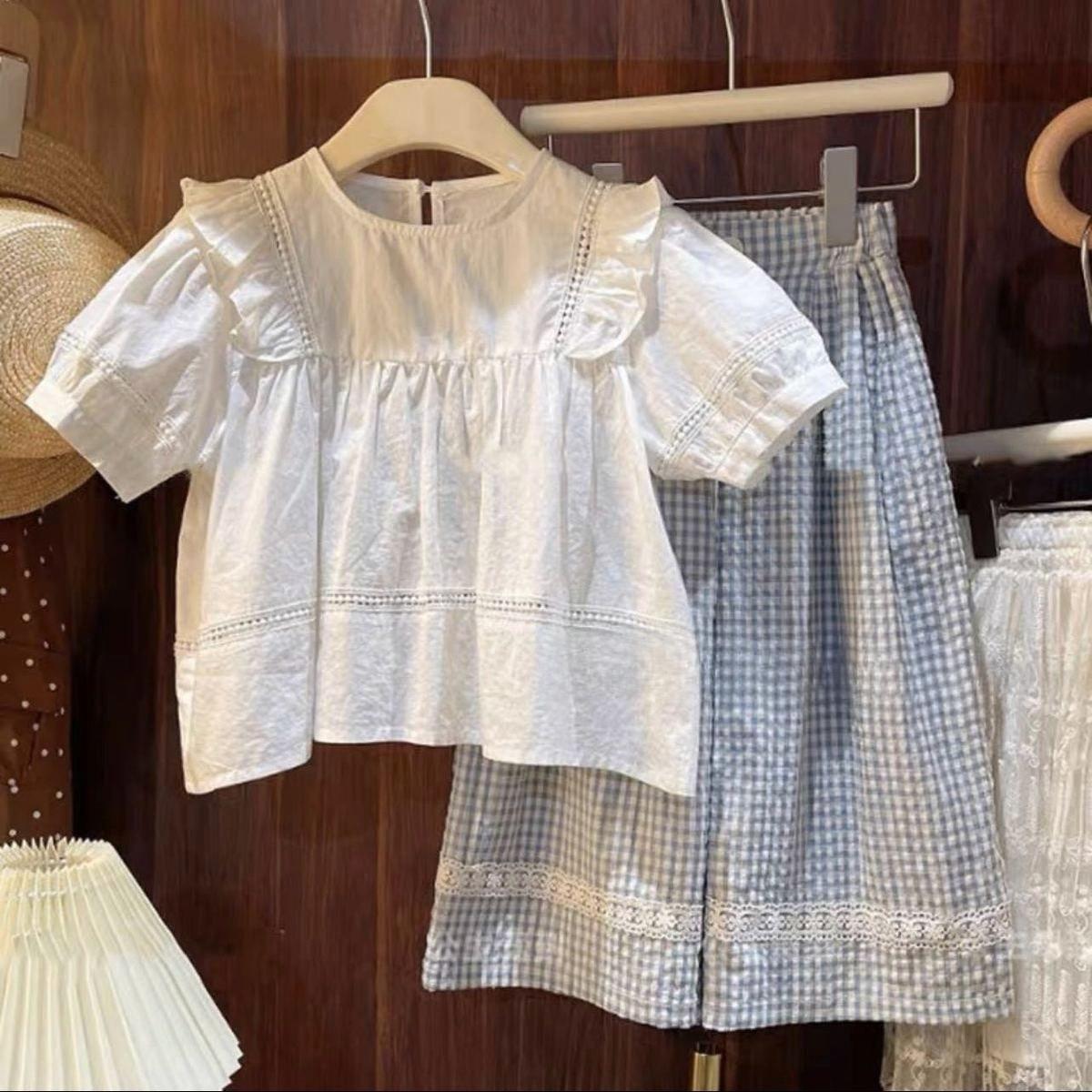 Conjunto de Verano para Niñas Estilo Coreano Top de Manga Abullonada de Verano para Bebé Niña Pantalones a Cuadros Conjunto de Dos Piezas Ropa Infantil Dulce
