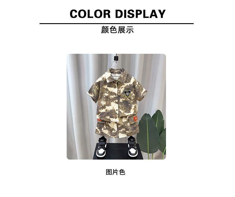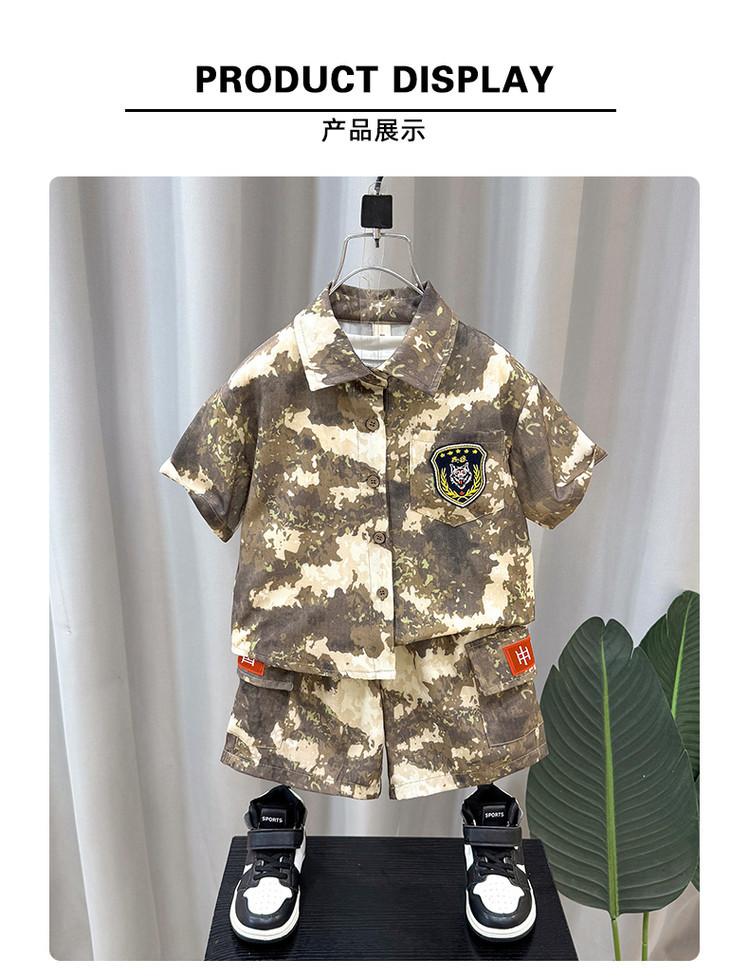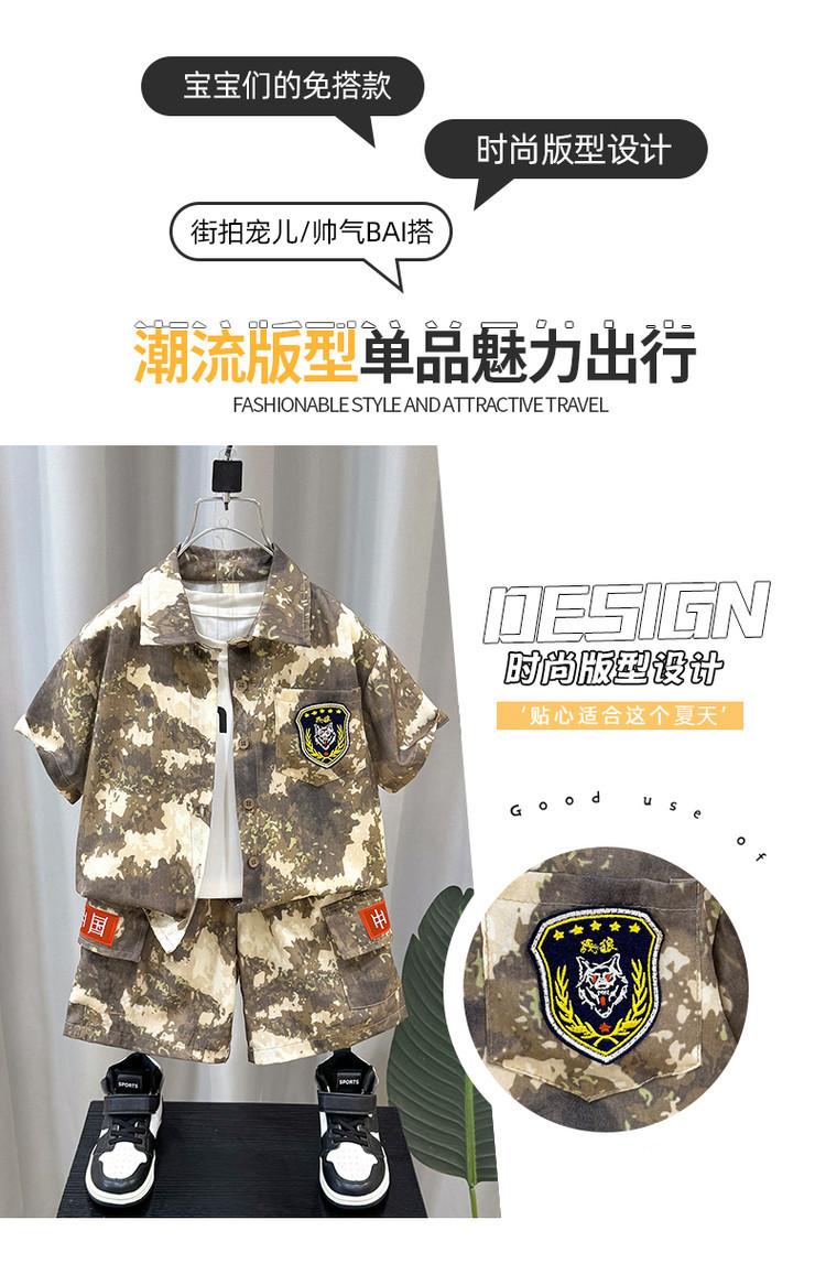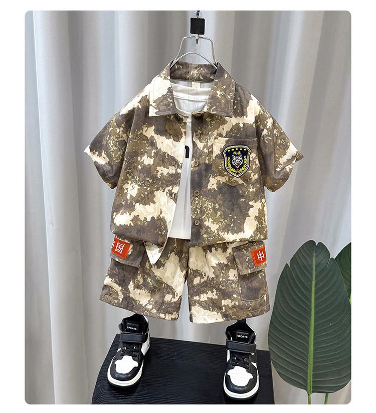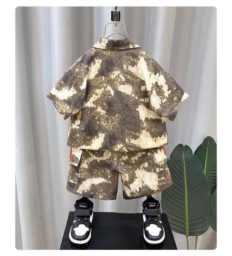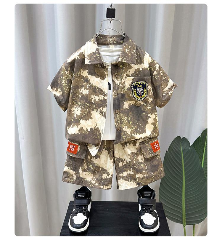 Traje para niño Verano 2025 Nuevo Fresco Guapo Camuflaje para niños Conjunto de dos piezas de manga corta Ropa de camisa de verano para niño