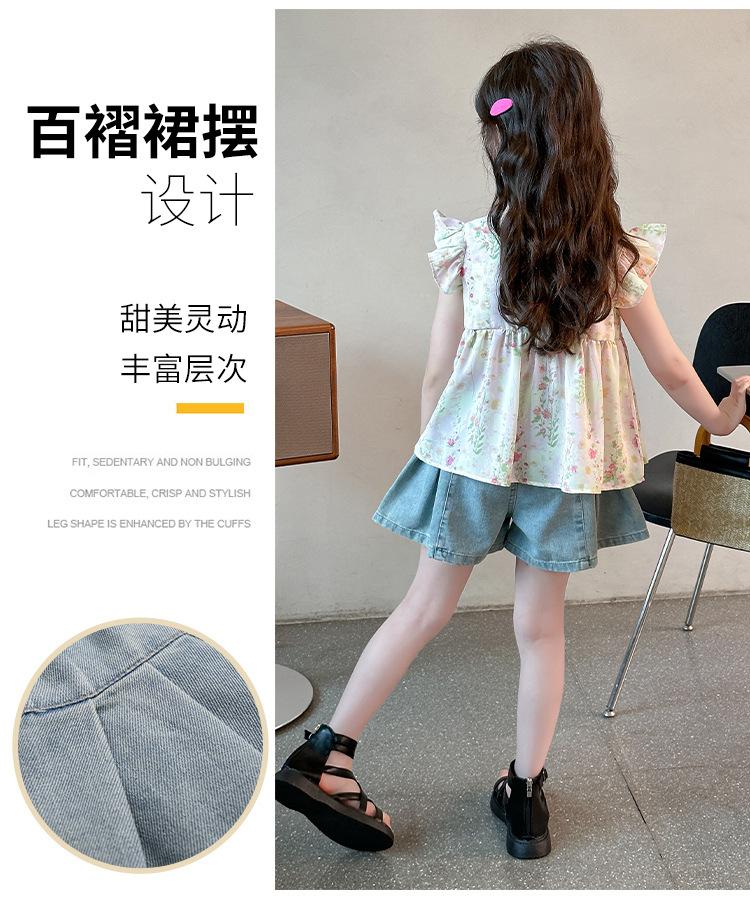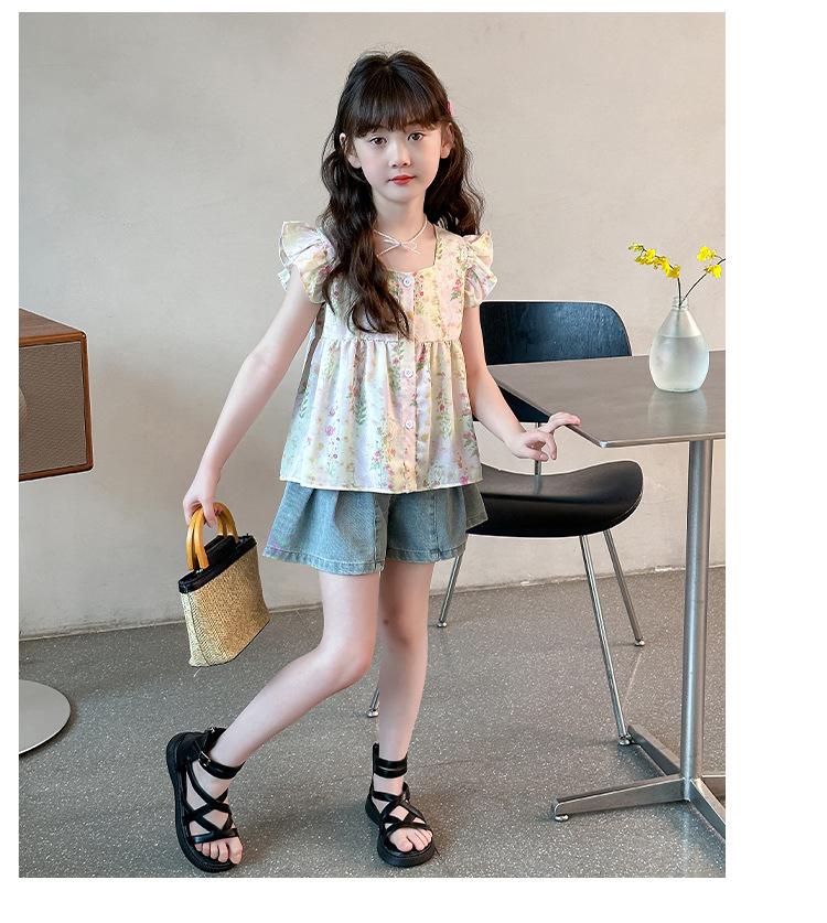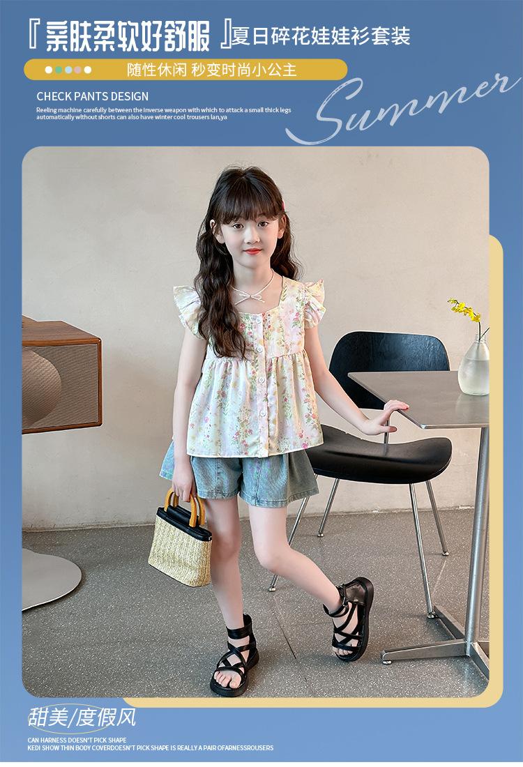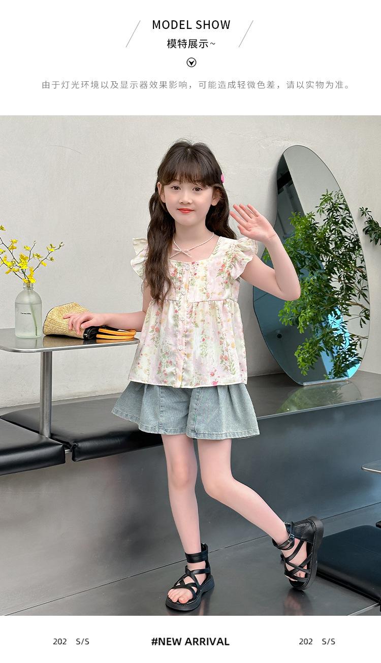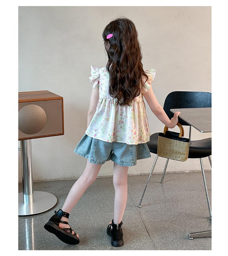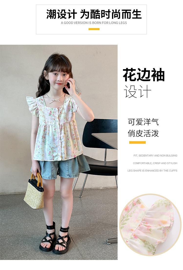 Traje Dulce de Verano para Niñas 2025 Nuevo Estilo Niña Pequeña Muñeca Francesa Camisa Floral Shorts Conjunto de Dos Piezas