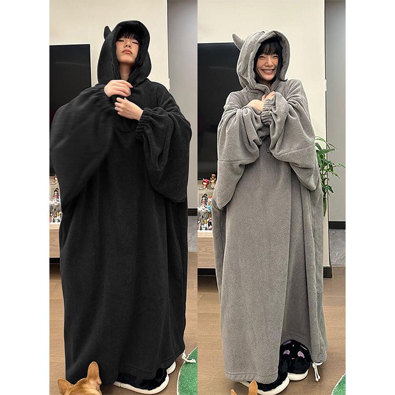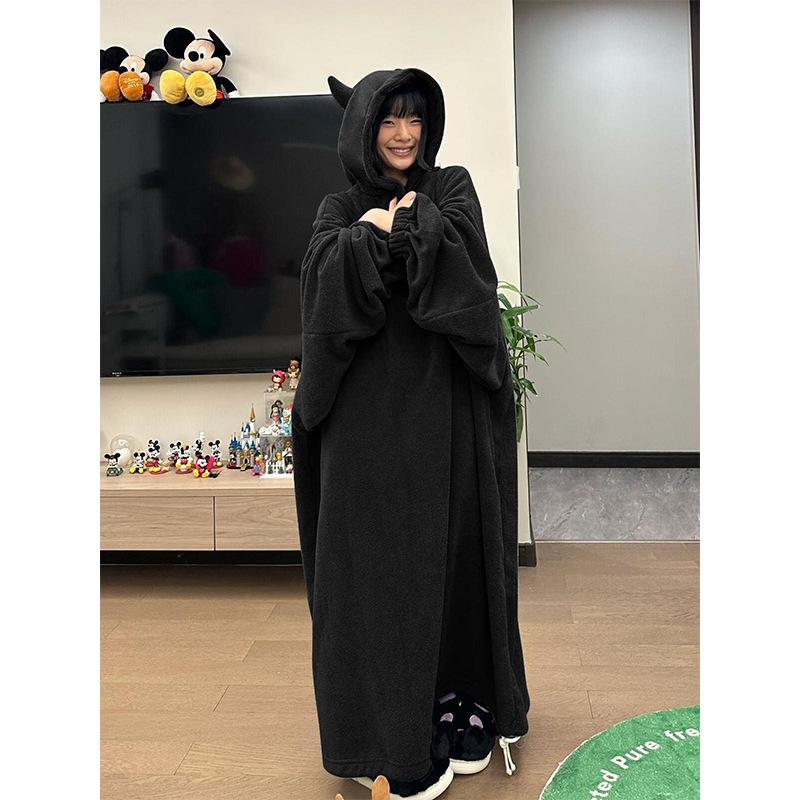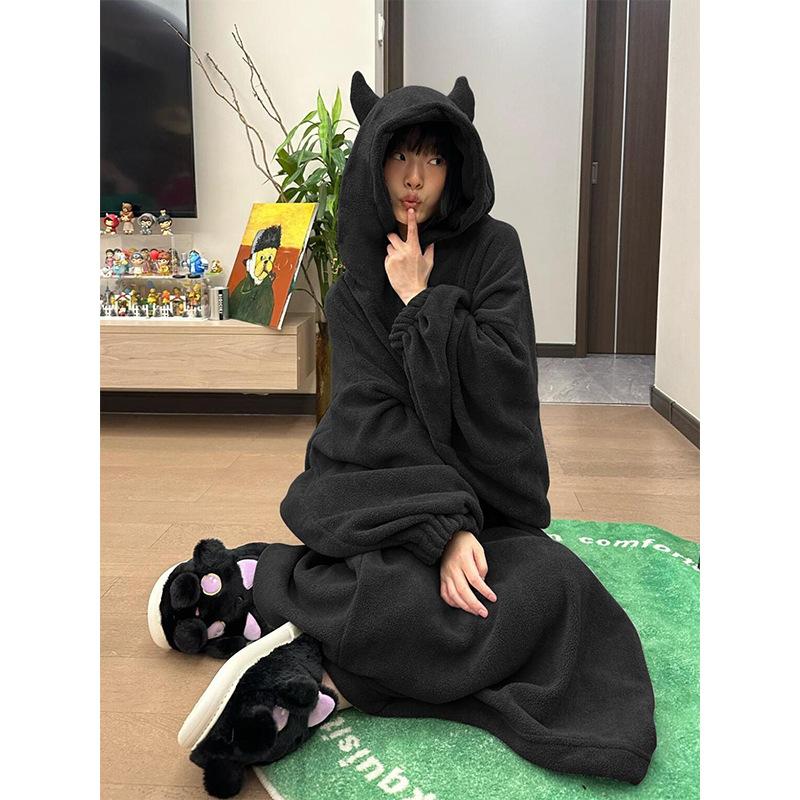 Pijama Popular de Invierno para Mujer de Forro Polar Coral con Capucha de Diablito Negro