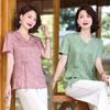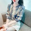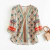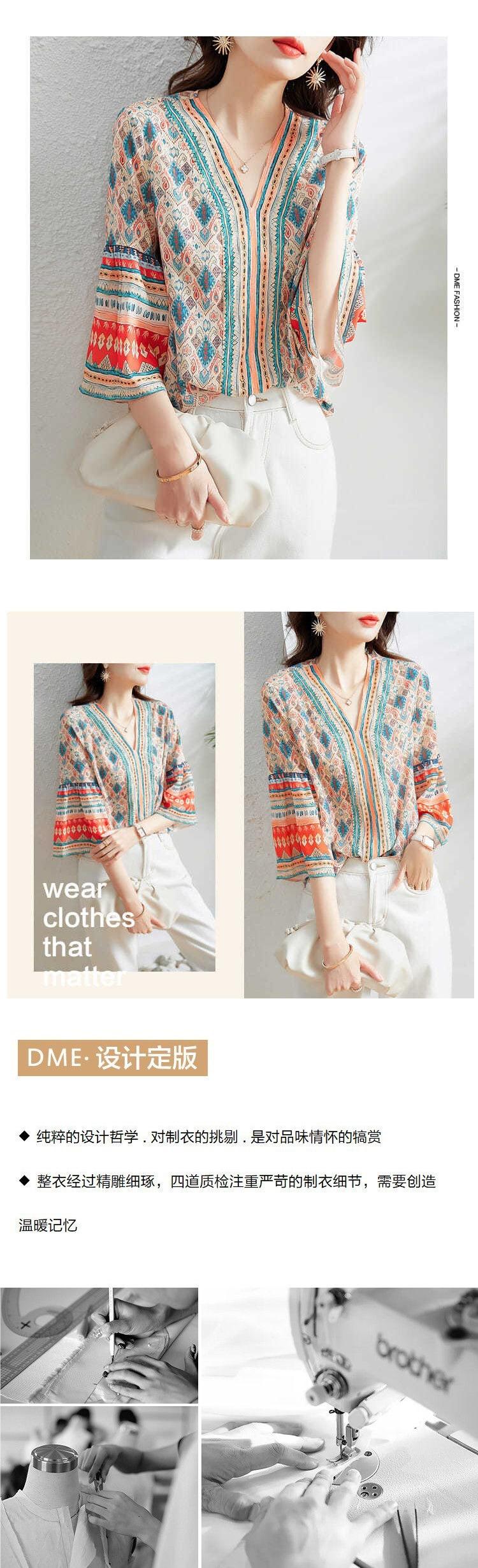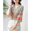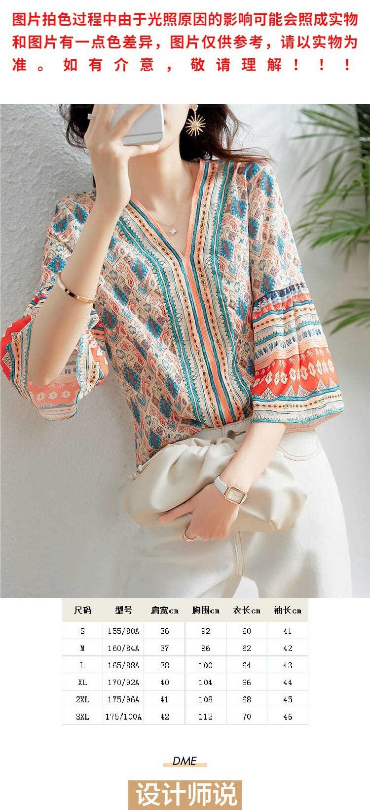 Verano 2023 Nueva Camisa de Chifón Estampada Estilo Étnico con Cuello en V Camisa Holgada de Manga Siete Cuartos Top de Mujer