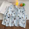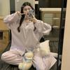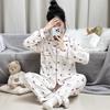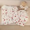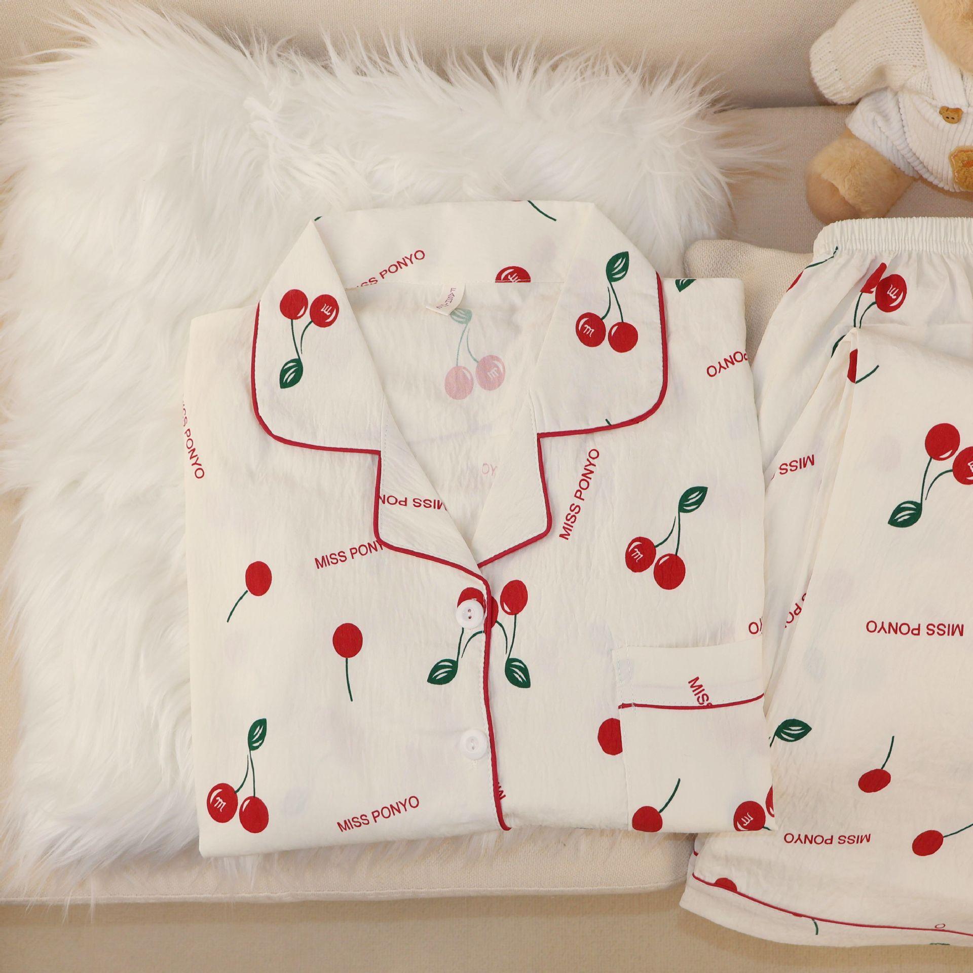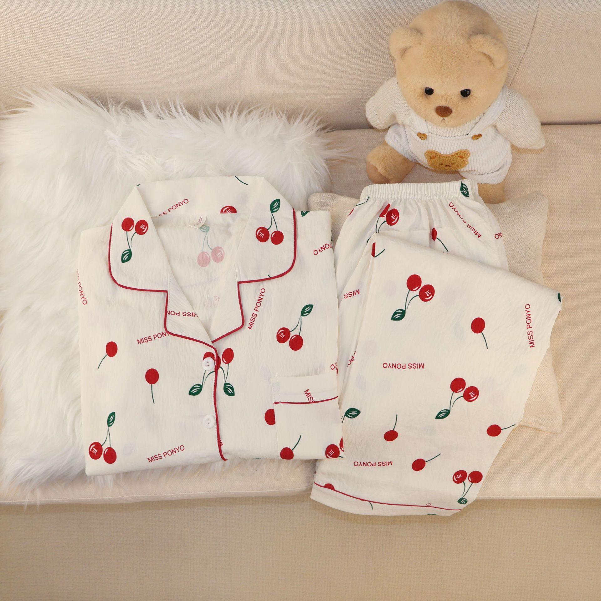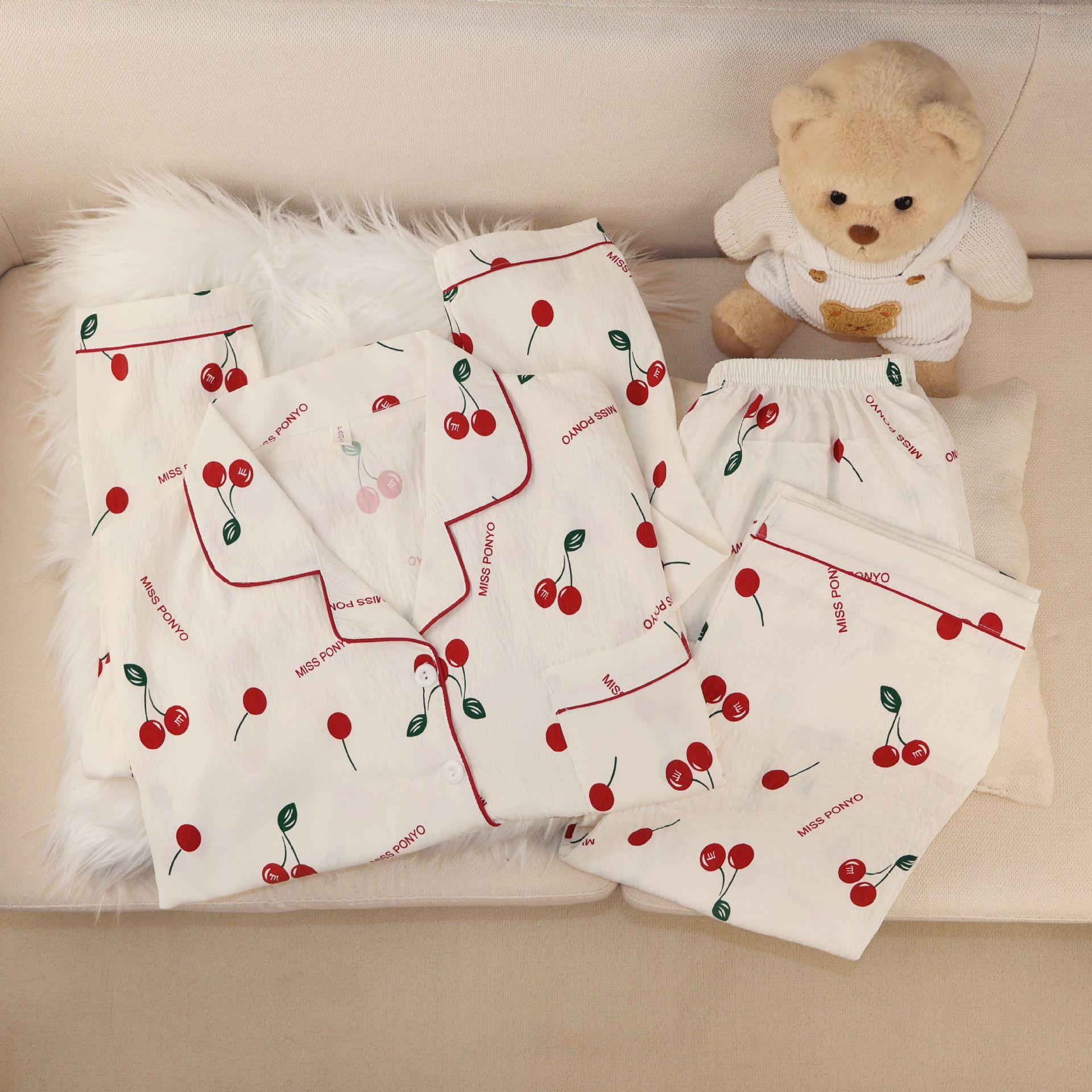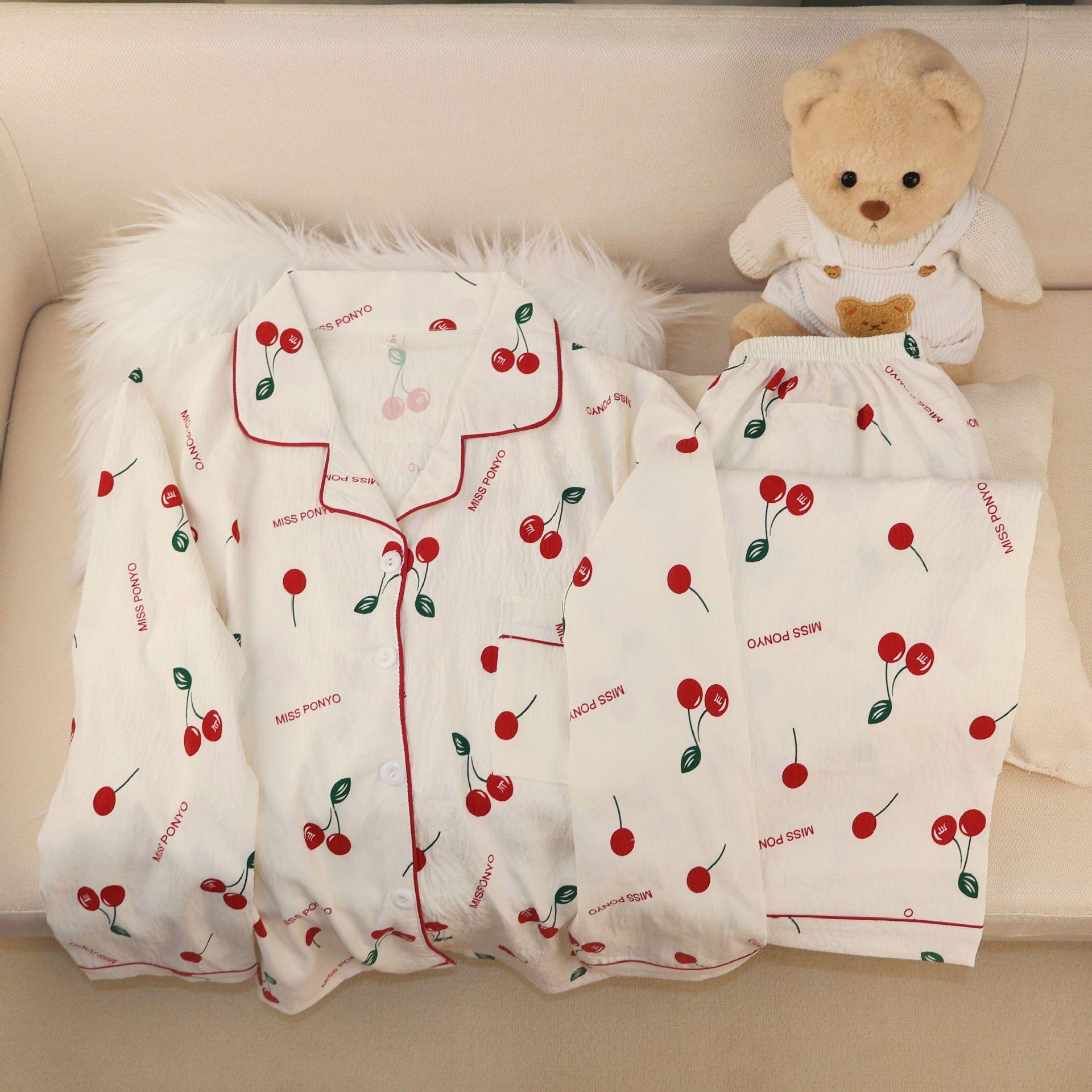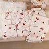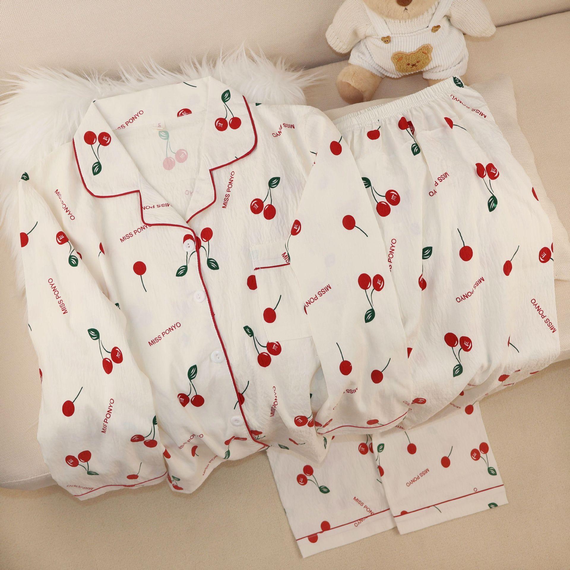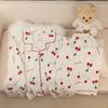 Primavera y Otoño Nuevo Algodón Nube Pantalones de Manga Larga Pijama Cárdigan Solapa Dos Piezas Dulce Lindo Cereza Ropa para el Hogar