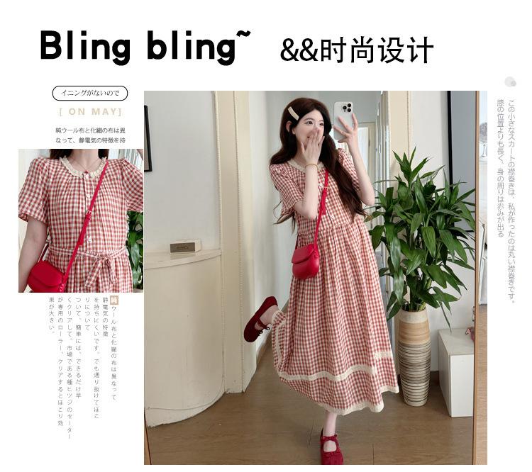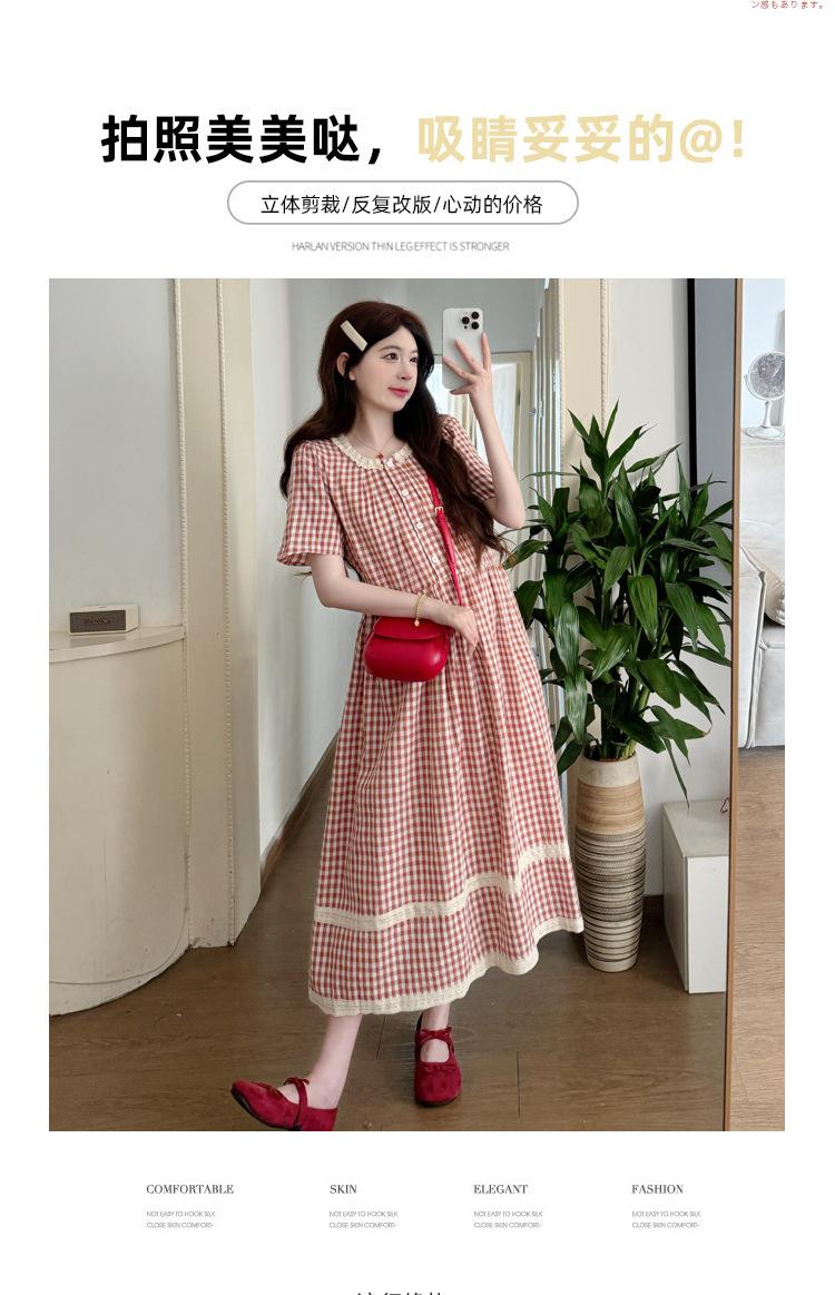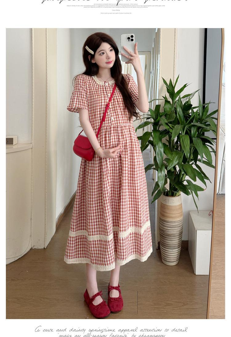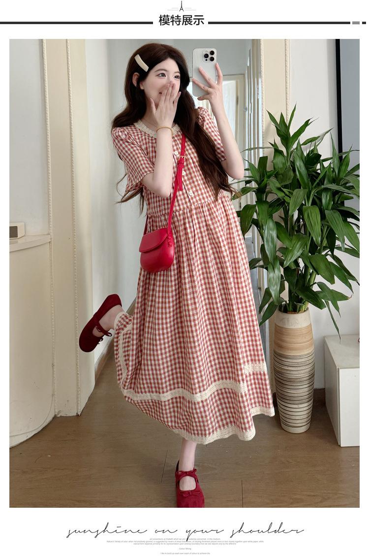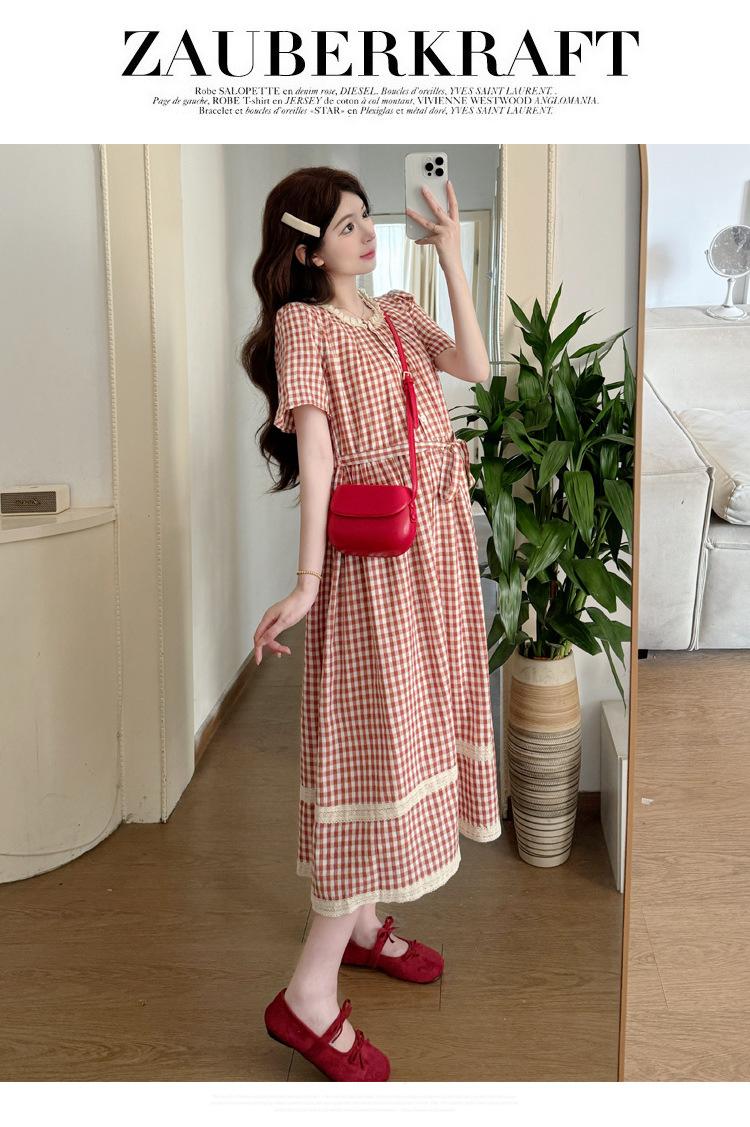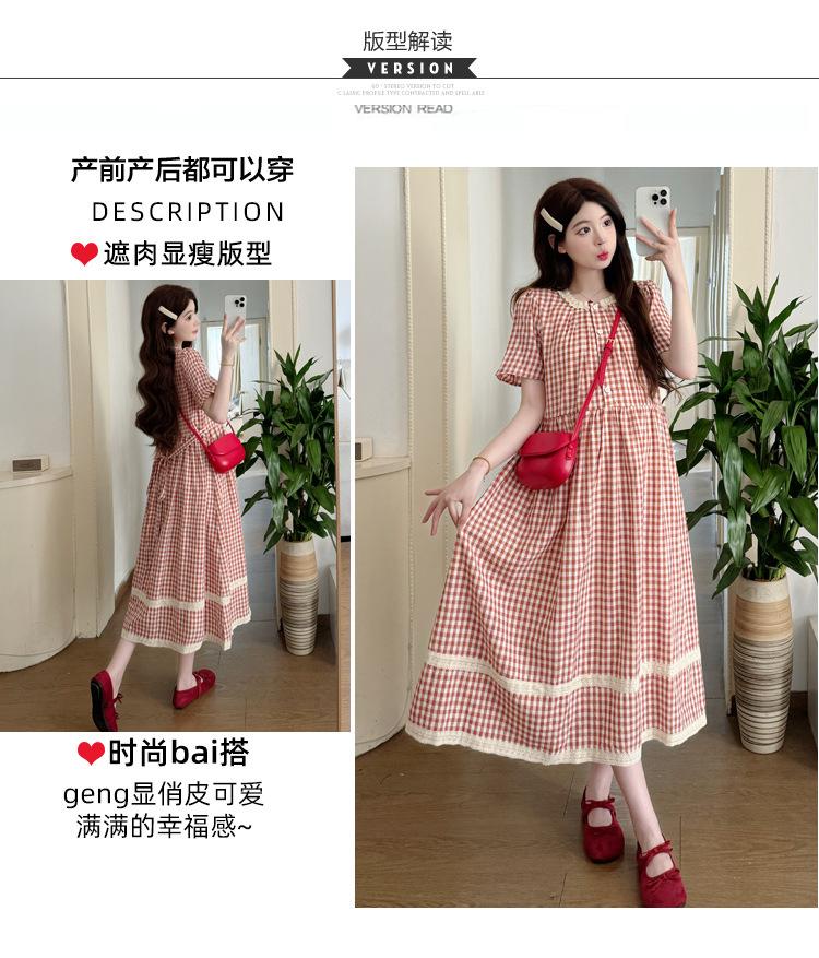 Maternidad 2025 Verano Nuevo Dulce Reductor de Edad Cuadros Rojos Encaje Suelto Talla Grande Vestido para Mujeres Embarazadas