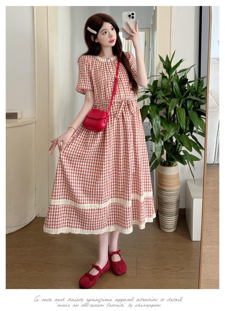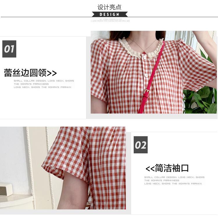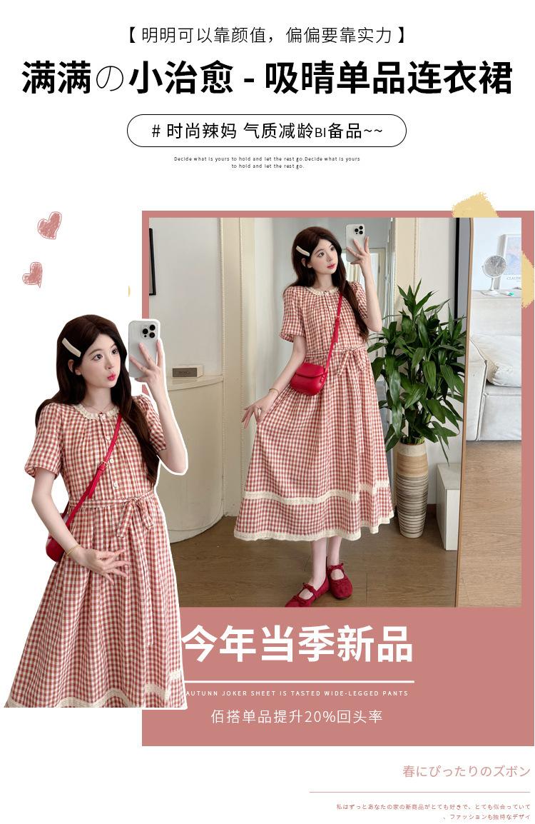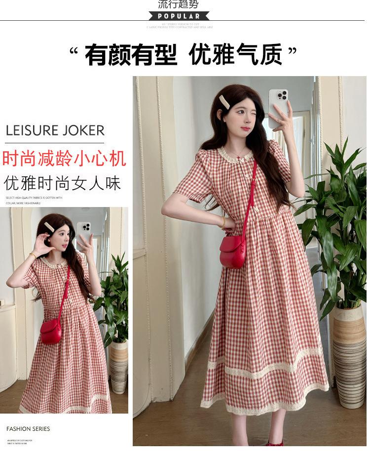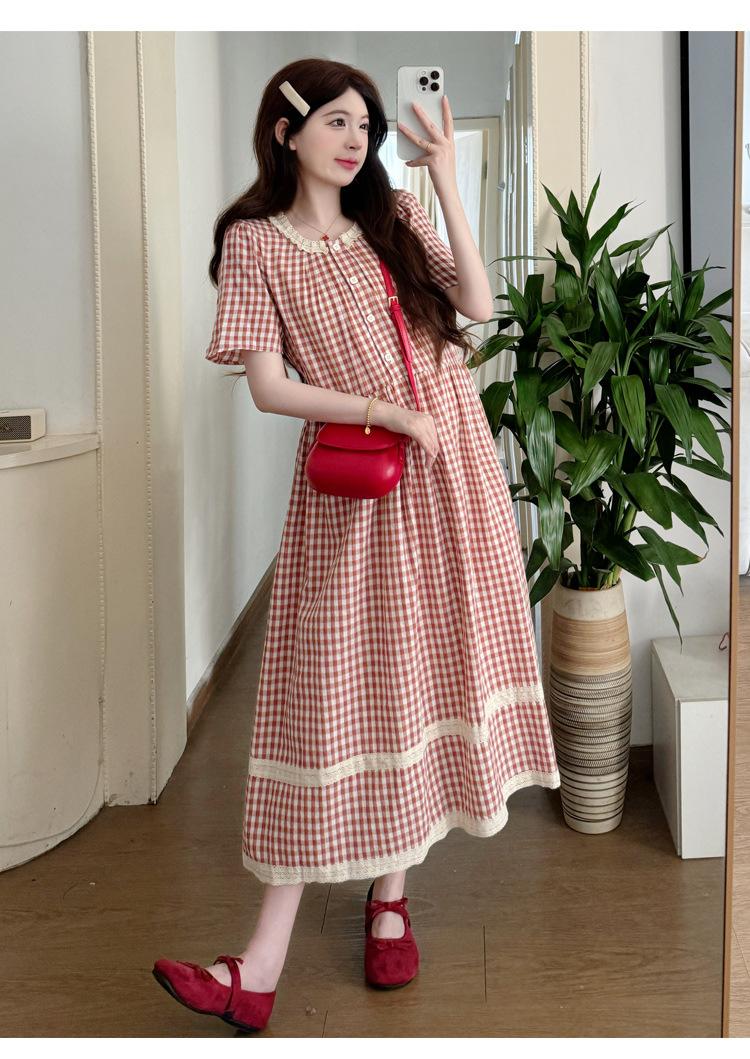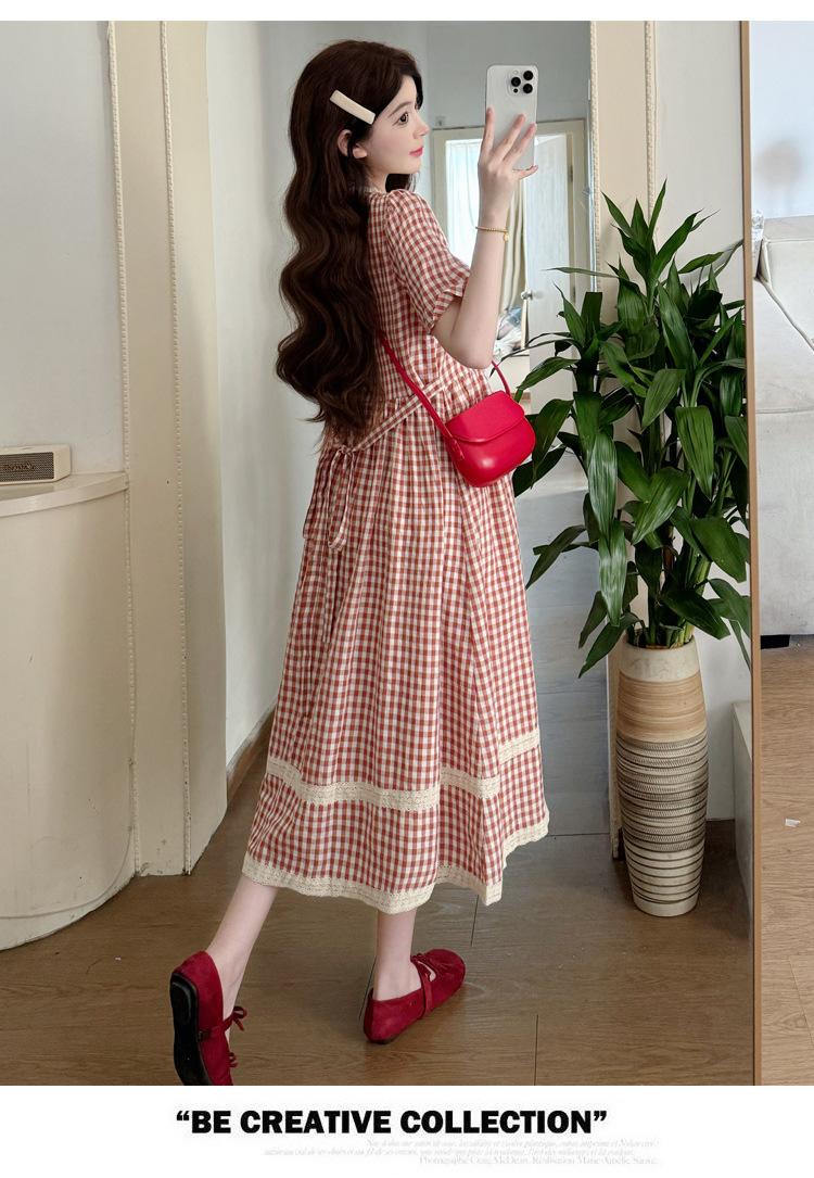 Maternidad 2025 Verano Nuevo Dulce Reductor de Edad Cuadros Rojos Encaje Suelto Talla Grande Vestido para Mujeres Embarazadas