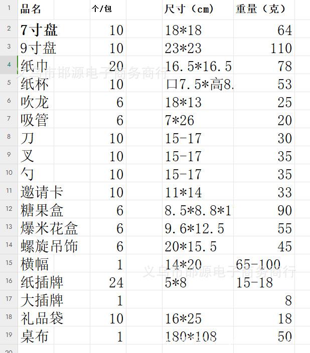7 inch disc 10pcs, 9 inch disc 10pcs, Flag 15pcs, Tablecloth 1pcs, Paper towel 20pcs, Paper cup 10pcs, Large c...