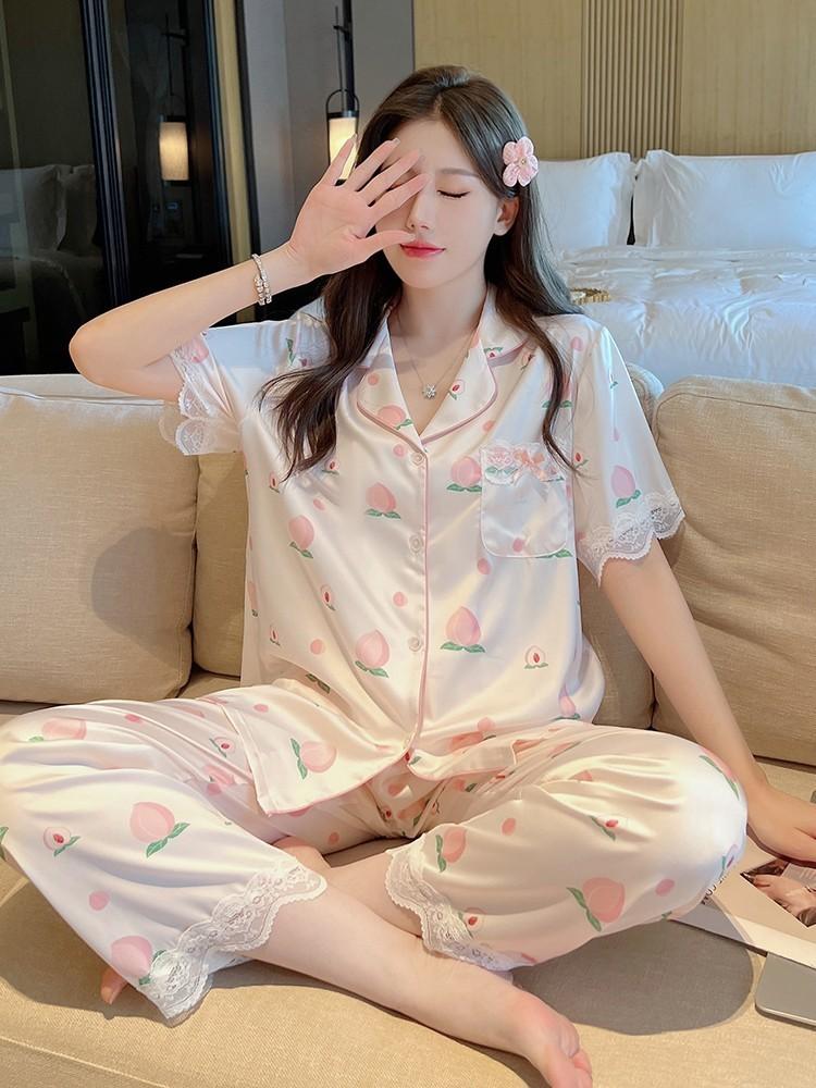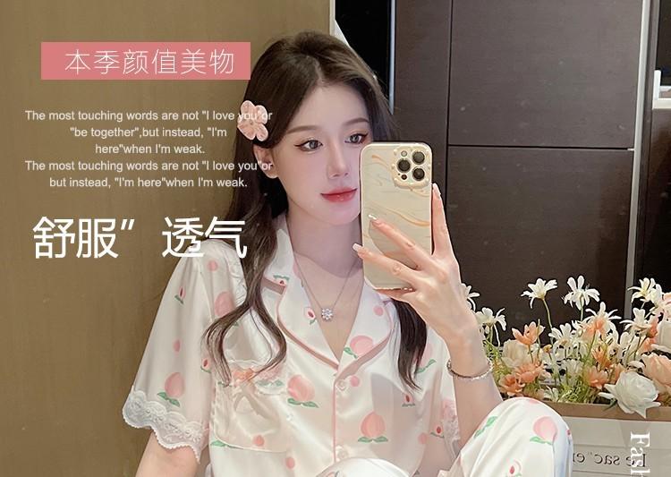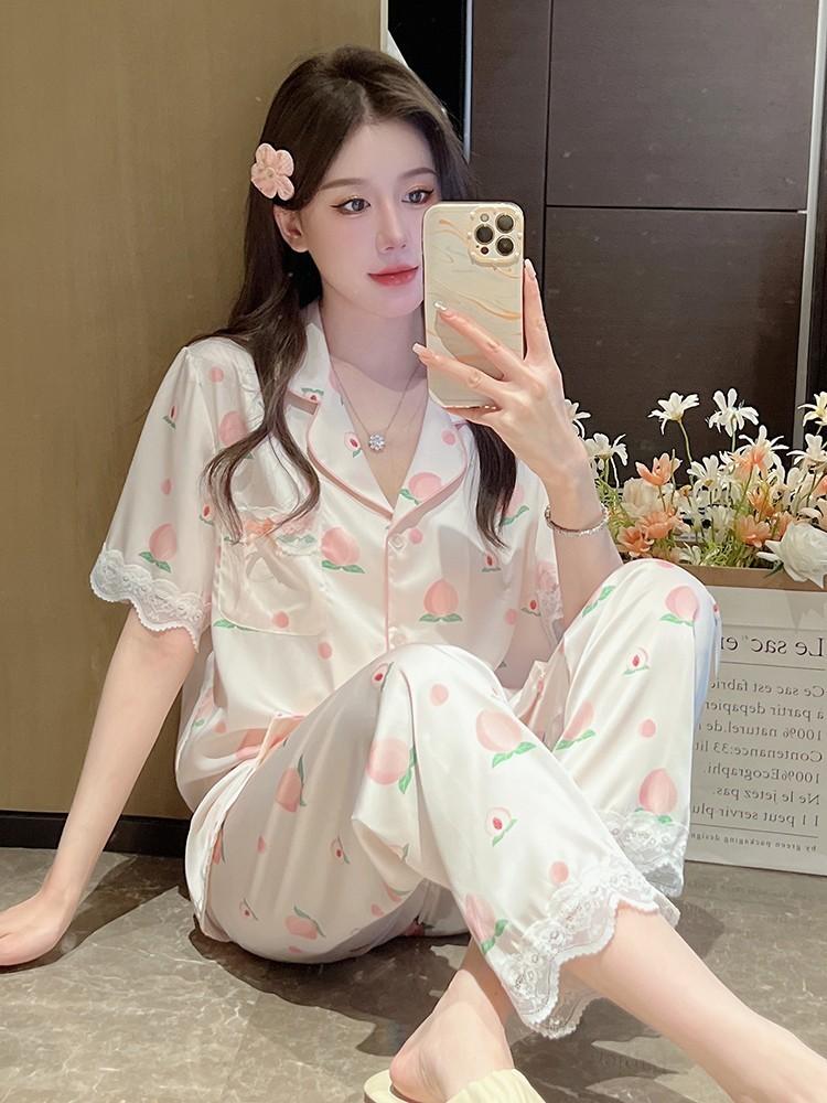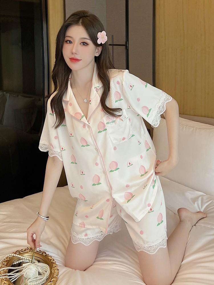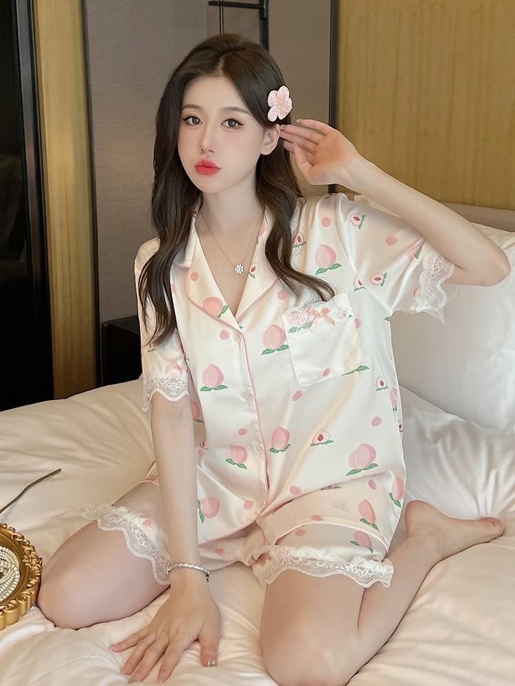 Pijama nuevo de verano de seda de hielo y encaje de melocotón dulce para mujer, pantalones cortos de verano de manga corta, se puede usar fuera, conjunto de ropa para el hogar