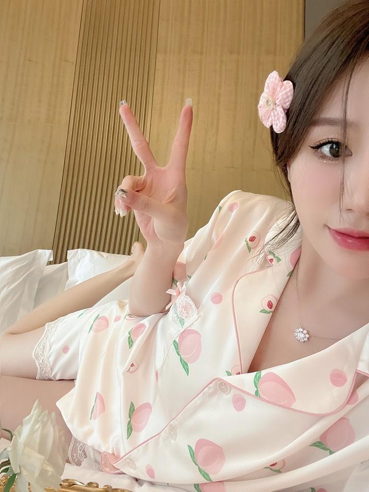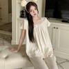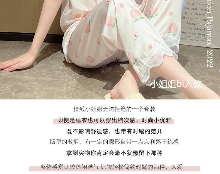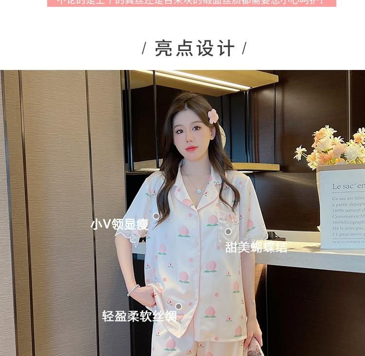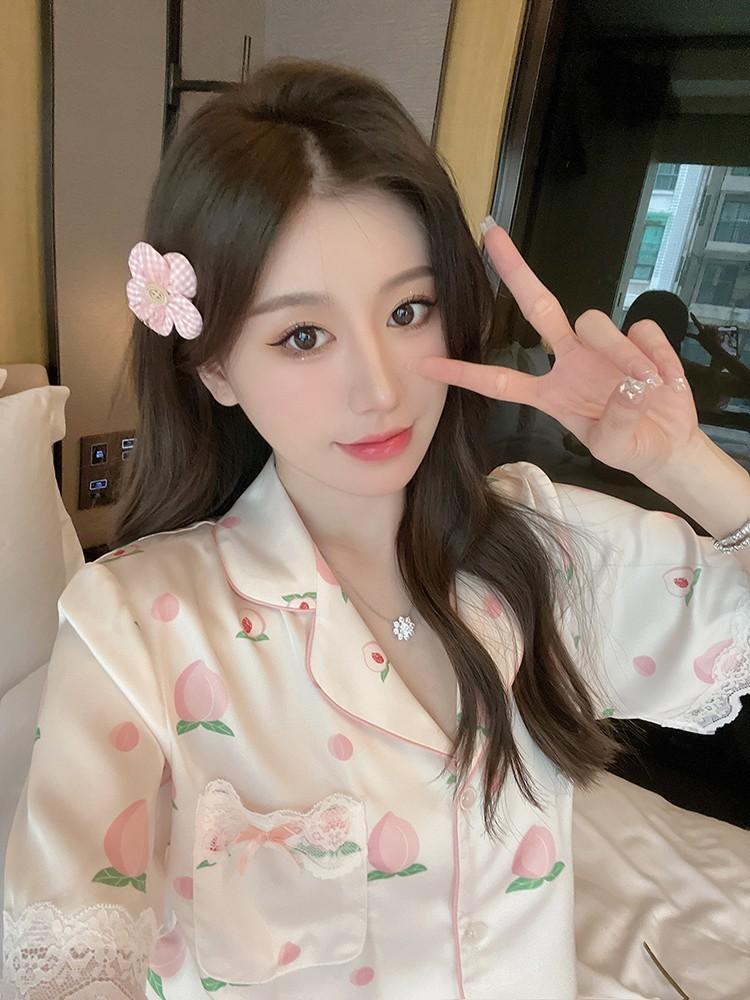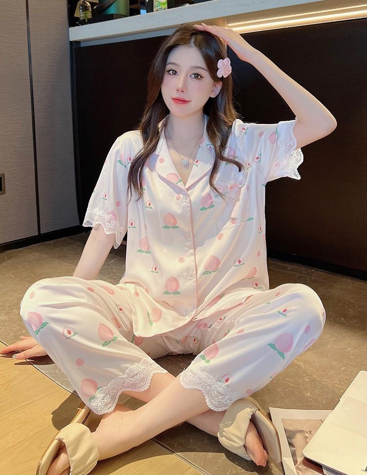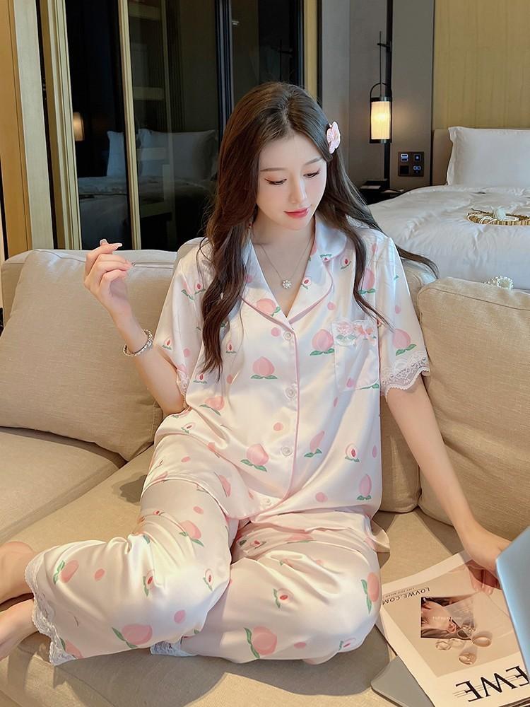 Pijama nuevo de verano de seda de hielo y encaje de melocotón dulce para mujer, pantalones cortos de verano de manga corta, se puede usar fuera, conjunto de ropa para el hogar