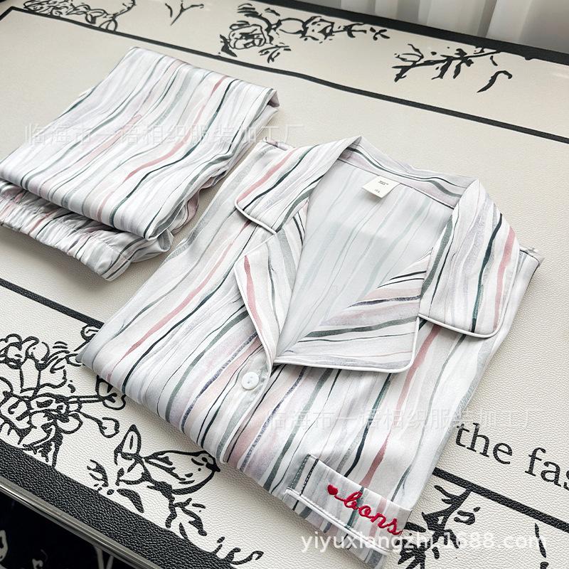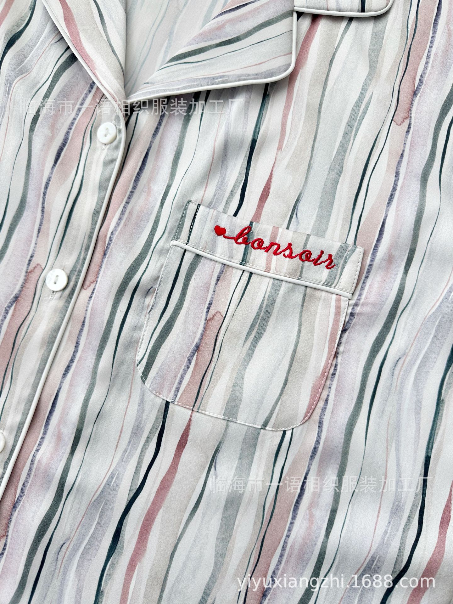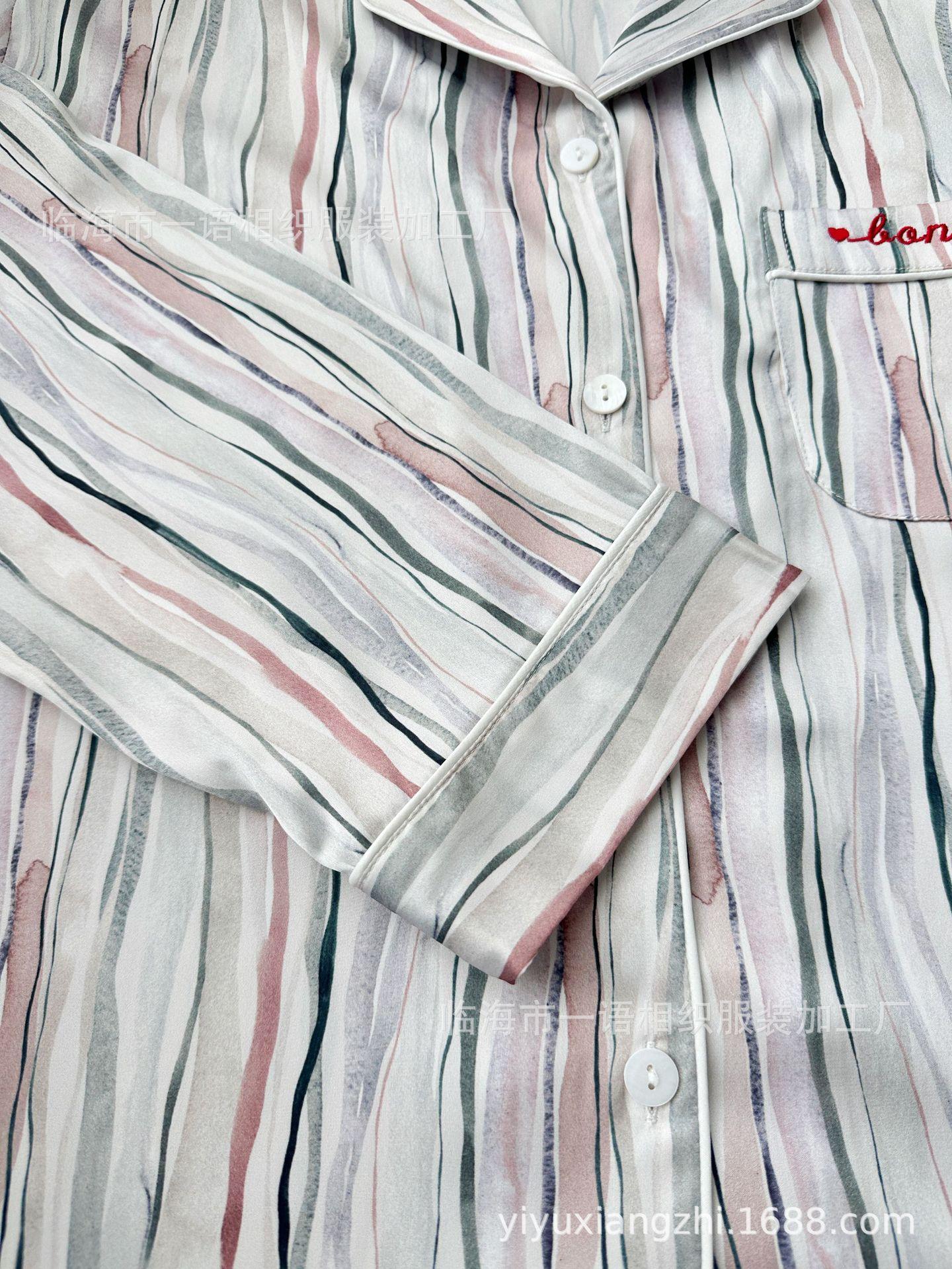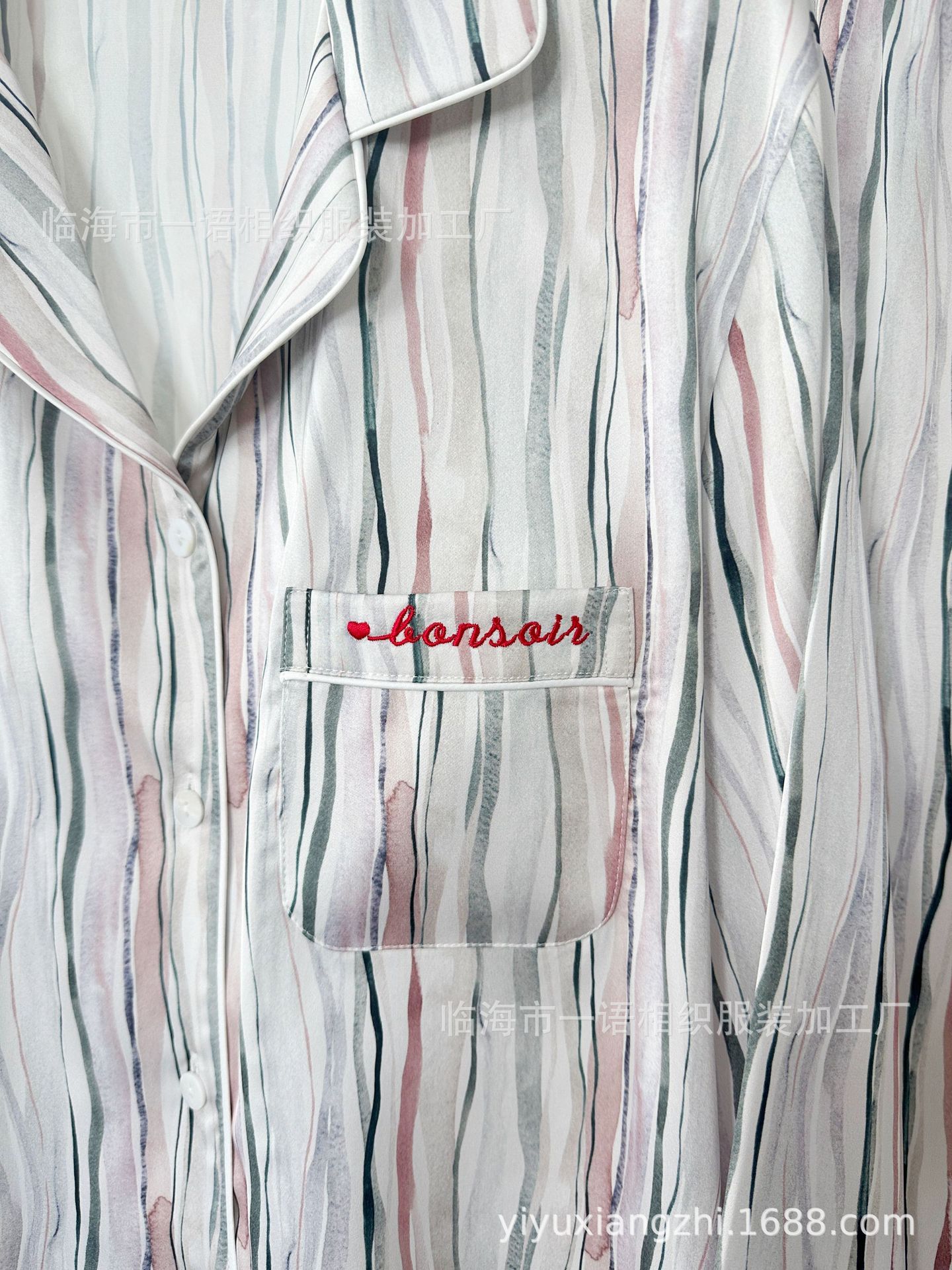 2025 Otoño Acuarela Raya Bordado Pijama Seda de Hielo para Mujer Solapa Delgado Damas Conjunto de Ropa para el Hogar Una Pieza Venta al por Mayor
