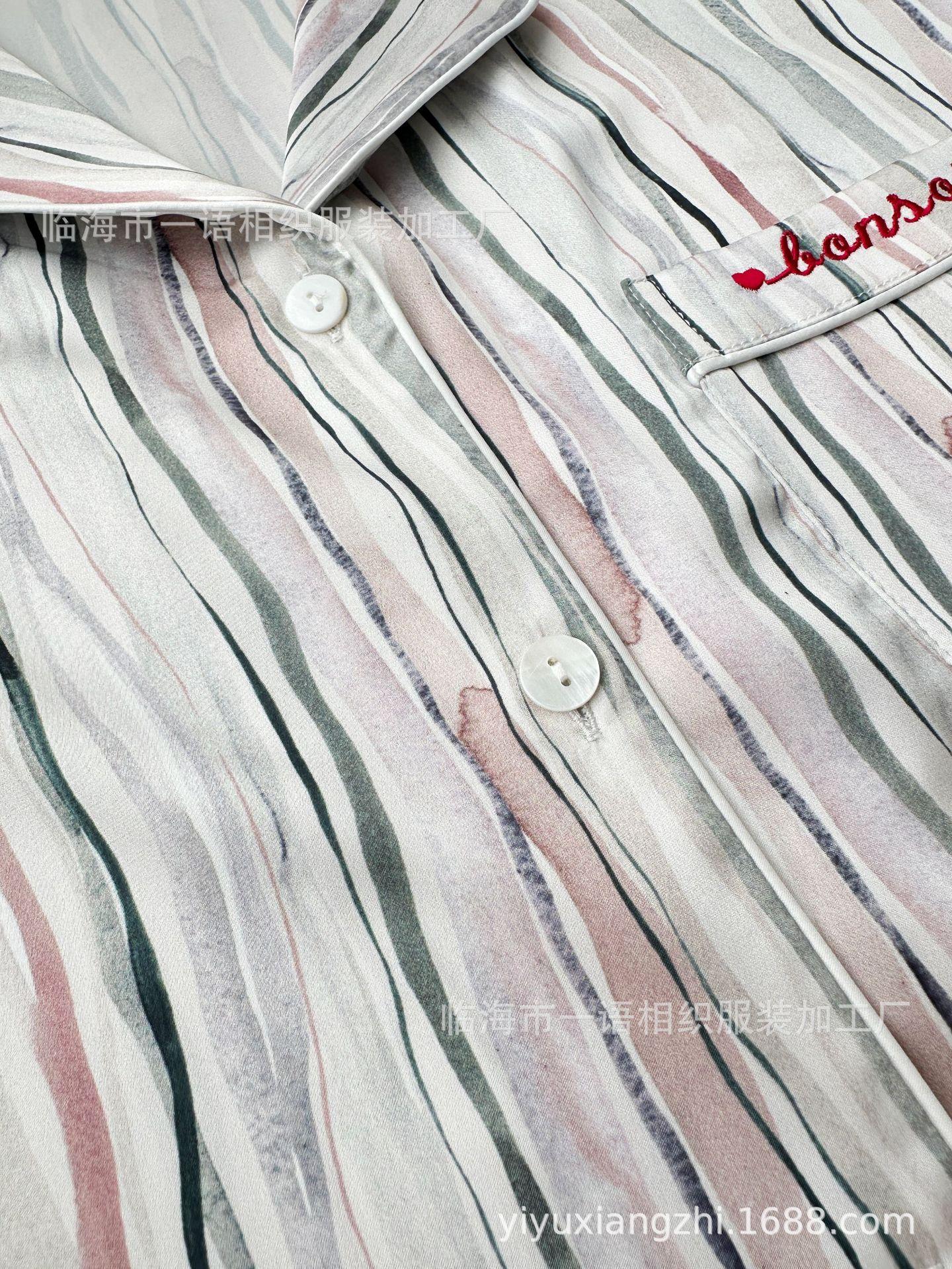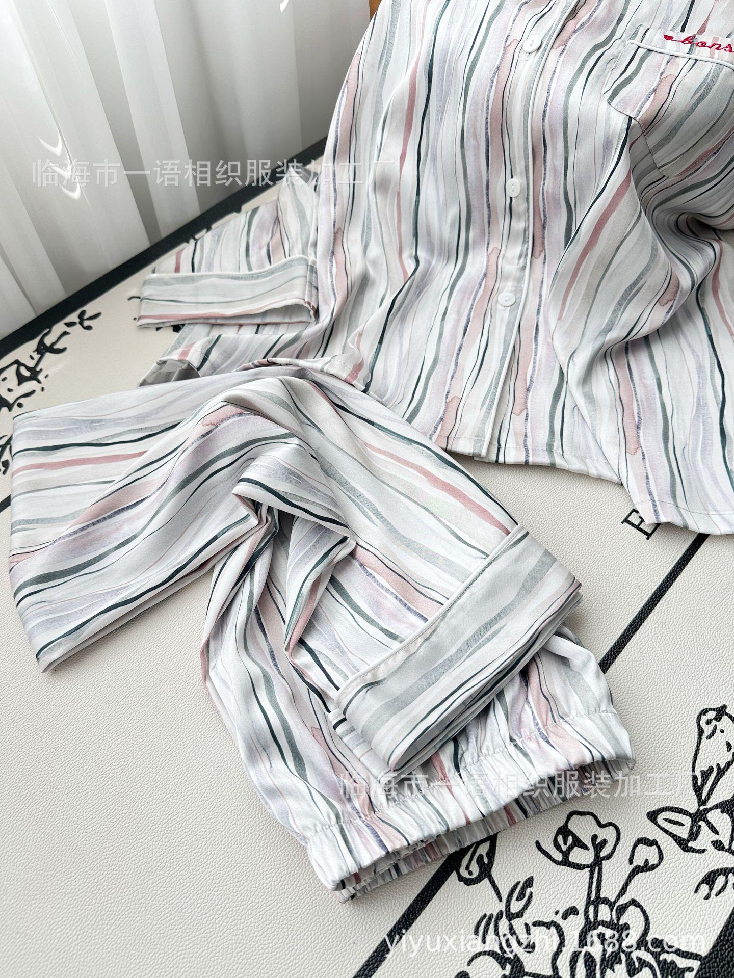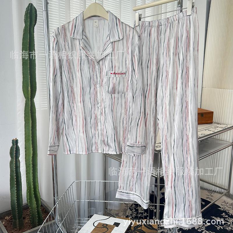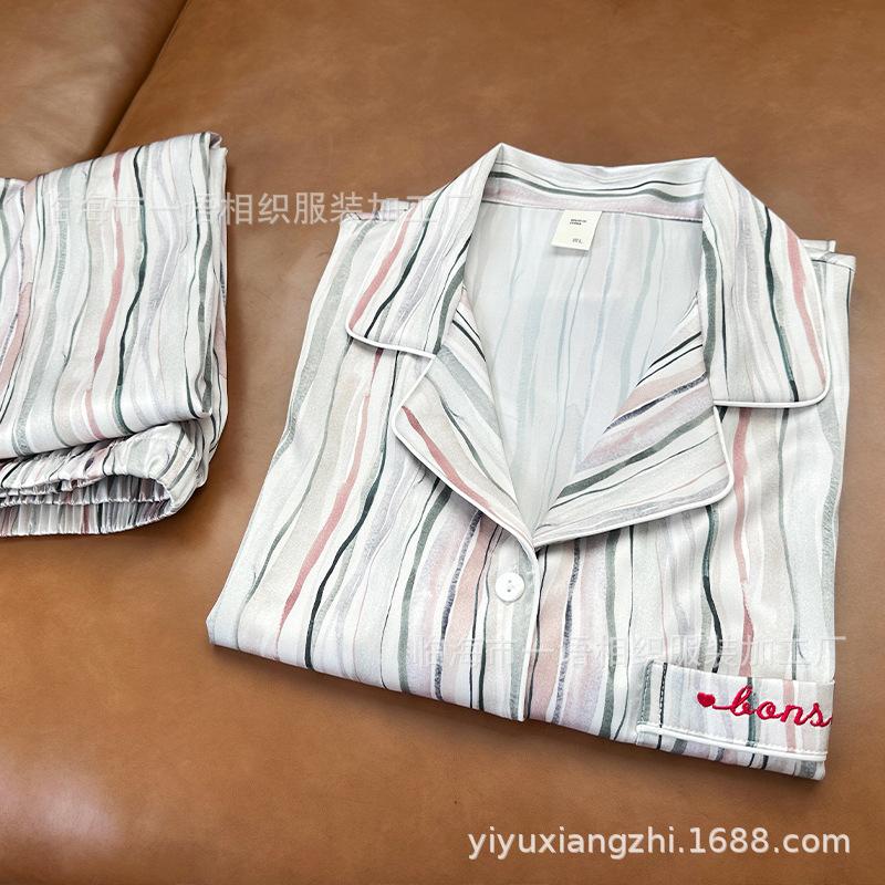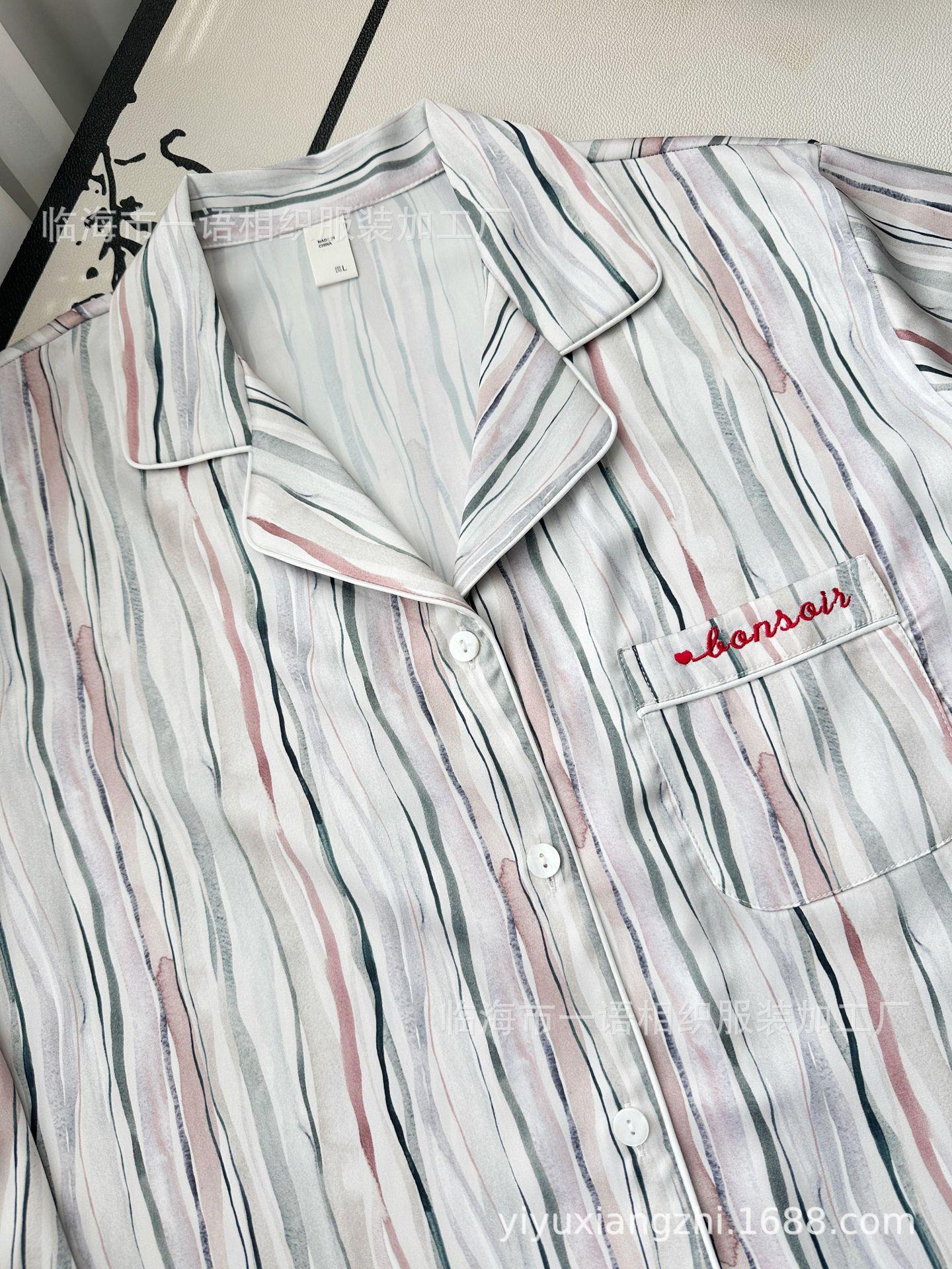2025 Otoño Acuarela Raya Bordado Pijama Seda de Hielo para Mujer Solapa Delgado Damas Conjunto de Ropa para el Hogar Una Pieza Venta al por Mayor
