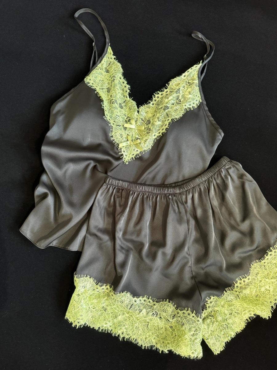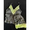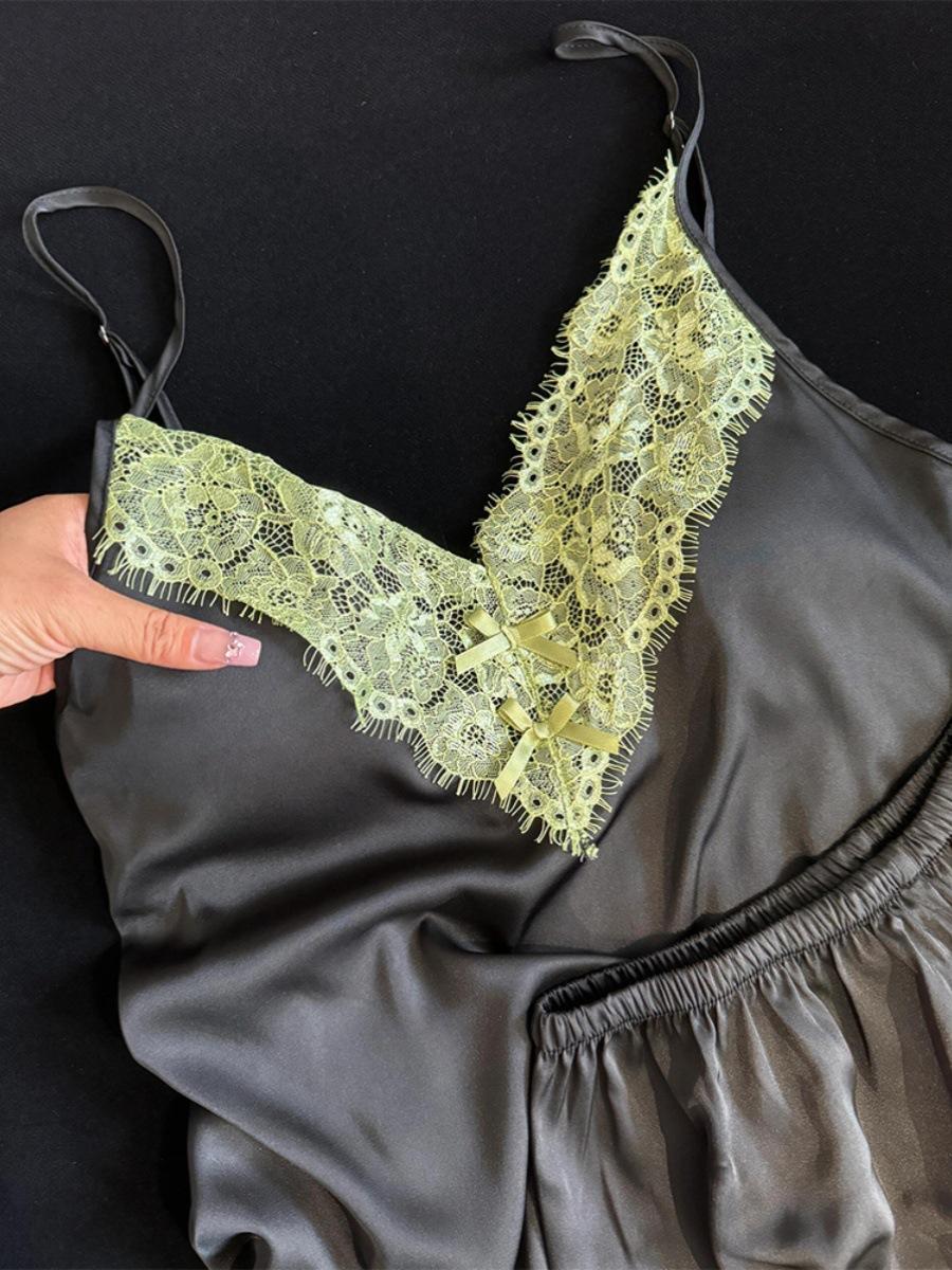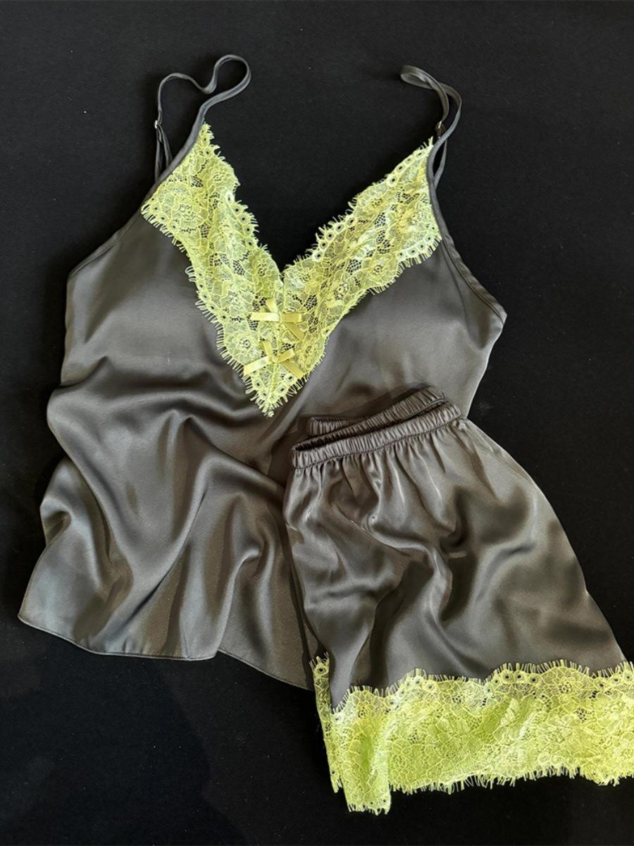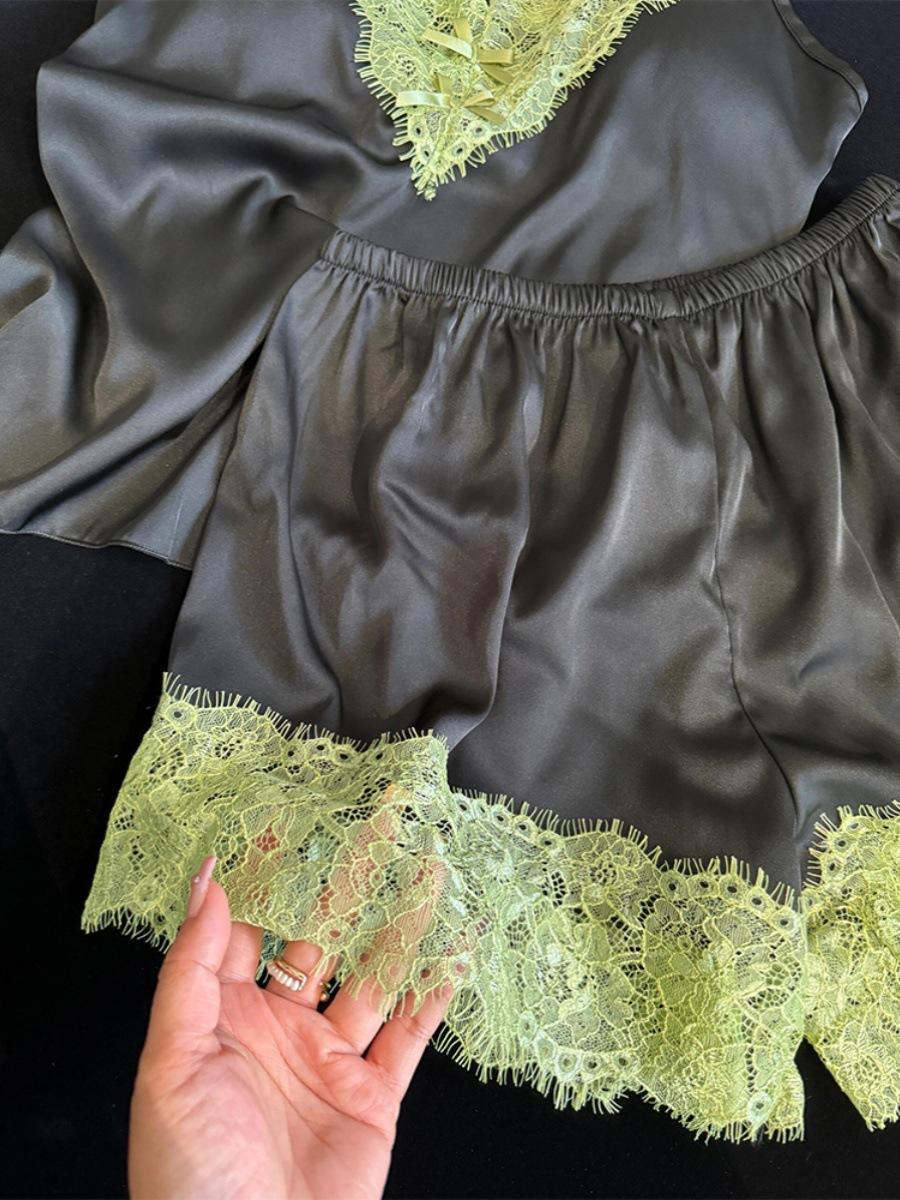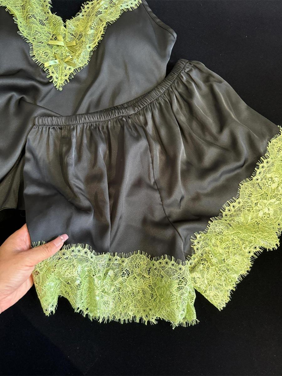 Pijama Camisola Encaje Cuello V Deseo Puro Niña Verano Sexy Seda de Hielo Talla Grande Shorts Conjunto para Estar en Casa de Mujer