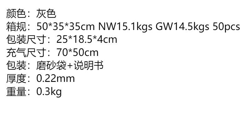 70*50cm, weight 340g, packaging size 25*18.5*4cm, thickness 0.22mm