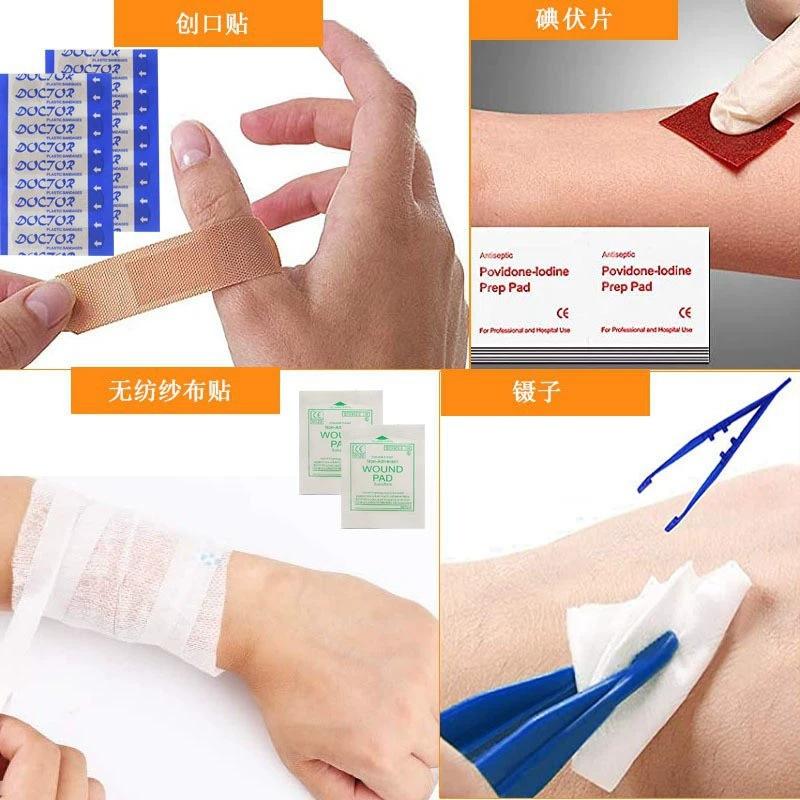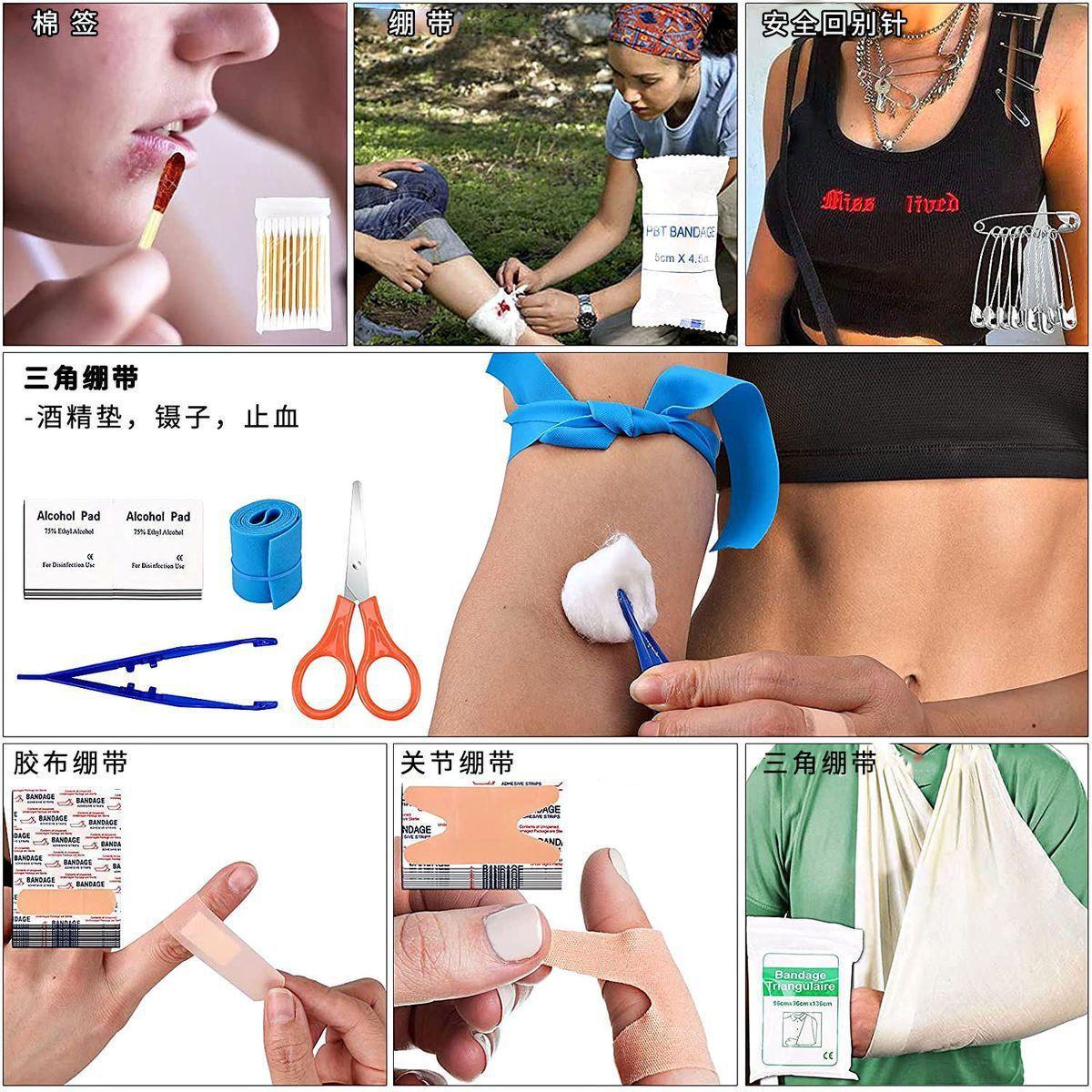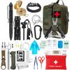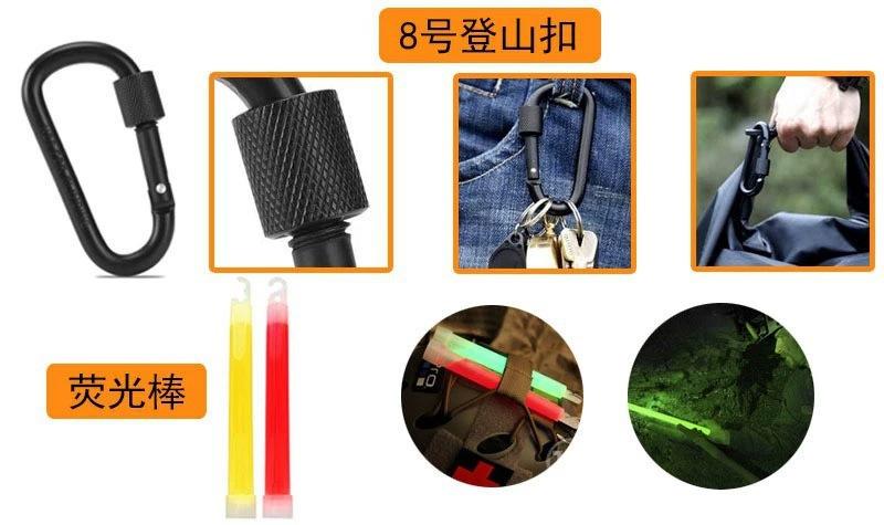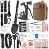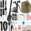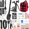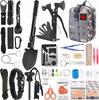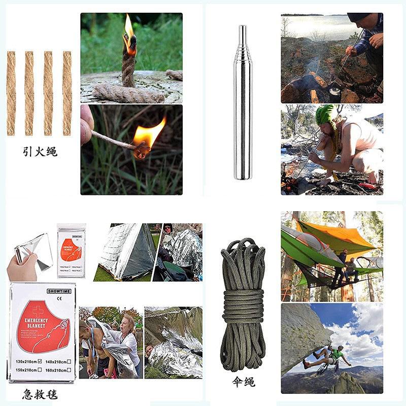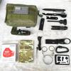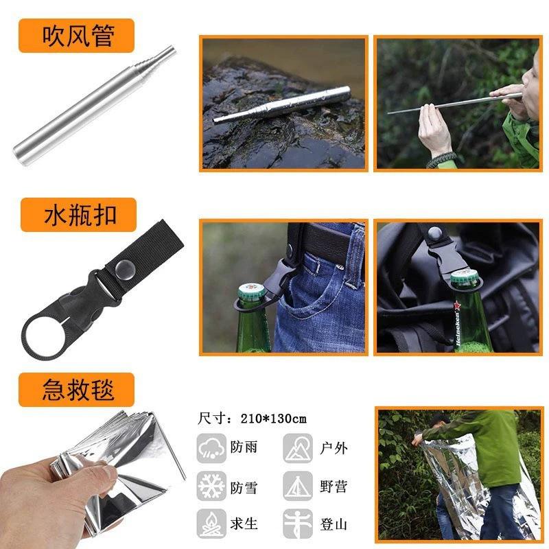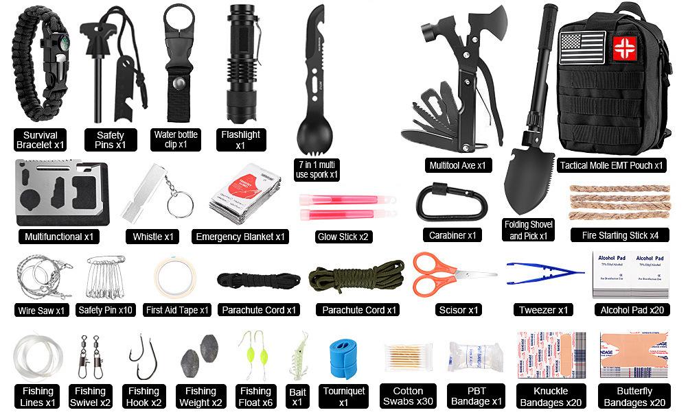 Hebilla para botella de agua*1, linterna*1, cuchara multifuncional*1, mosquetón*1, pala plegable*1, hacha multifuncional*1, tarjeta de herramientas*1, soplador de fuego*1, sierra de alambre*1, paracord*1, iniciador de fuego*1, silbato*1, barras luminosas*2, yesca*4, pinzas*1, cinta adhesiva*1, hisopos de algodón*1, imperdibles*10, bolsa de pesca*1, tijeras*1, torniquete azul*1, vendaje*1, manta de supervivencia*1, toallitas con alcohol*20, vendajes adhesivos*20, vendajes adhesivos en forma de H*20, bolsa táctica