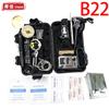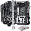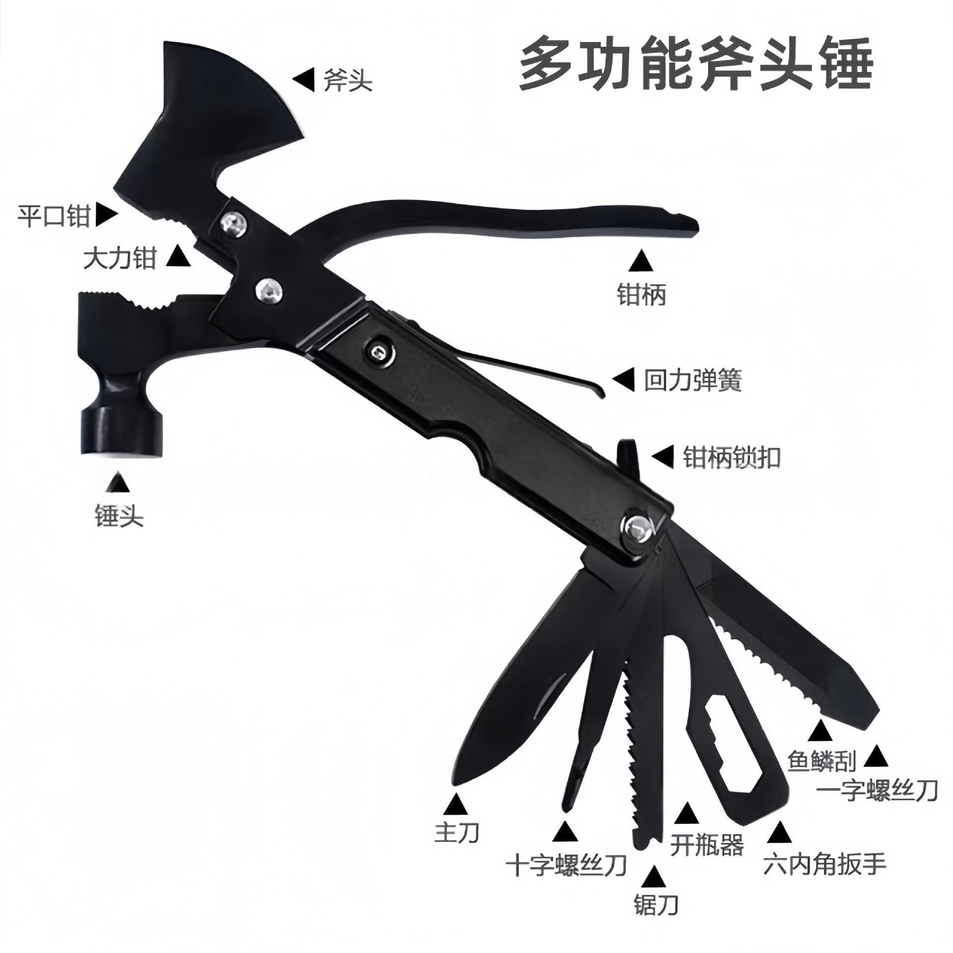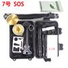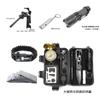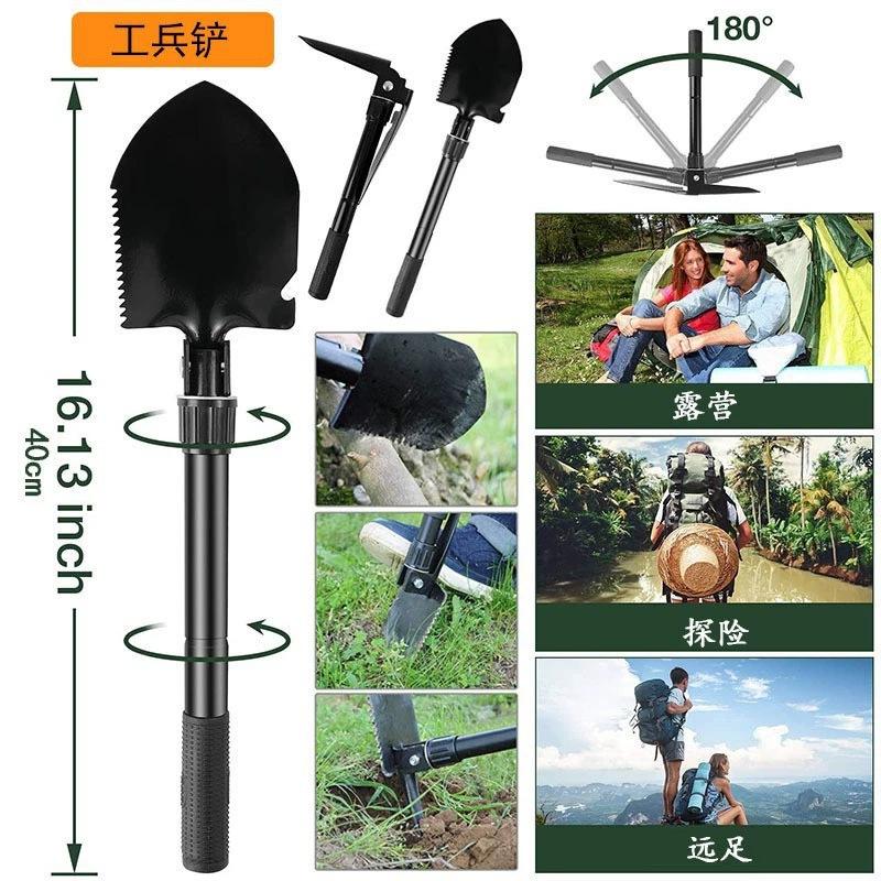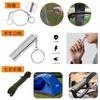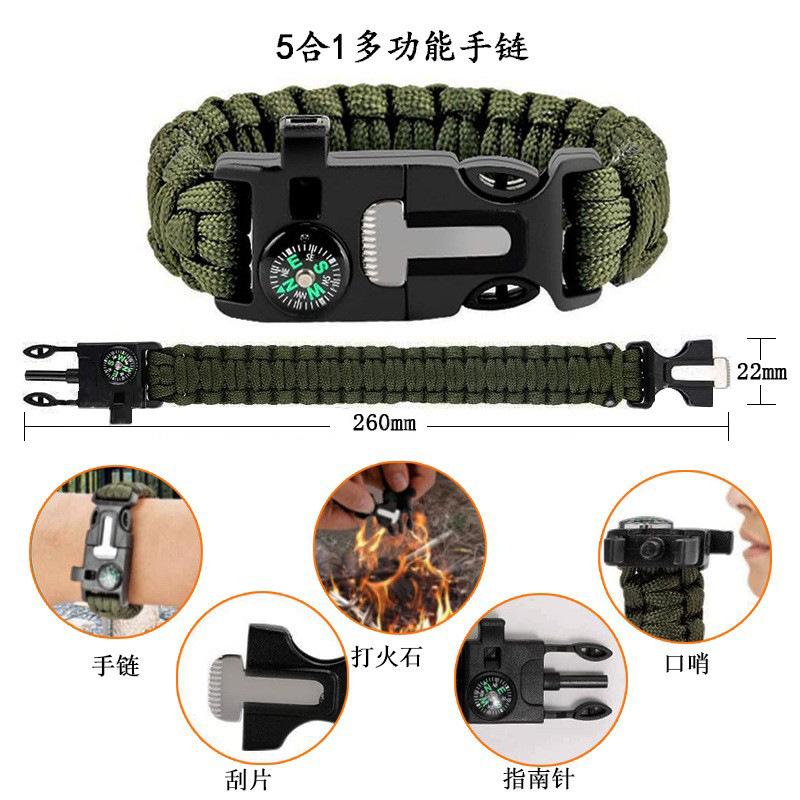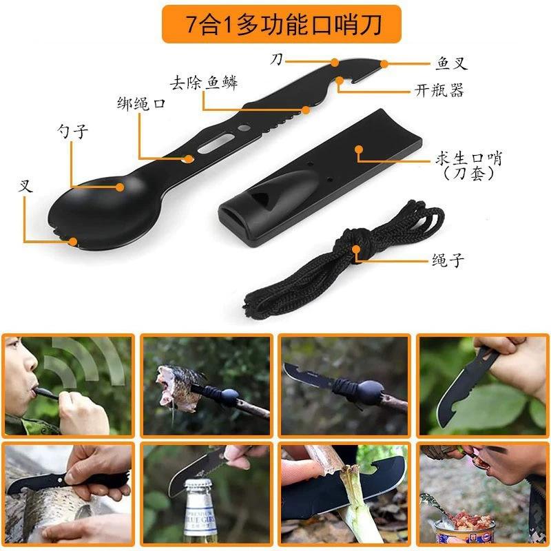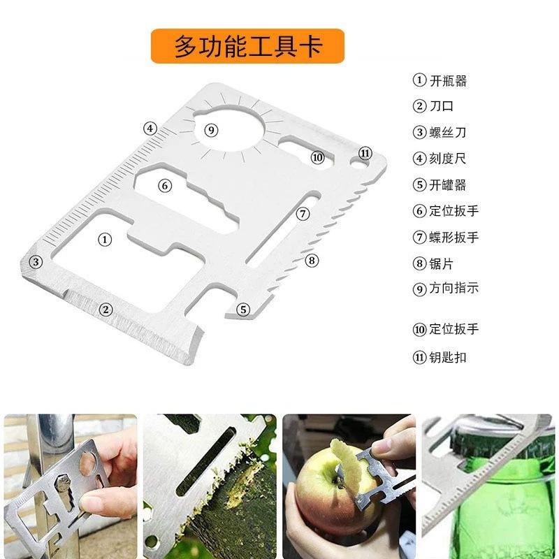 Hebilla para botella de agua*1, linterna*1, cuchara multifuncional*1, mosquetón*1, pala plegable*1, hacha multifuncional*1, tarjeta de herramientas*1, soplador de fuego*1, sierra de alambre*1, paracord*1, iniciador de fuego*1, silbato*1, barras luminosas*2, yesca*4, pinzas*1, cinta adhesiva*1, hisopos de algodón*1, imperdibles*10, bolsa de pesca*1, tijeras*1, torniquete azul*1, vendaje*1, manta de supervivencia*1, toallitas con alcohol*20, vendajes adhesivos*20, vendajes adhesivos en forma de H*20, bolsa táctica
