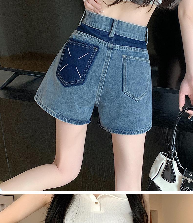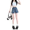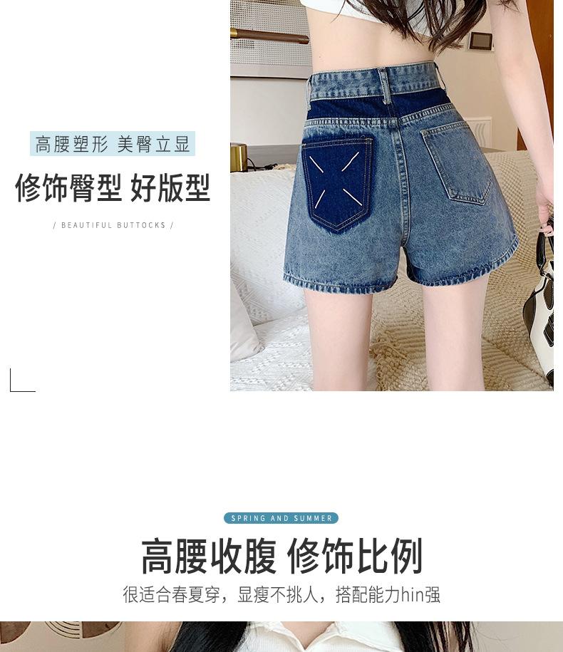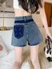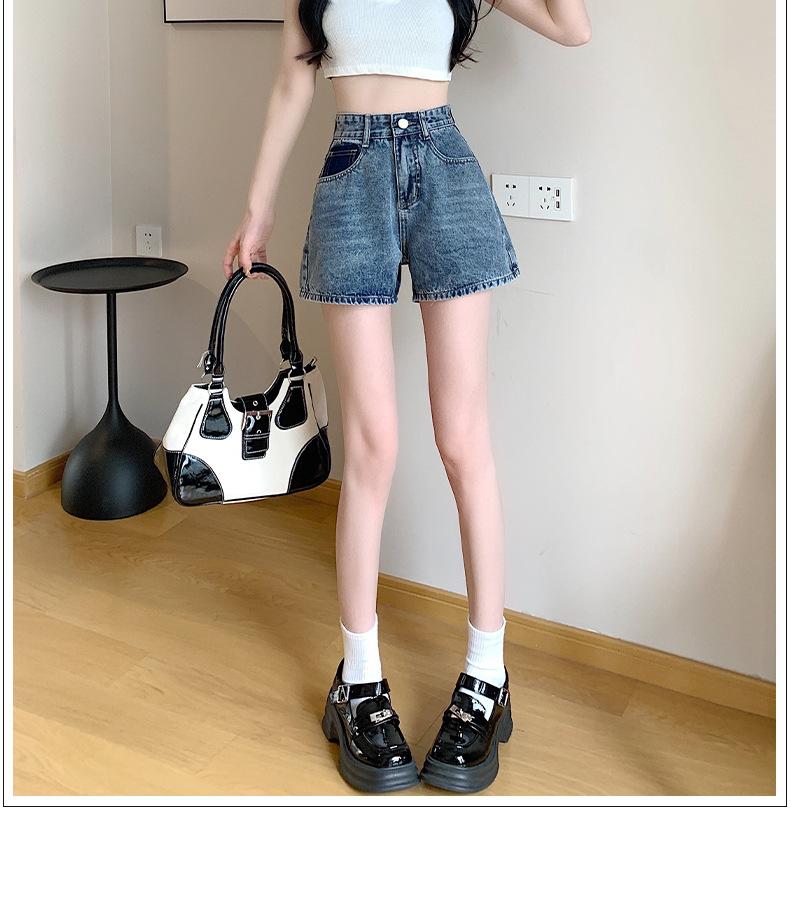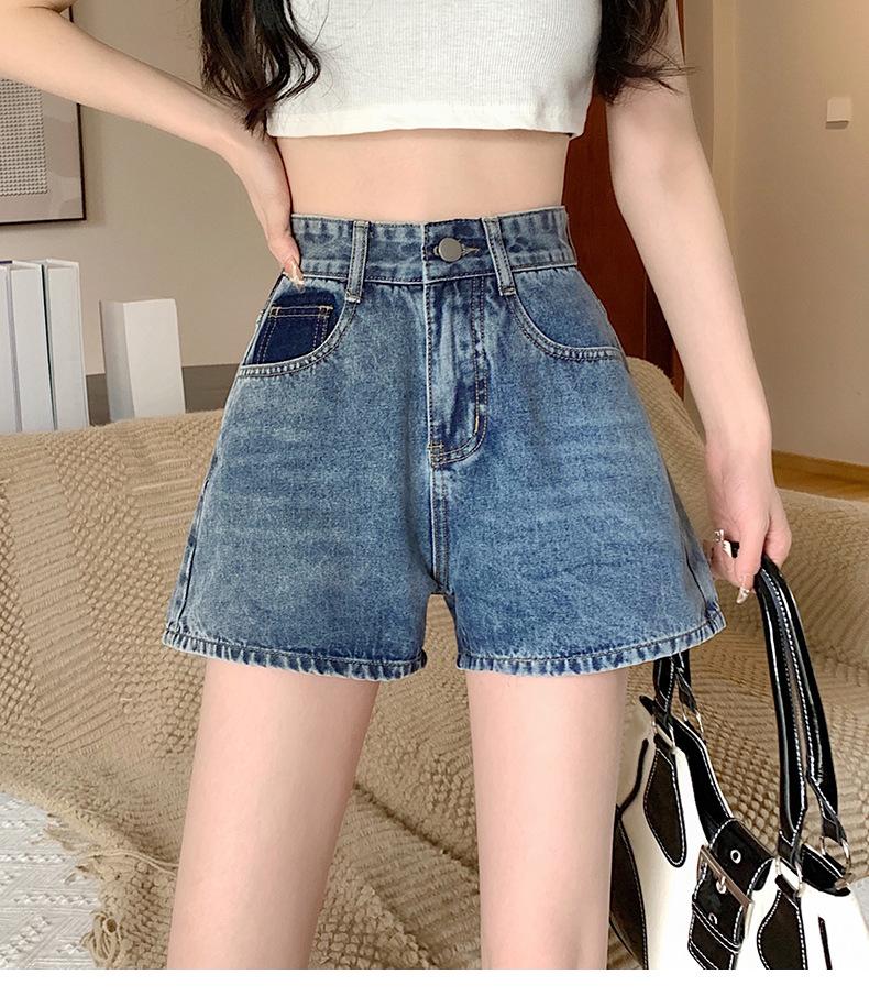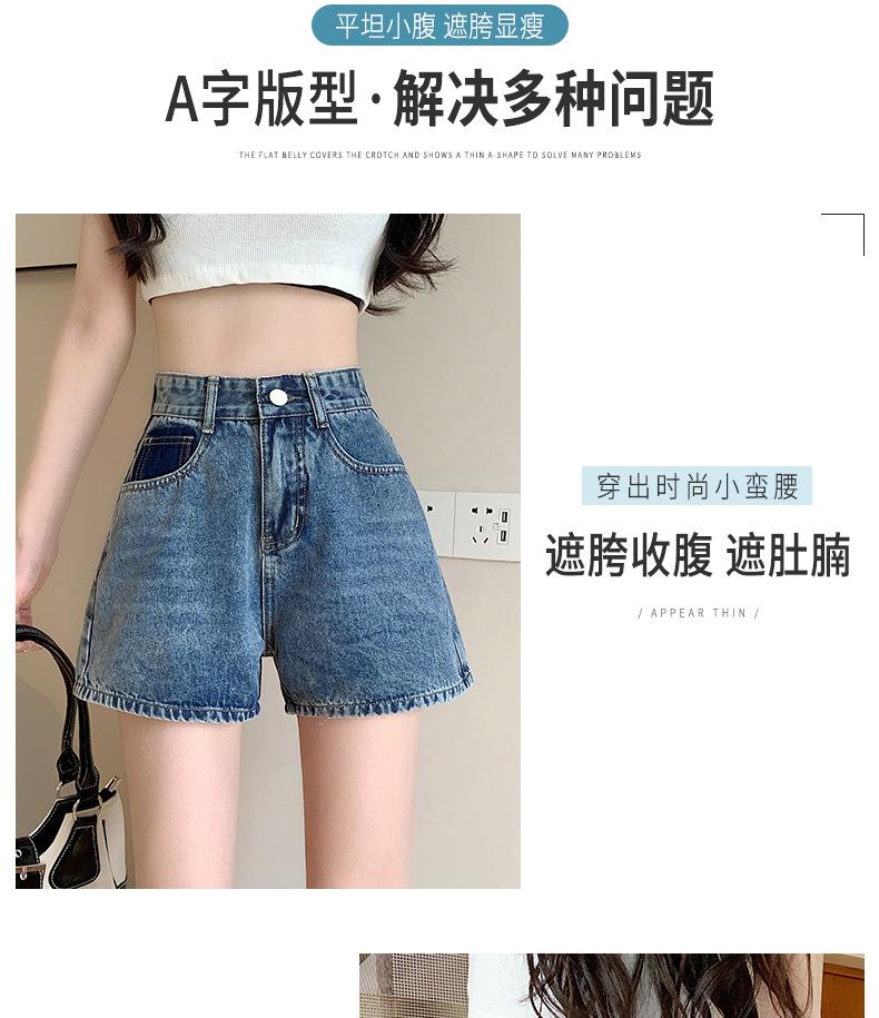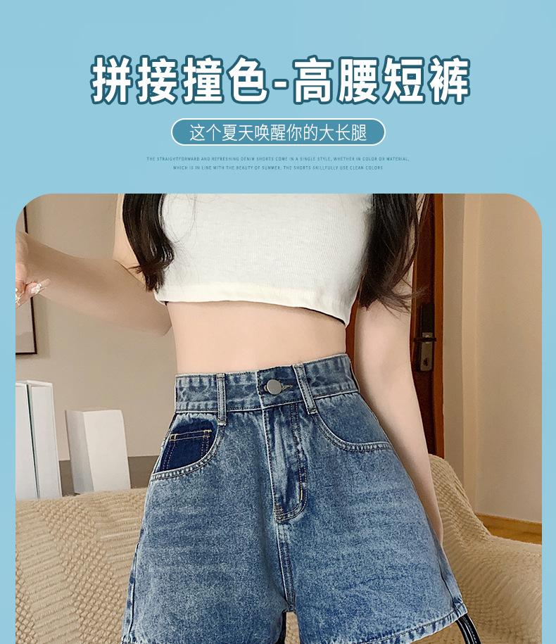Shorts de mezclilla retro de color contrastante para niñas, verano nuevo, cintura alta, holgados, delgados, línea A, a la moda, pierna ancha, pantalones cortos, ins trendy