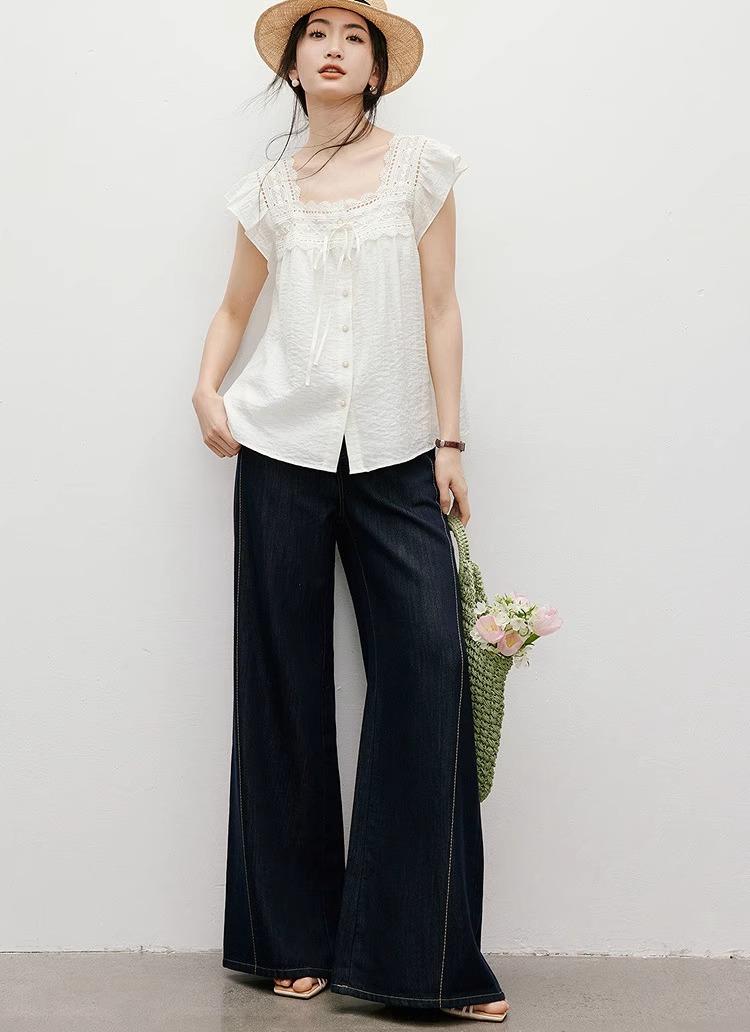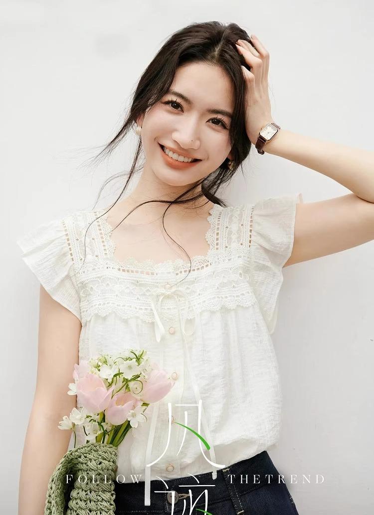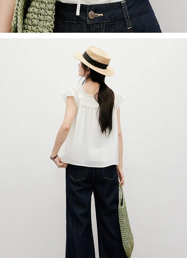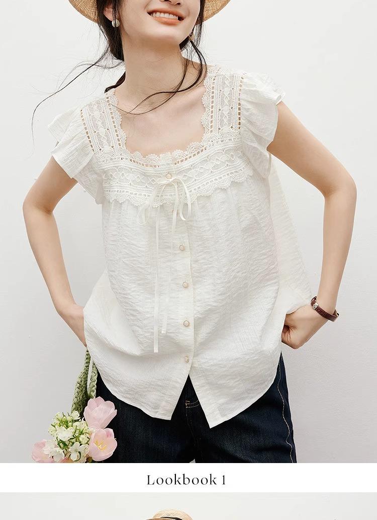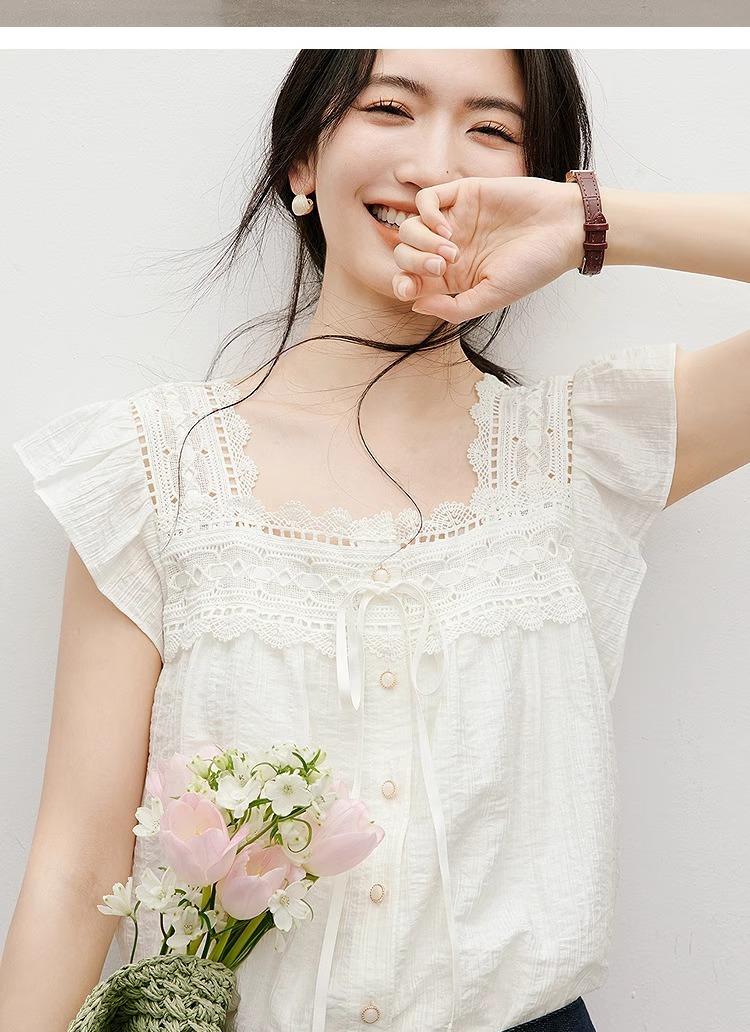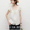 Camisa Estilo Perezoso 2025 Verano Nuevo Encaje para Mujer Manga Corta de Encaje Cuello Cuadrado Top sin Mangas