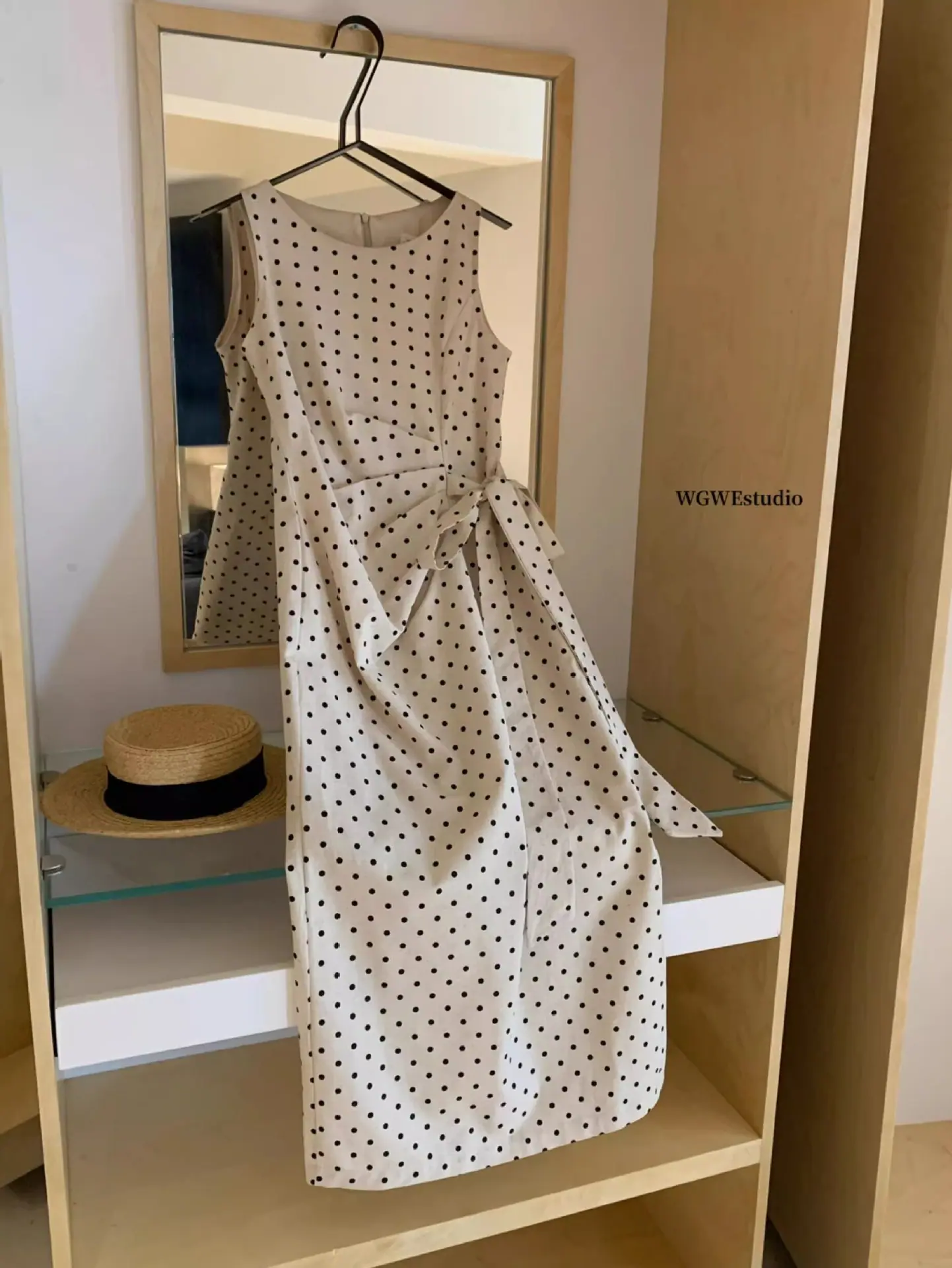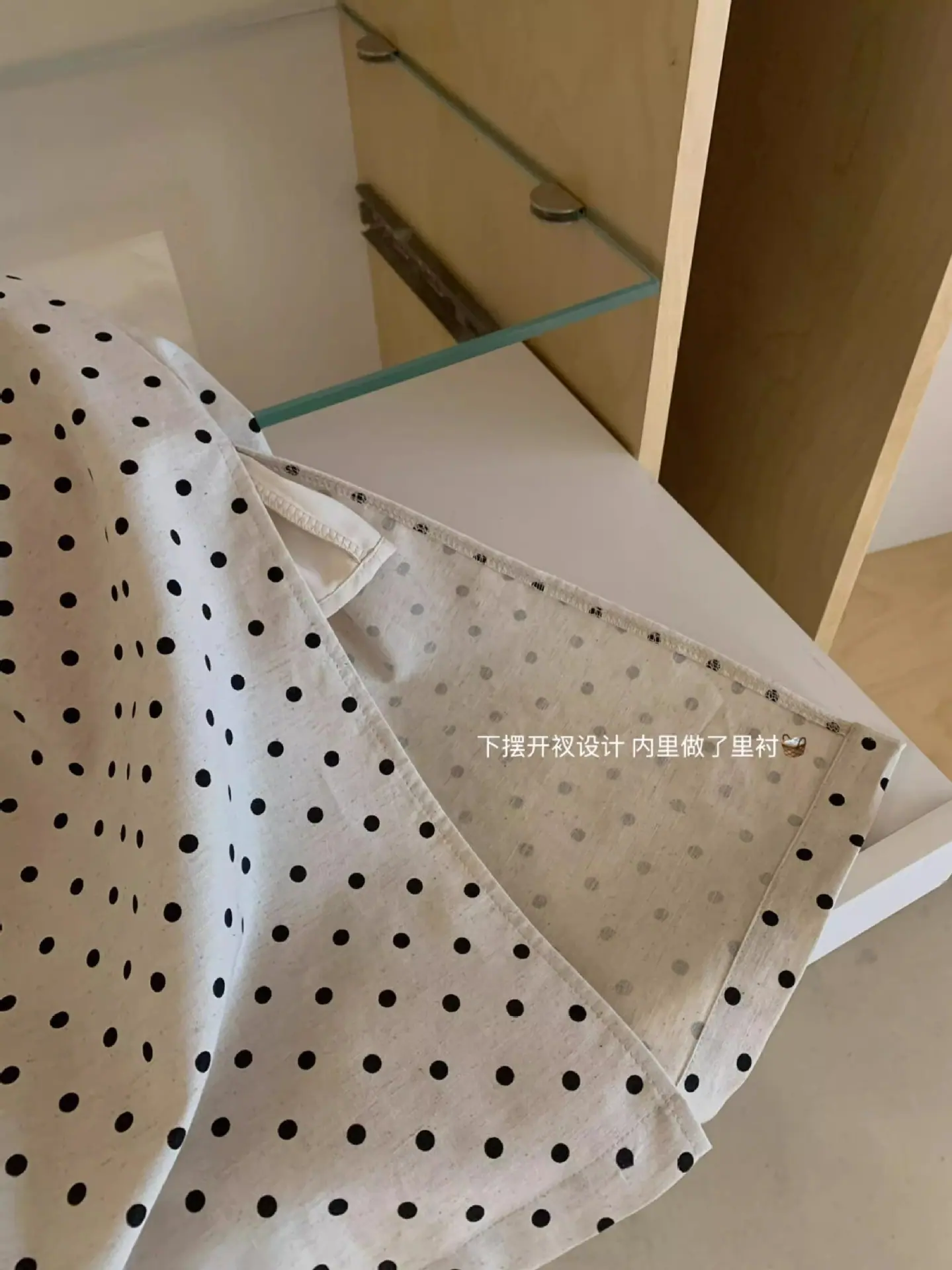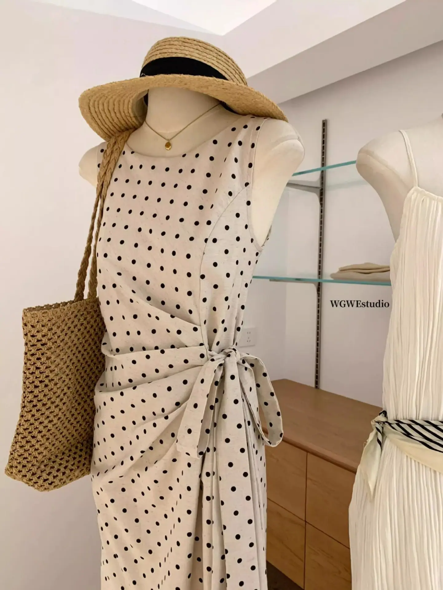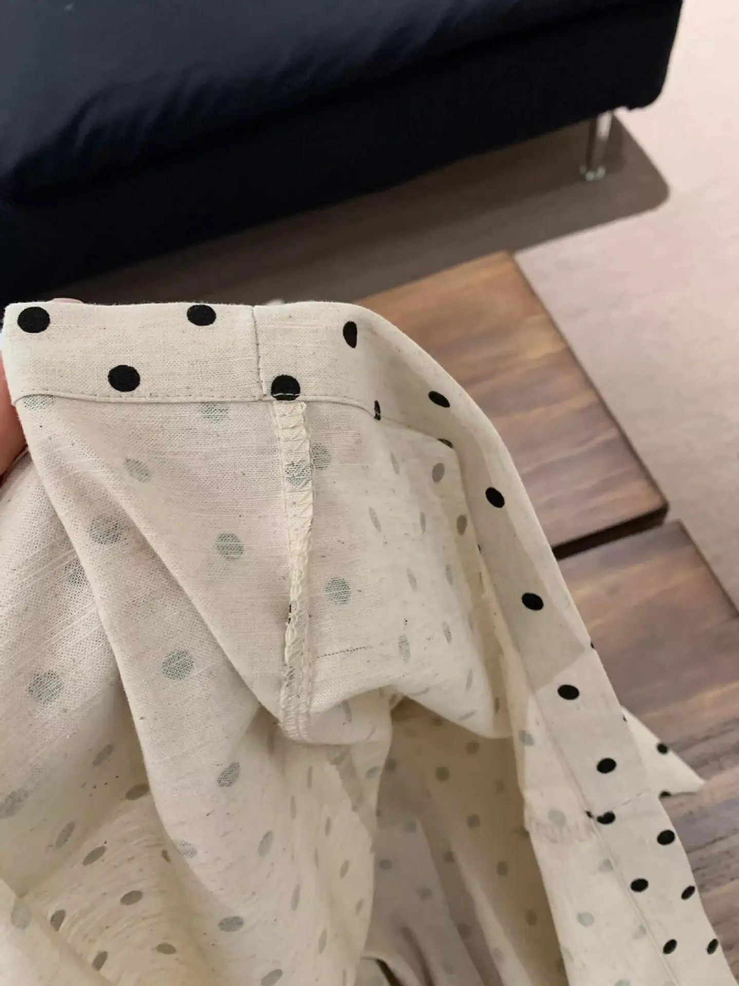 Liquidación, Sin Devoluciones ni Cambios, Vestido Largo de Lino-Algodón de Alta Gama Estilo Francés Pino Luna Elegante Lunares Cintura Entallada W6687