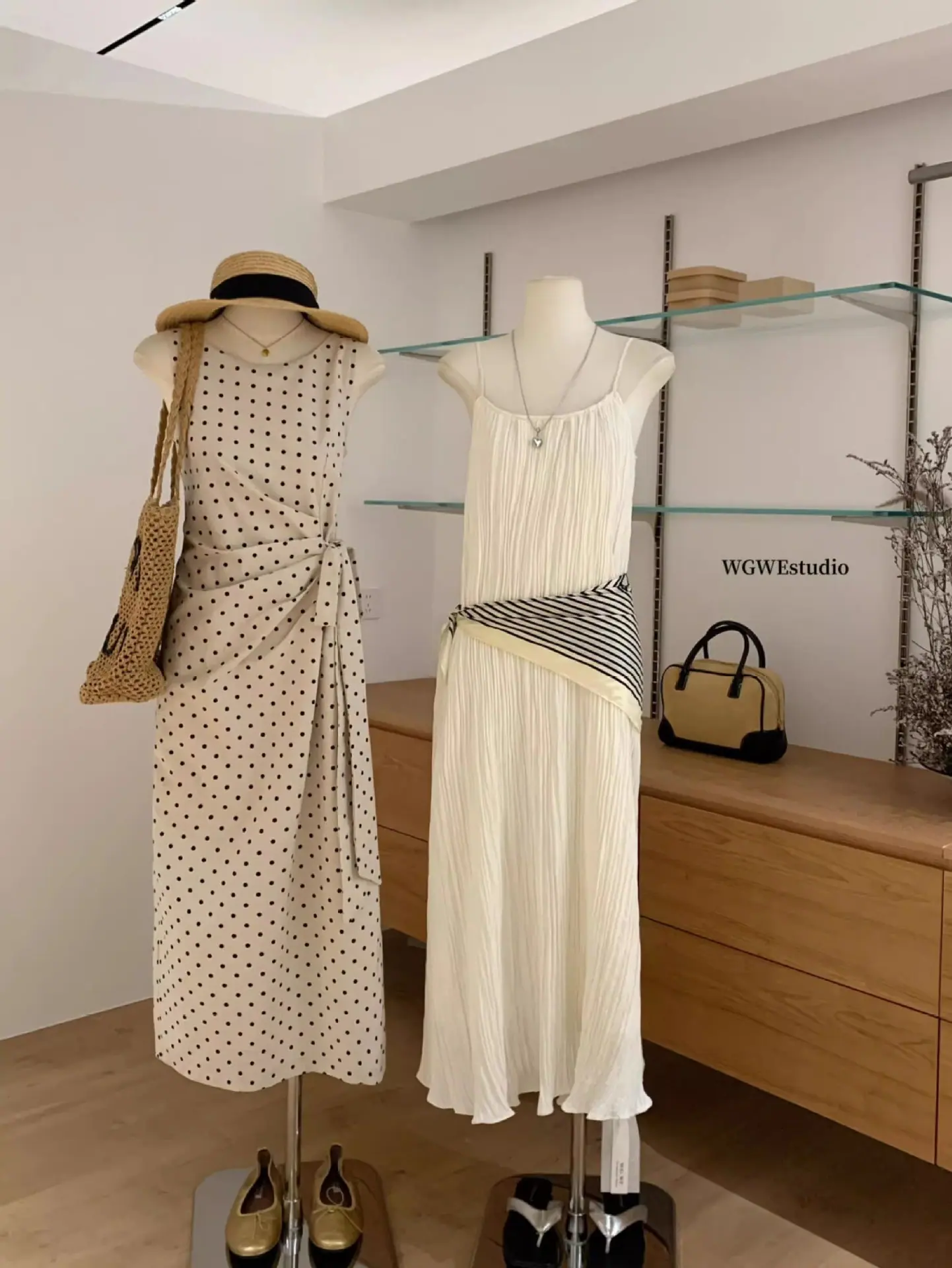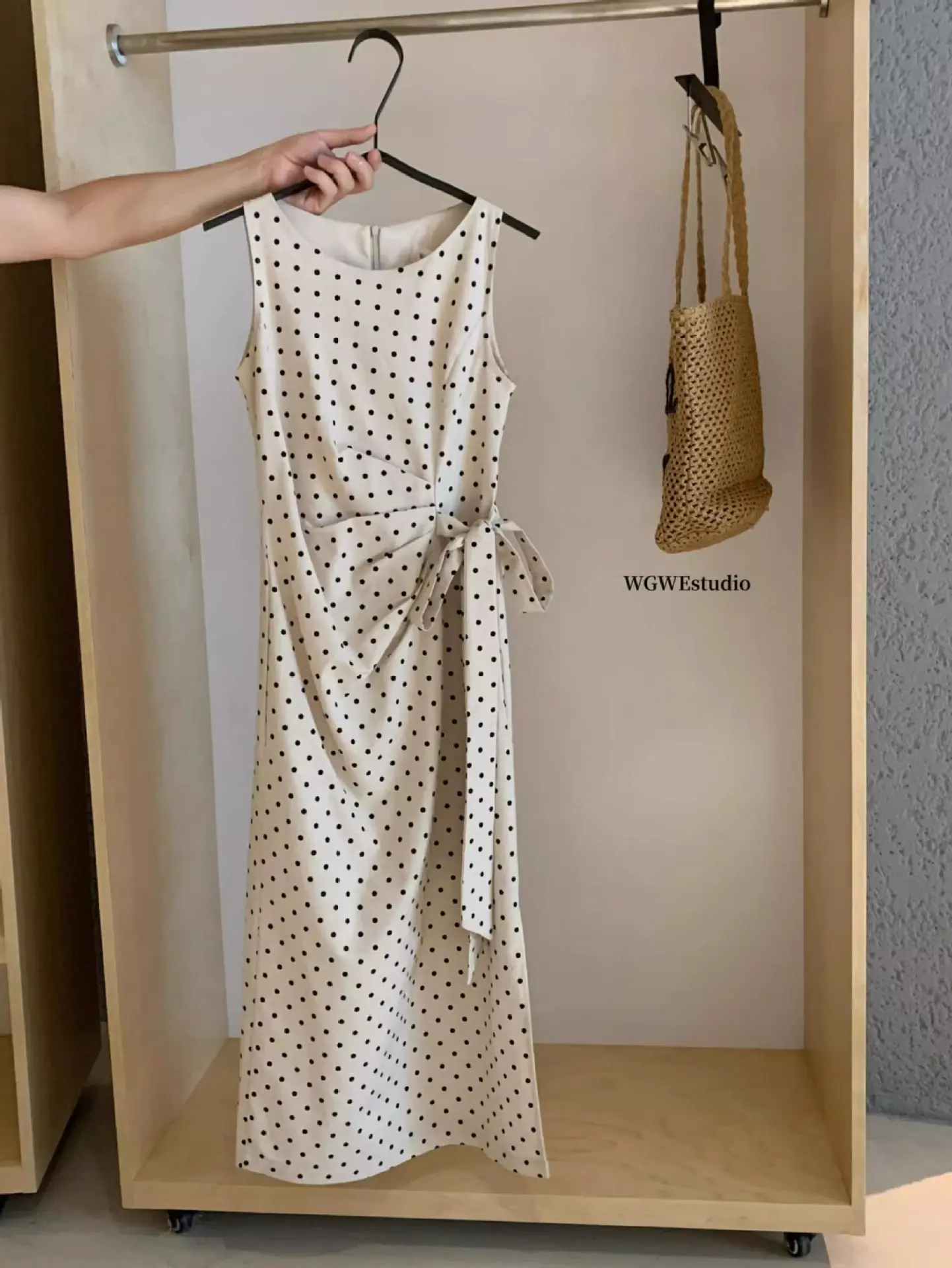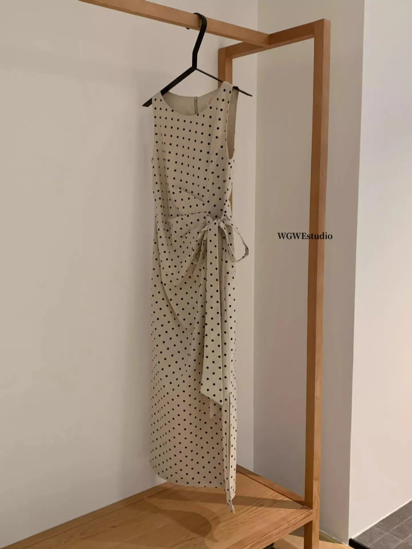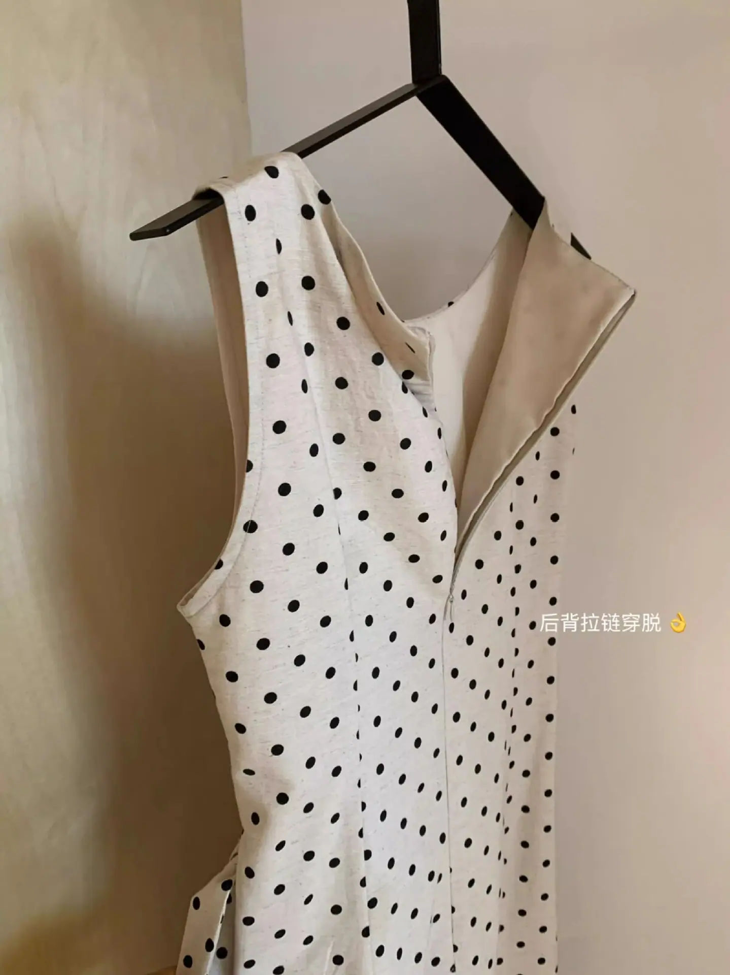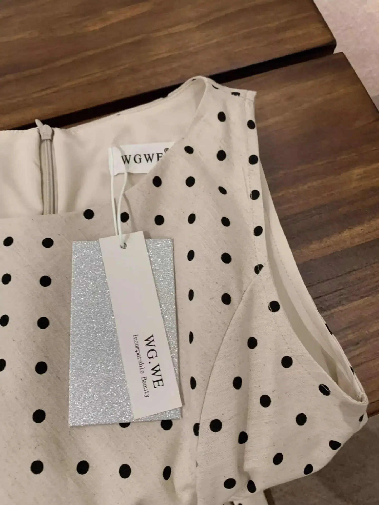 Liquidación, Sin Devoluciones ni Cambios, Vestido Largo de Lino-Algodón de Alta Gama Estilo Francés Pino Luna Elegante Lunares Cintura Entallada W6687