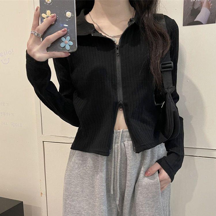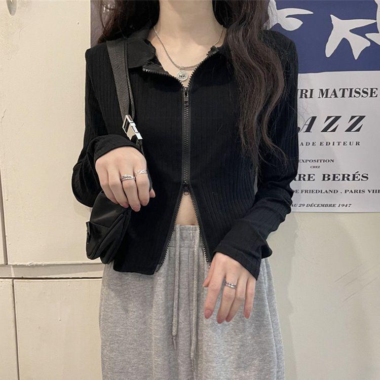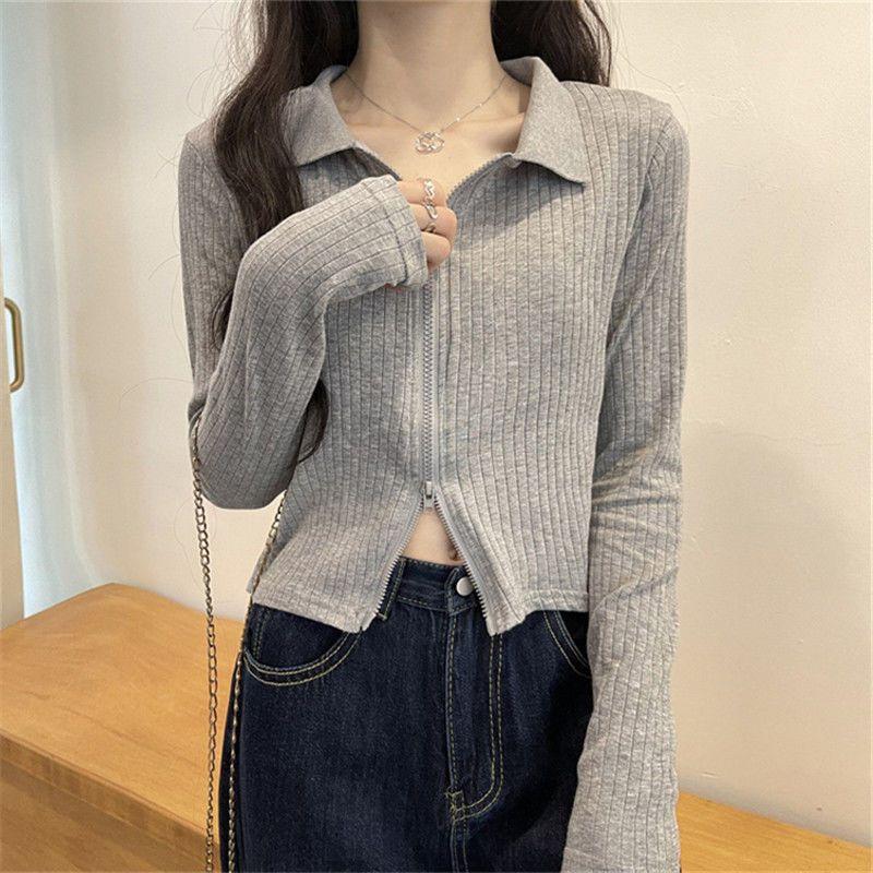 Compra Playera de Manga Larga para Mujer Nueva Tendencia Nicho Nuevo Sentido Primavera y Otoño Nueva Slim Cintura Alta Cárdigan Corto Top de Doble Cierre al por mayor en Joom.pro