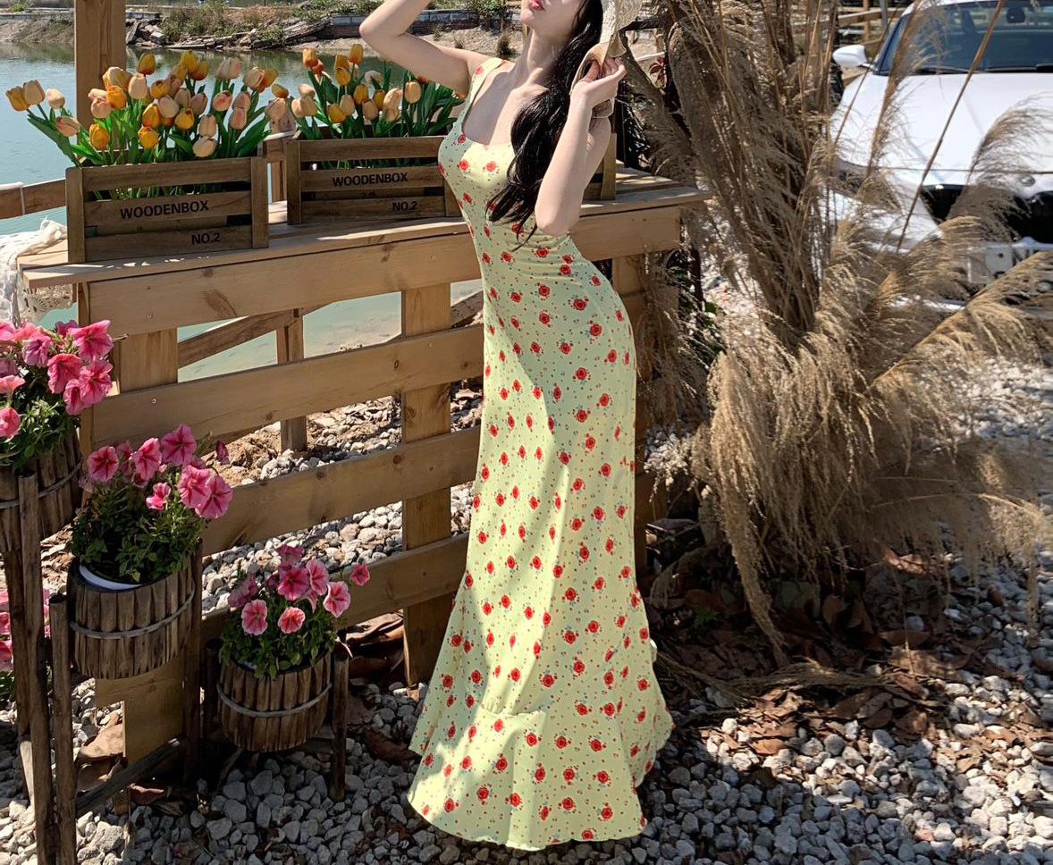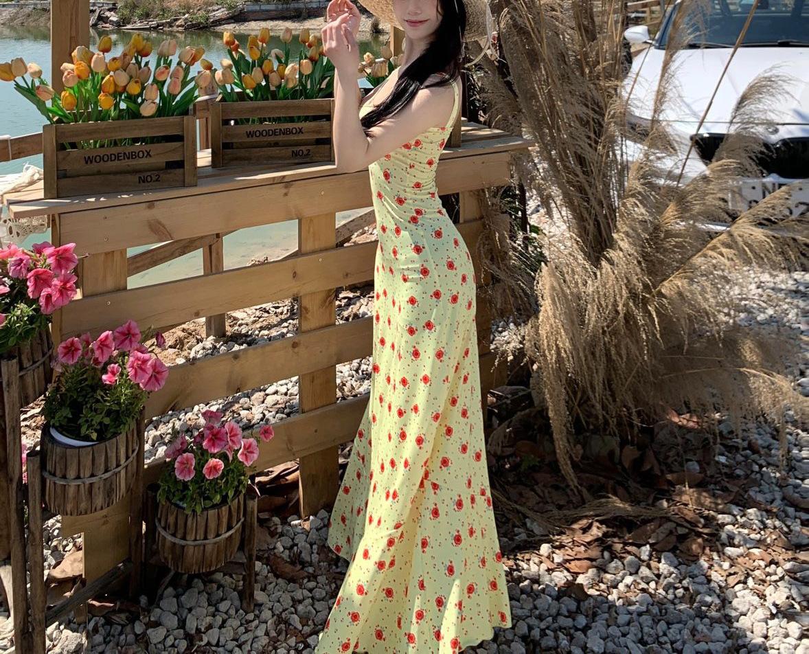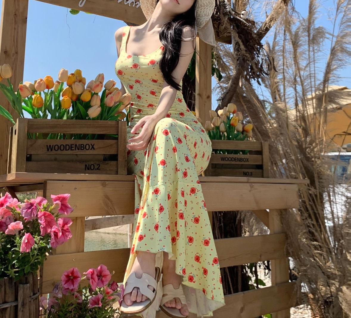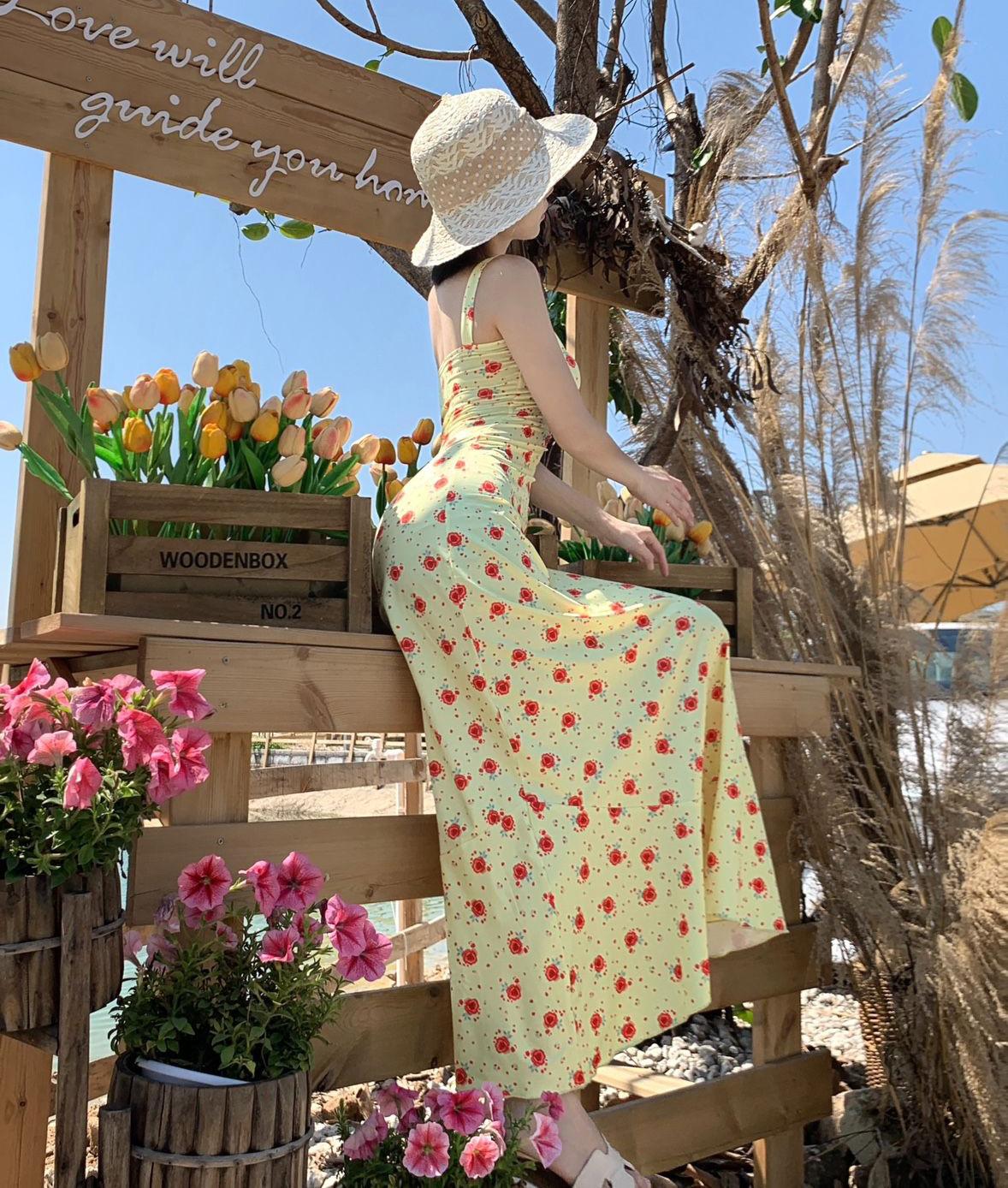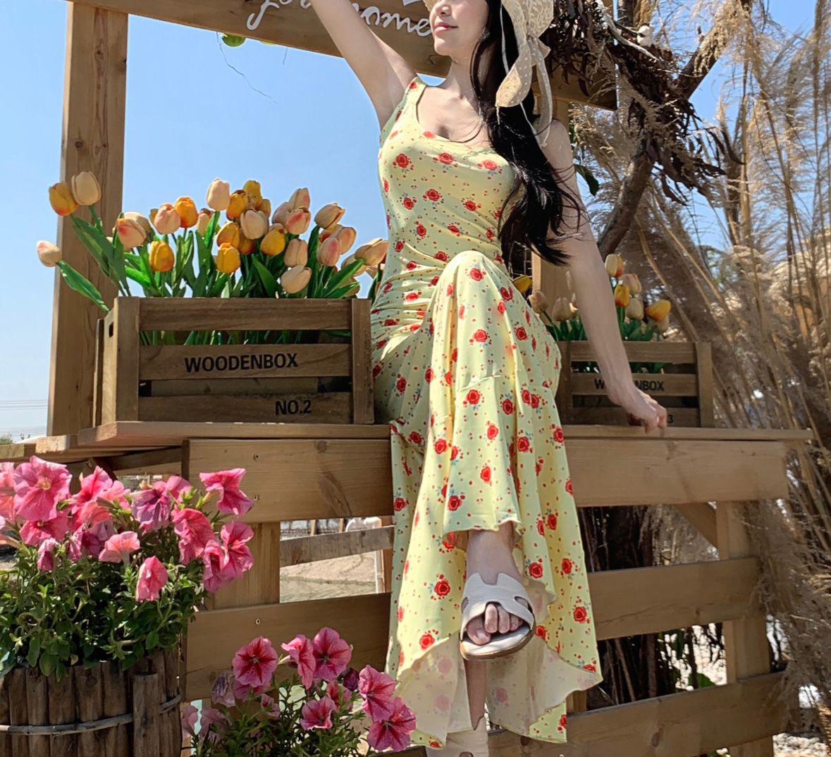 Reducción de cintura, Adelgazamiento, Vacaciones de chica caliente de pura lujuria, Falda larga con tirantes, Vestido floral de temperamento nuevo de alta gama
