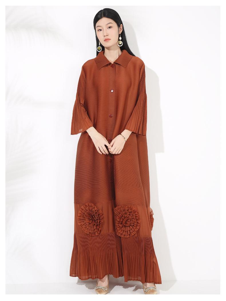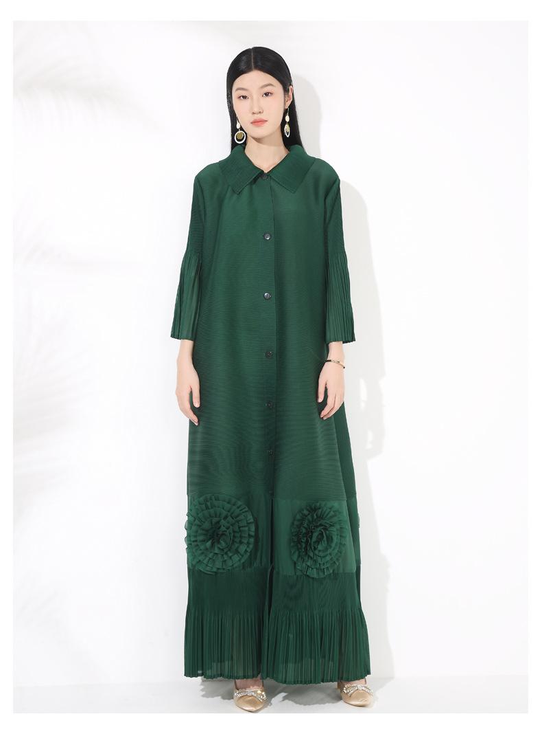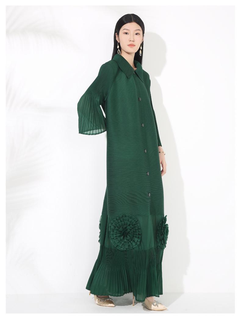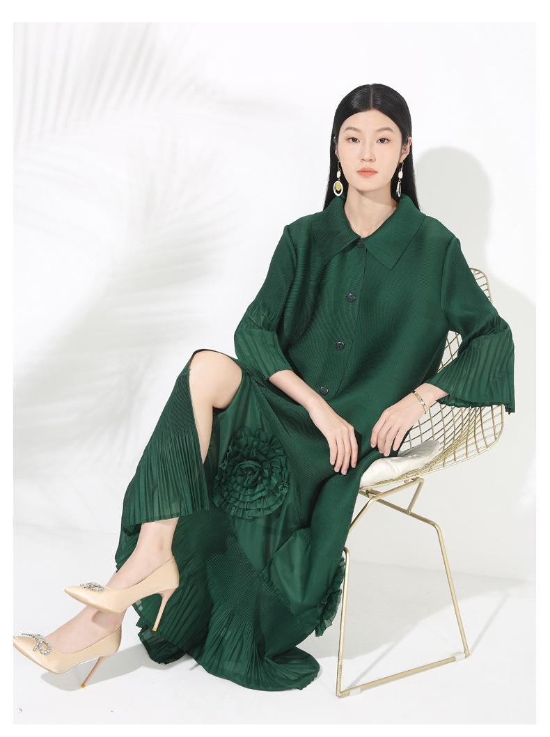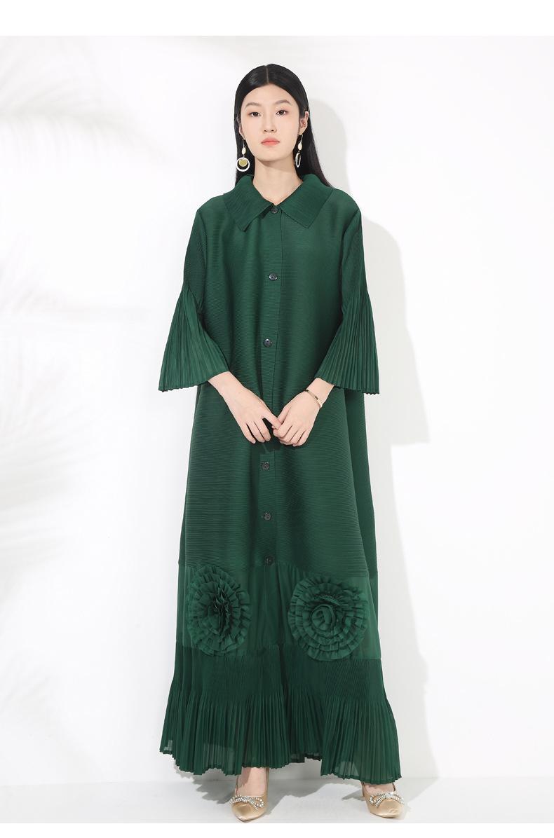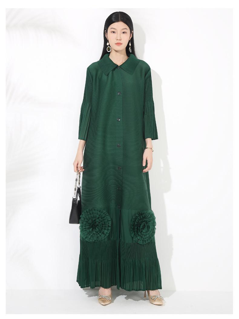 Vestido Nuevo Elegante Suelto Plisado para Mujer de Moda de Alta Gama Solapa Manga Trompeta Flor Largo Abotonado