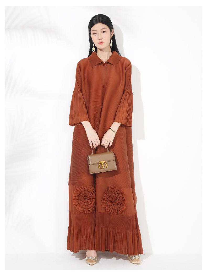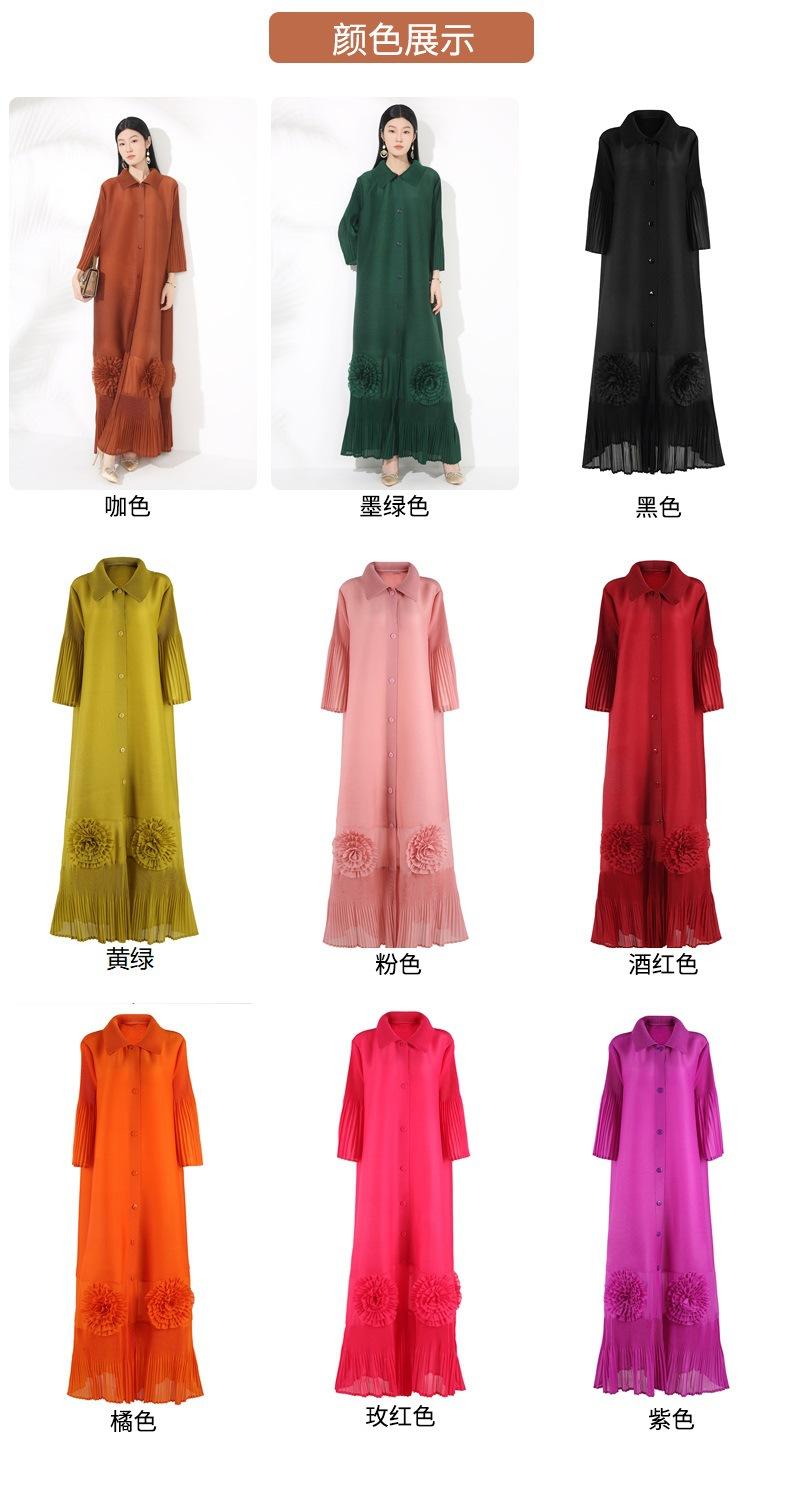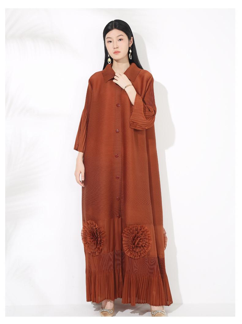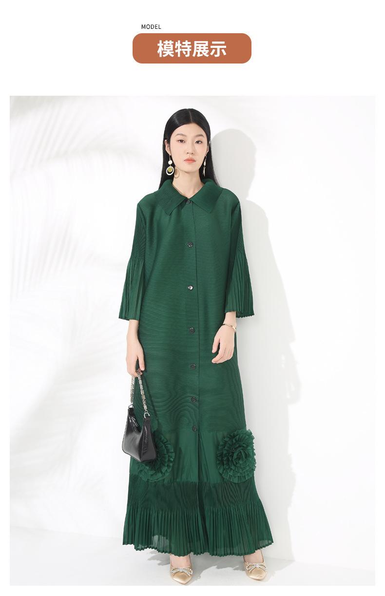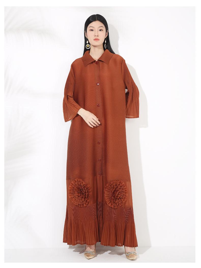 Vestido Nuevo Elegante Suelto Plisado para Mujer de Moda de Alta Gama Solapa Manga Trompeta Flor Largo Abotonado