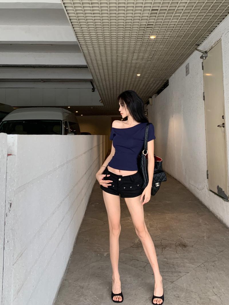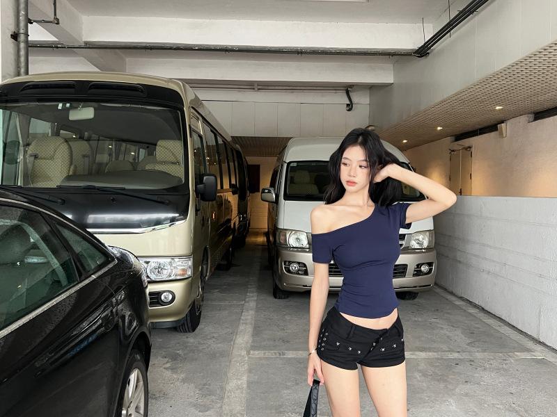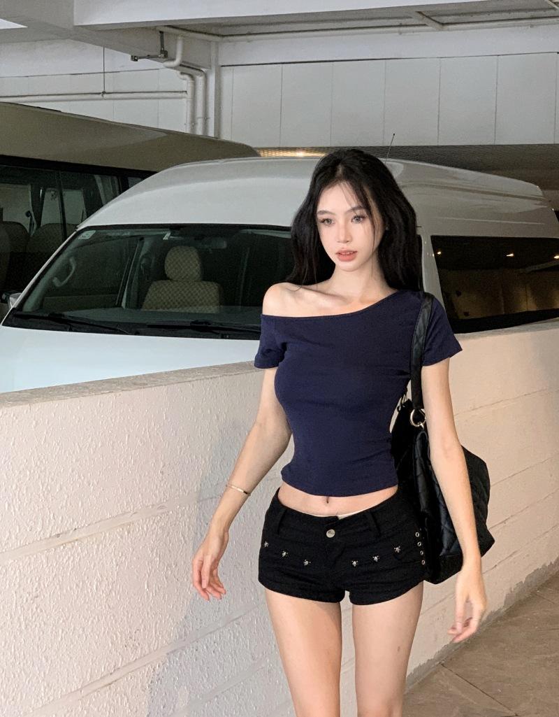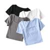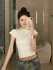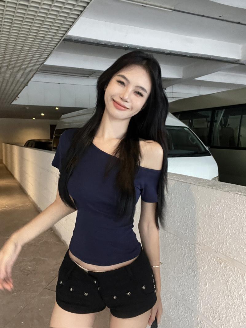 Para playera de manga corta con hombro oblicuo para mujer 2025 verano nueva llegada corta cropped ajustada versátil top de estudiante moderno Ins