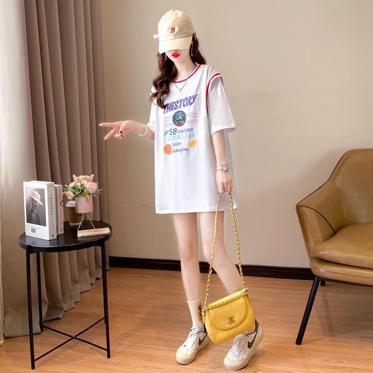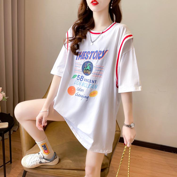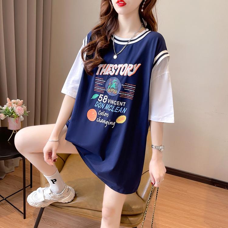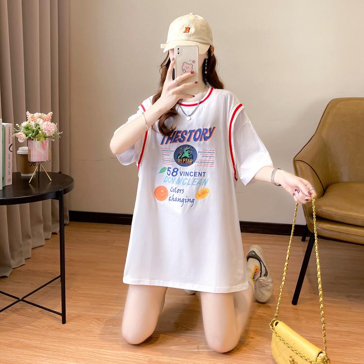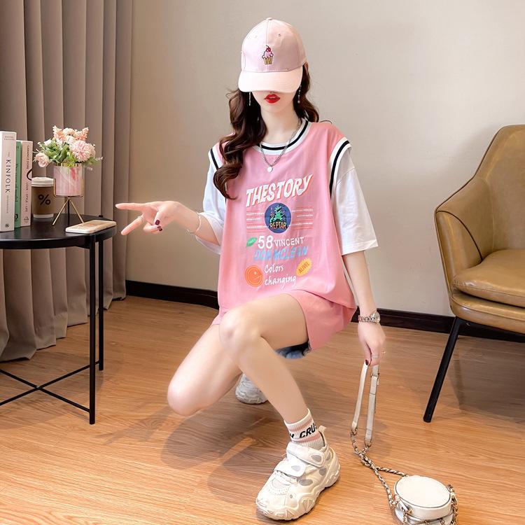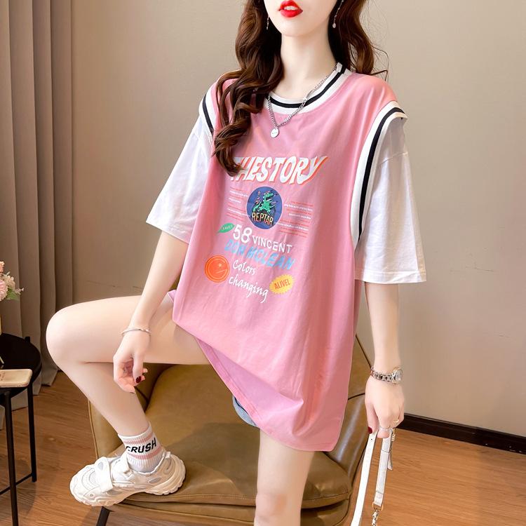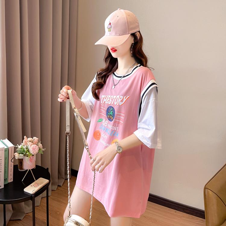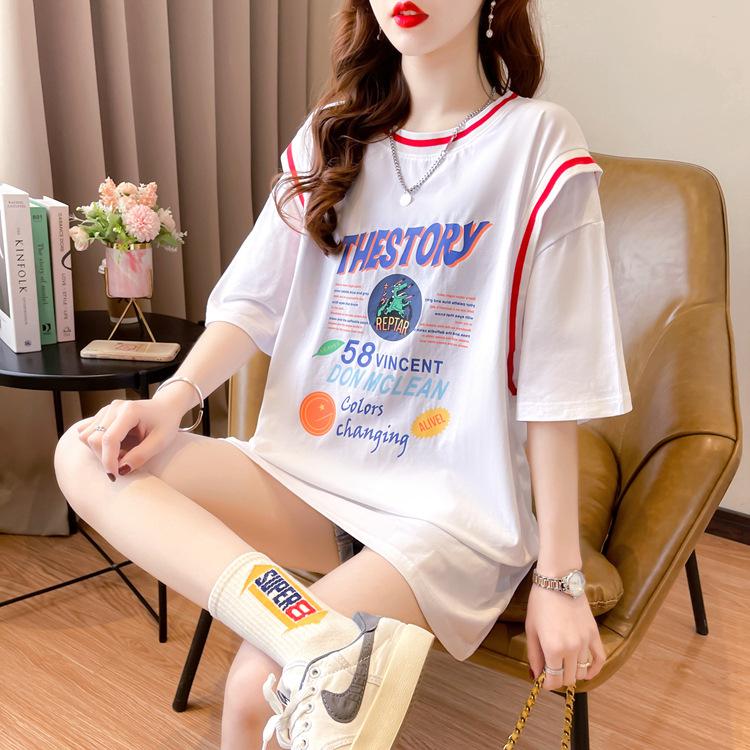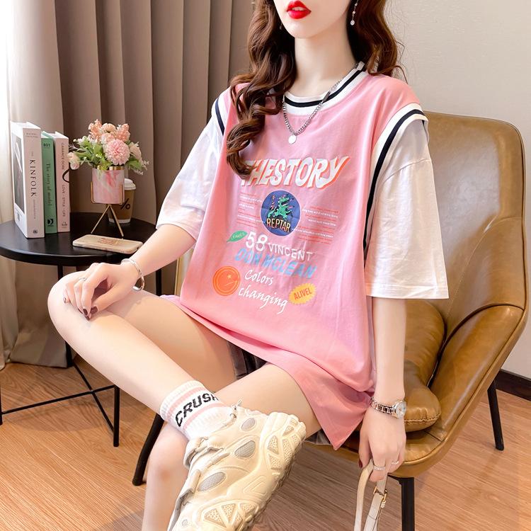 Compra Foto Real Verano Largo Medio Falso Dos Piezas Camiseta Manga Corta Femenina Hermana Gordita 2023 Nueva Ropa Holgada para Estudiantes al por mayor en Joom.pro