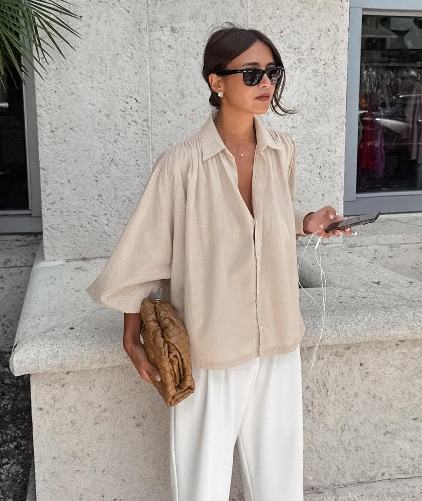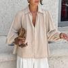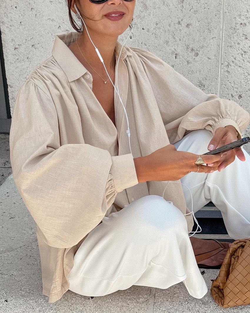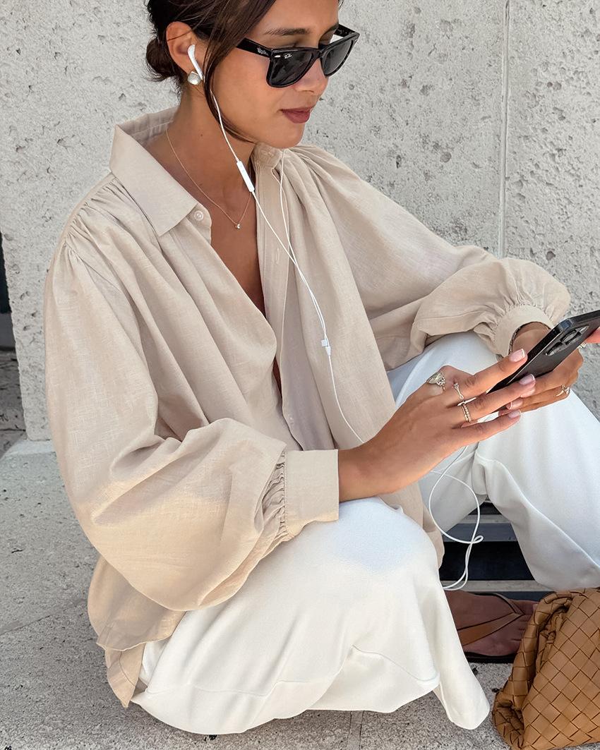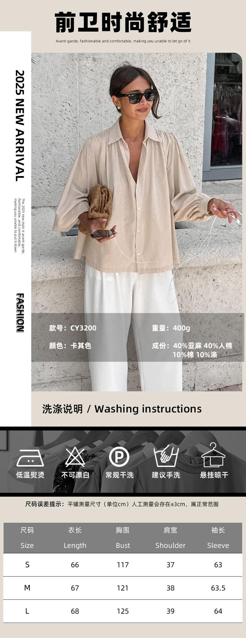 Camisa de lino transpirable de moda minimalista europea y americana 2025 ropa de mujer transfronteriza diseño holgado sentido plisado manga farol top