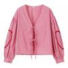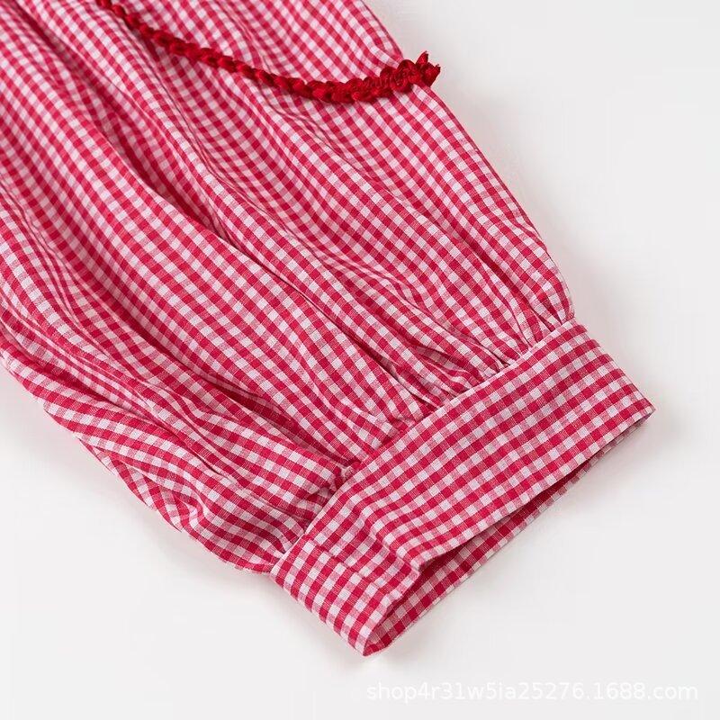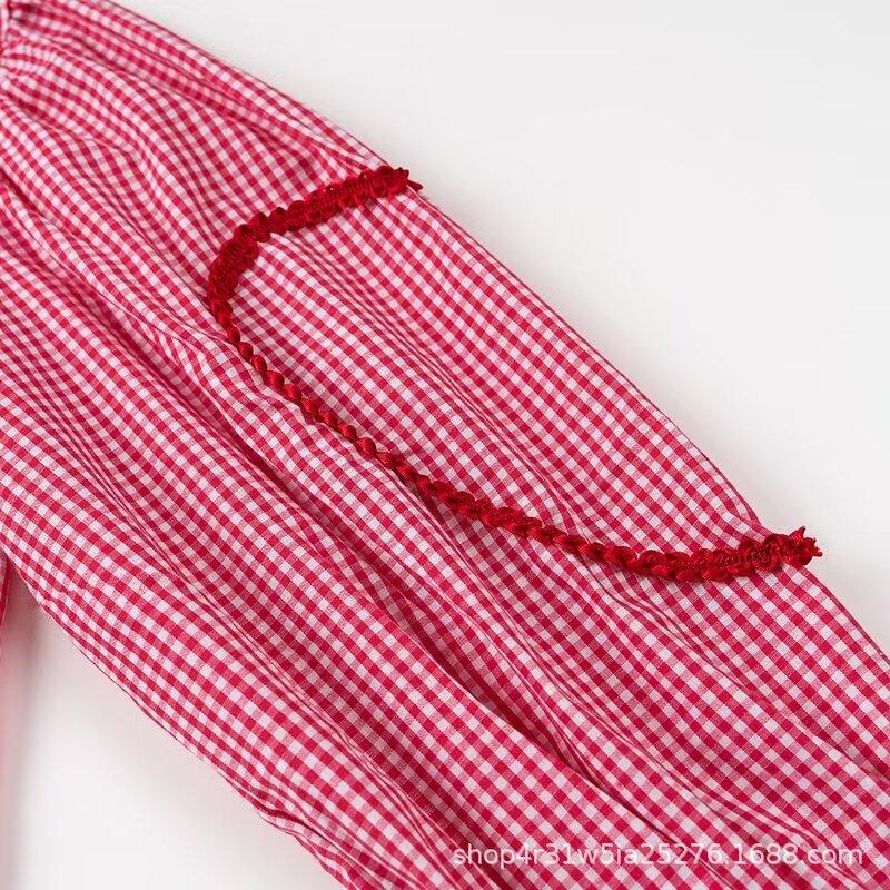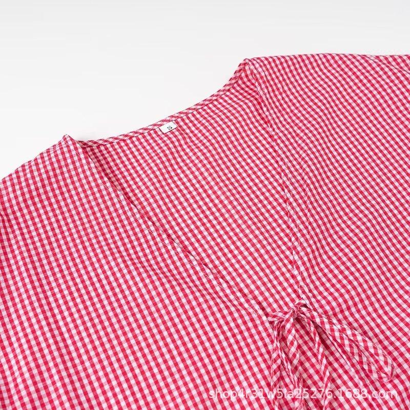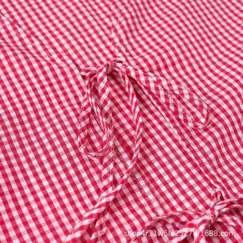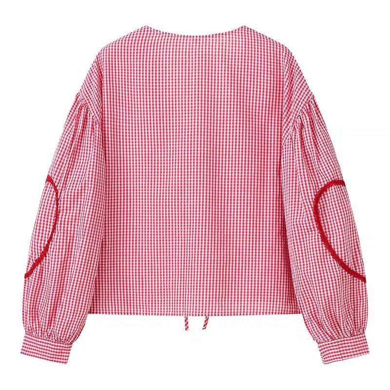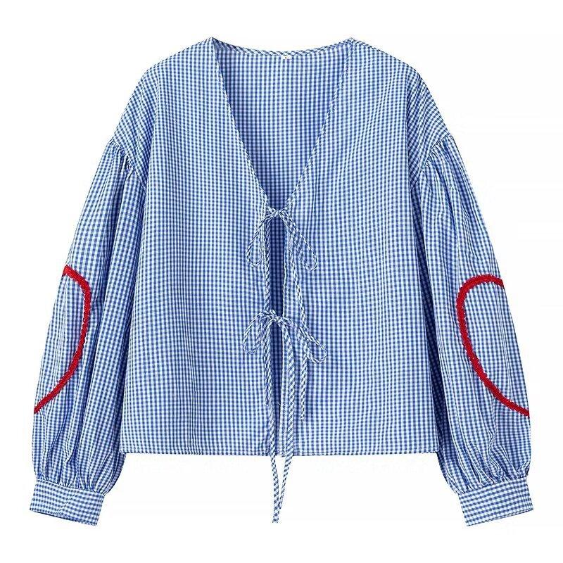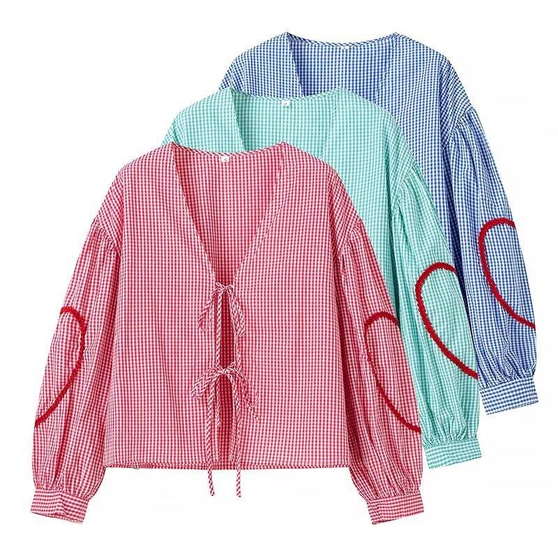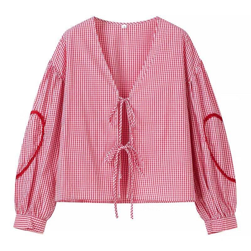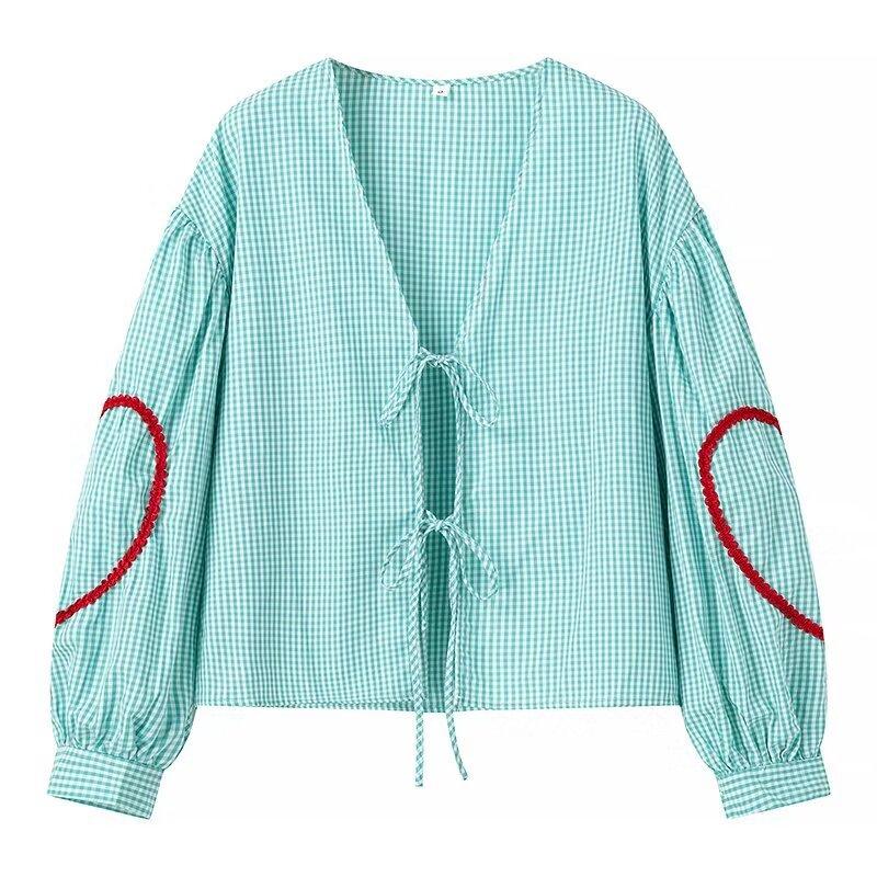 Europeo y Americano 2024 Verano Nueva Moda Versátil Cuadros Cuello V Camisa Lazo de Amor Mayorista