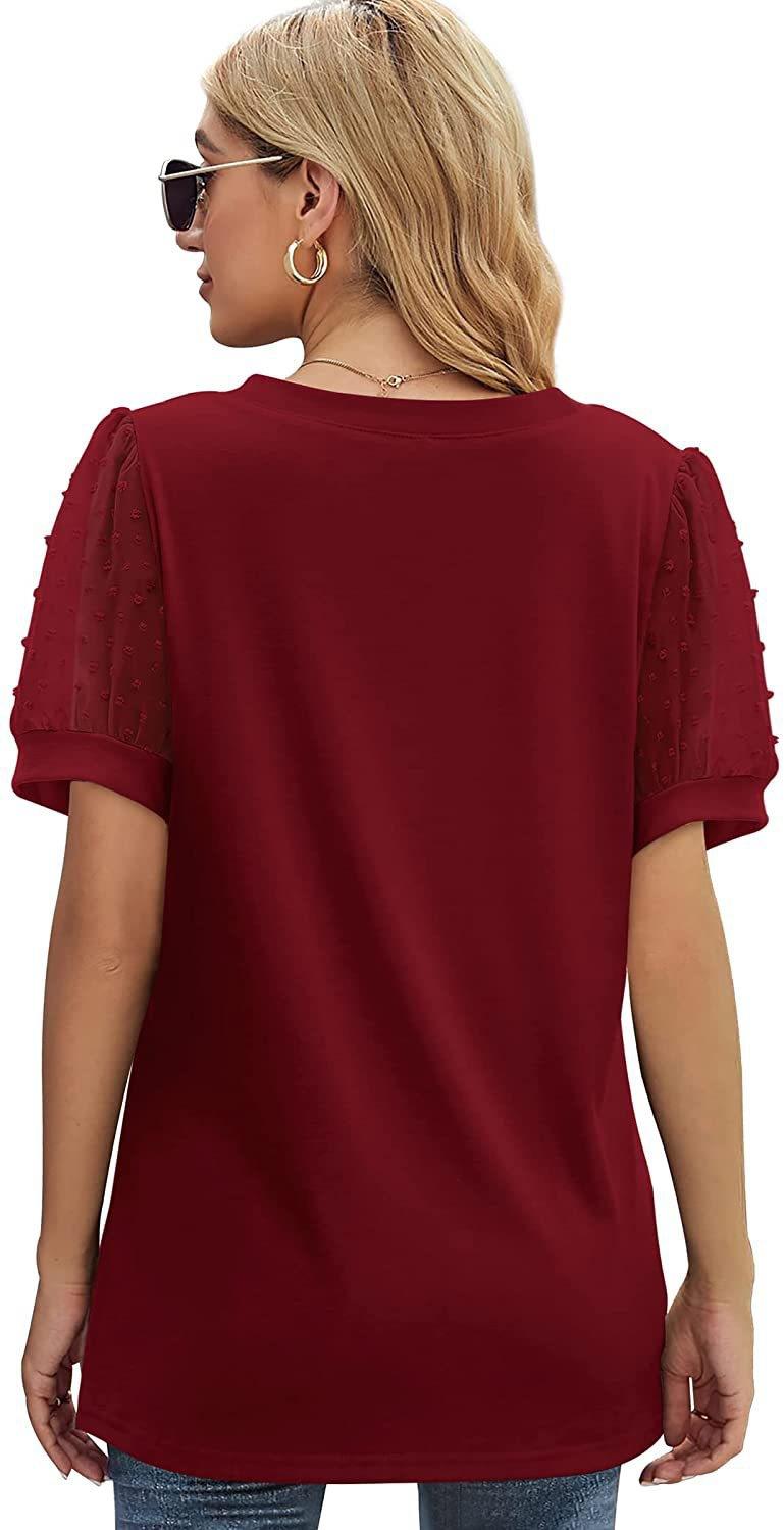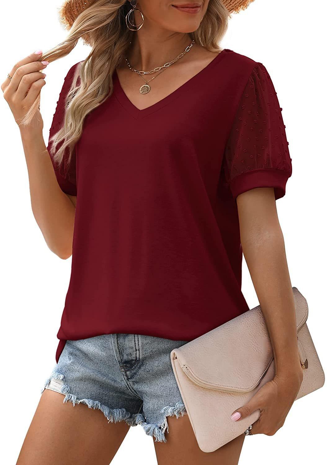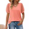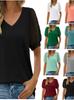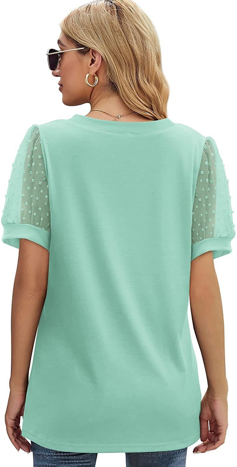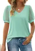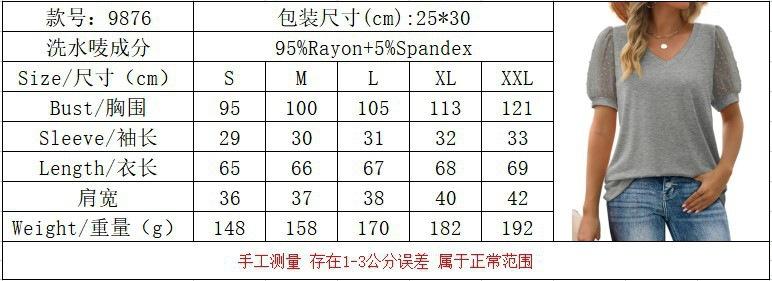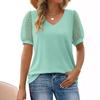 2025 Nuevo Verano Ropa Europea y Americana Transfronteriza Amazon Camiseta de Mujer Color Cuello en V Simple Malla Mangas Abullonadas