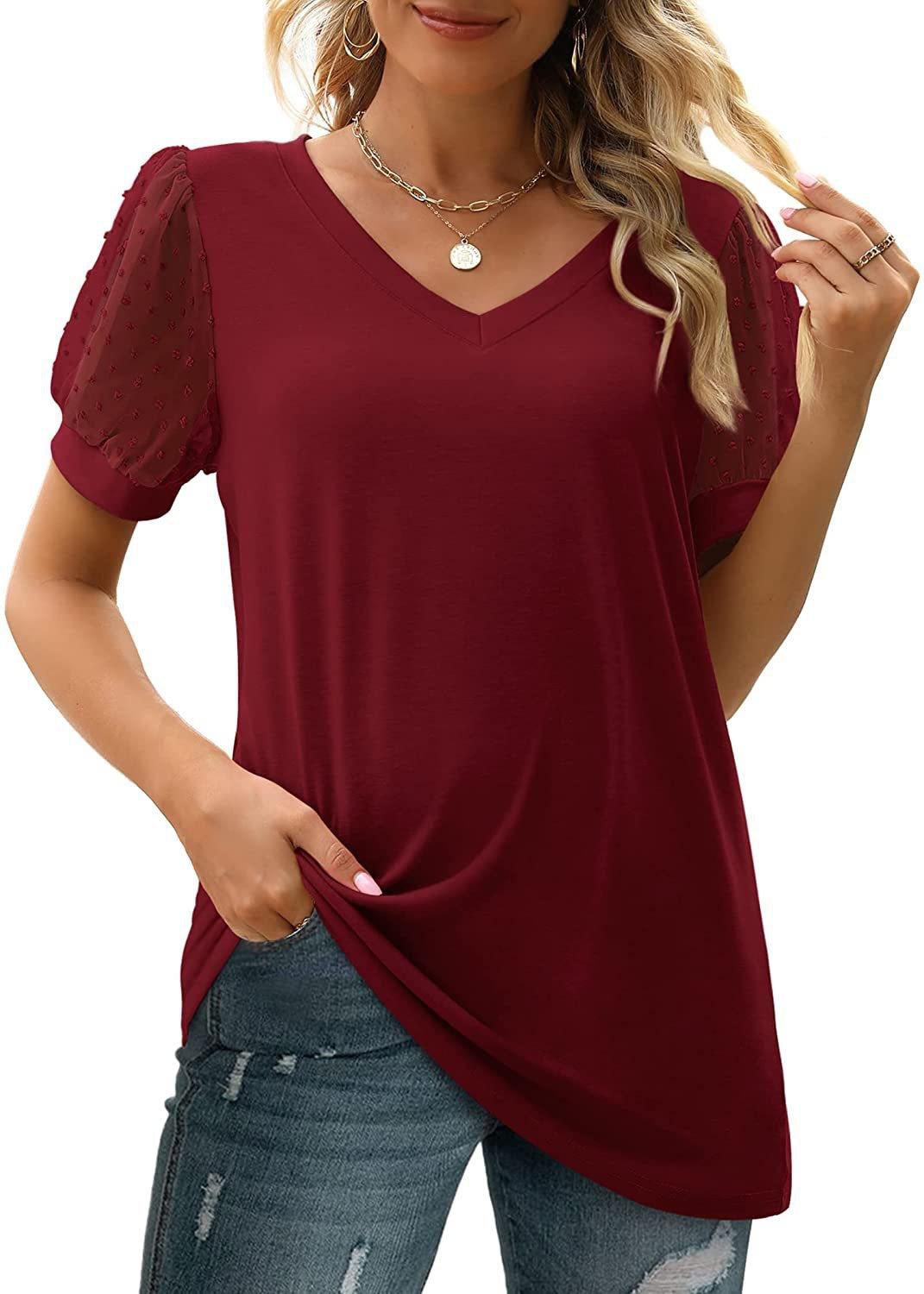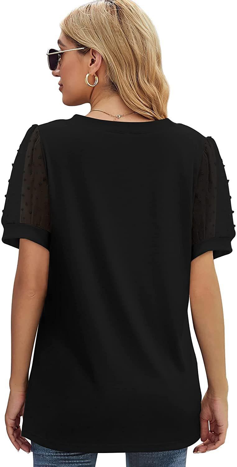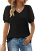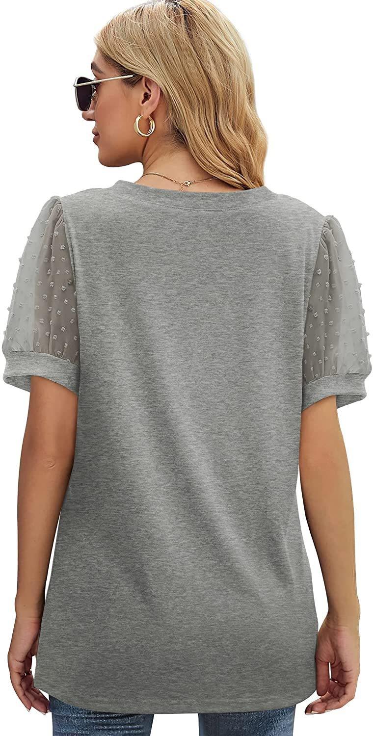 2025 Nuevo Verano Ropa Europea y Americana Transfronteriza Amazon Camiseta de Mujer Color Cuello en V Simple Malla Mangas Abullonadas