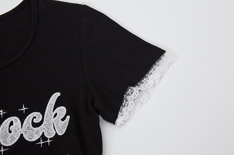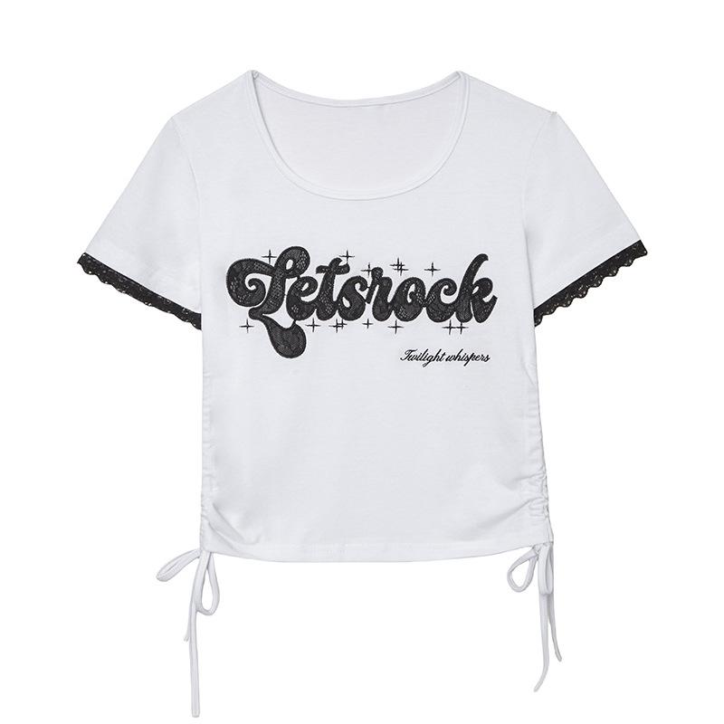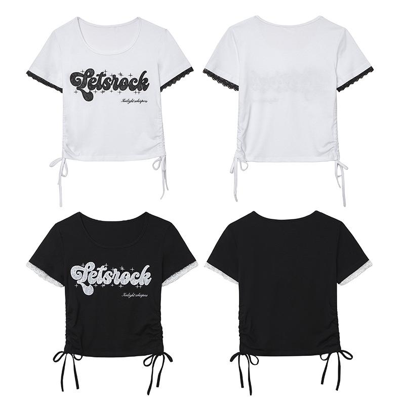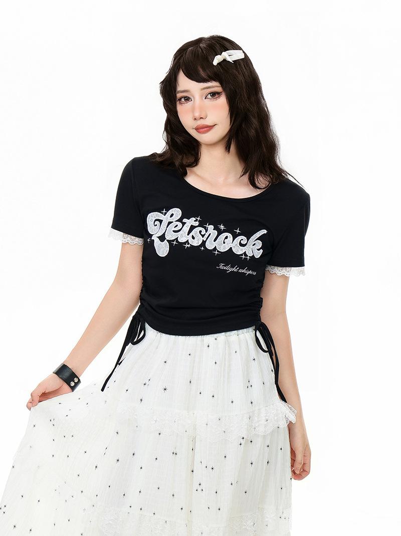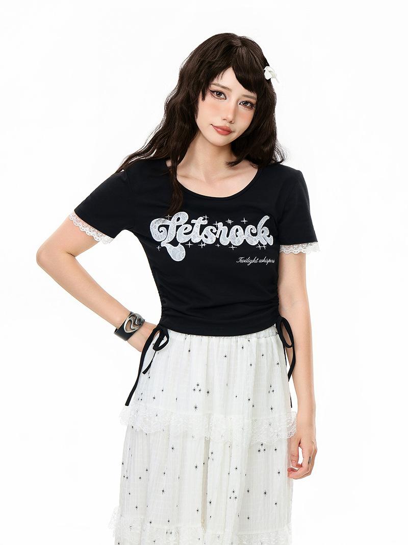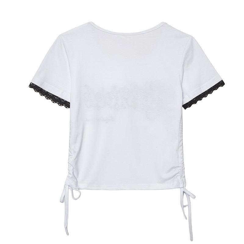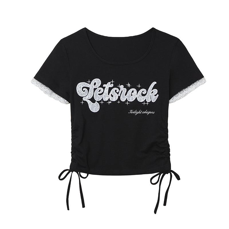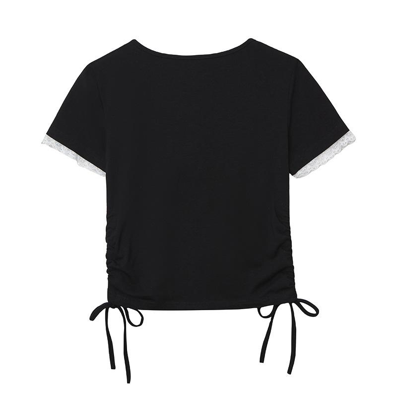 2025 Nueva Camiseta de Verano de Encaje Retro Americano para Mujer de Manga Corta con Tirantes de Cordón para Personas Pequeñas en el Hombro Derecho