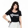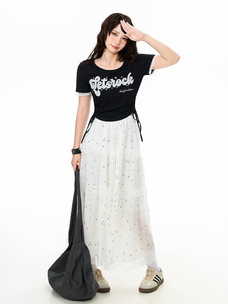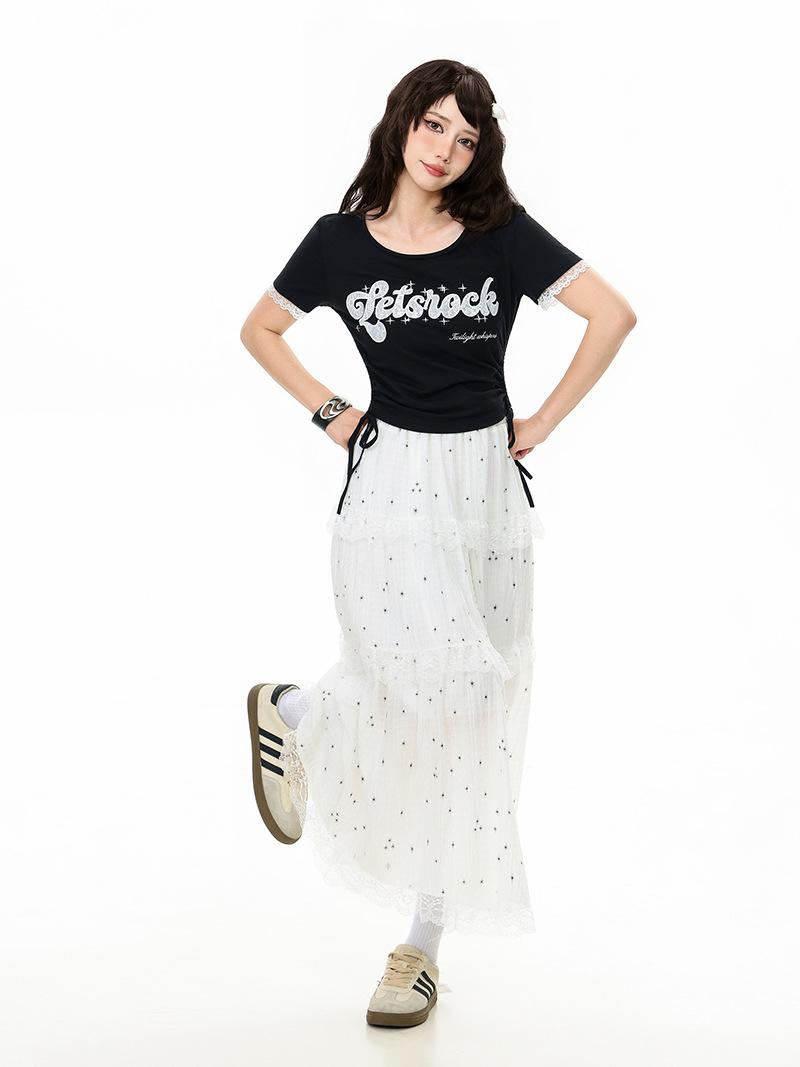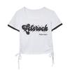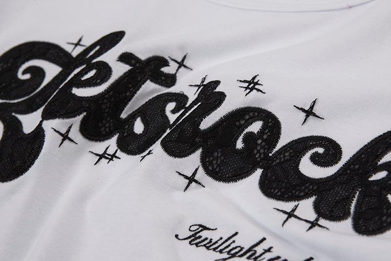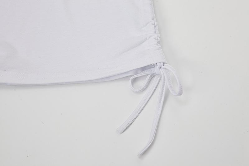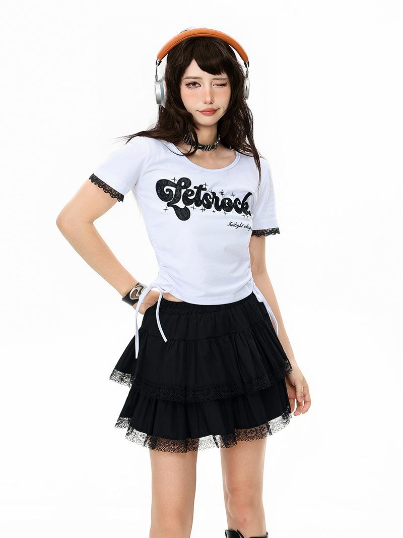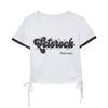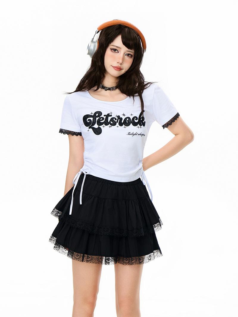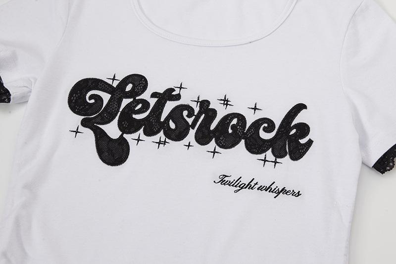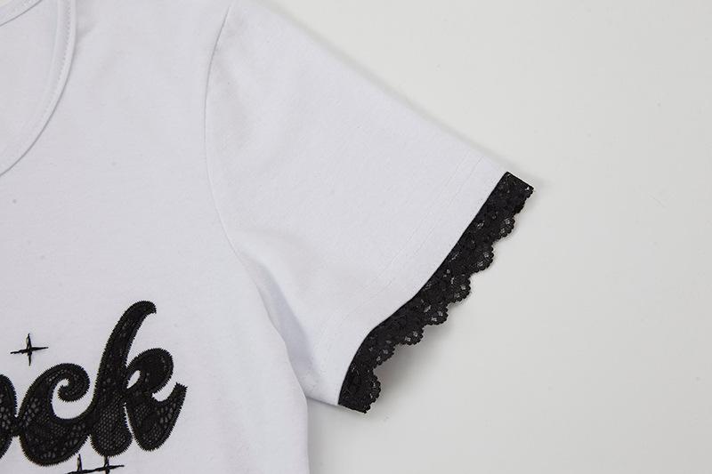 2025 Nueva Camiseta de Verano de Encaje Retro Americano para Mujer de Manga Corta con Tirantes de Cordón para Personas Pequeñas en el Hombro Derecho