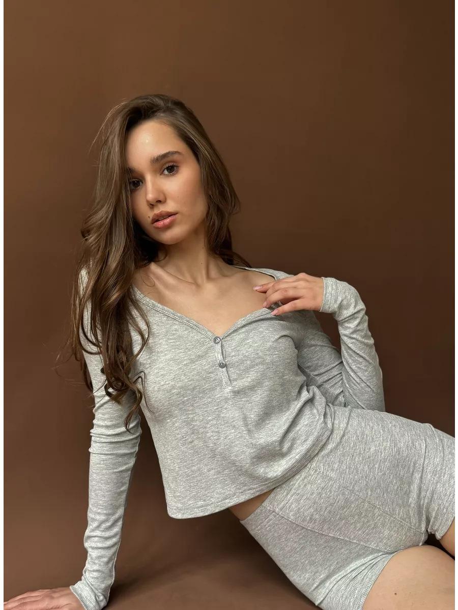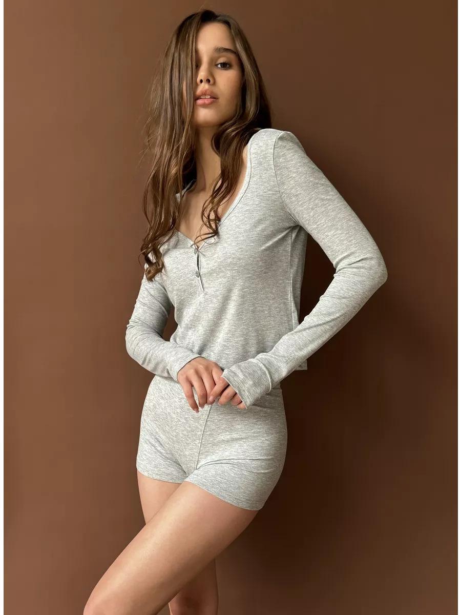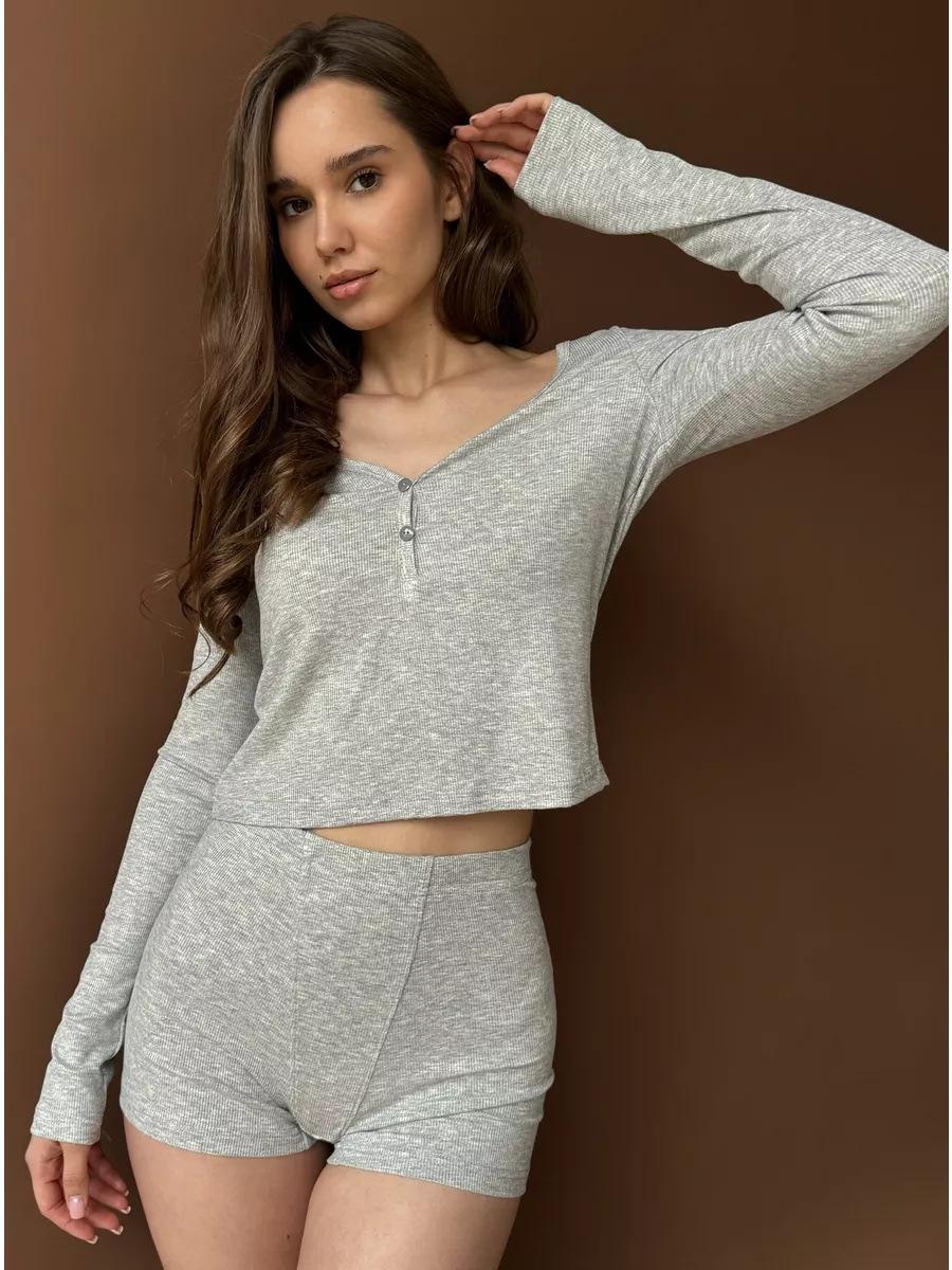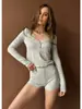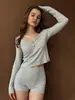 Traje de dos piezas europeo y americano de top con botones y cuello en V y shorts, sexy y picante para chicas, de corte ajustado, casual, de manga larga, para estar en casa