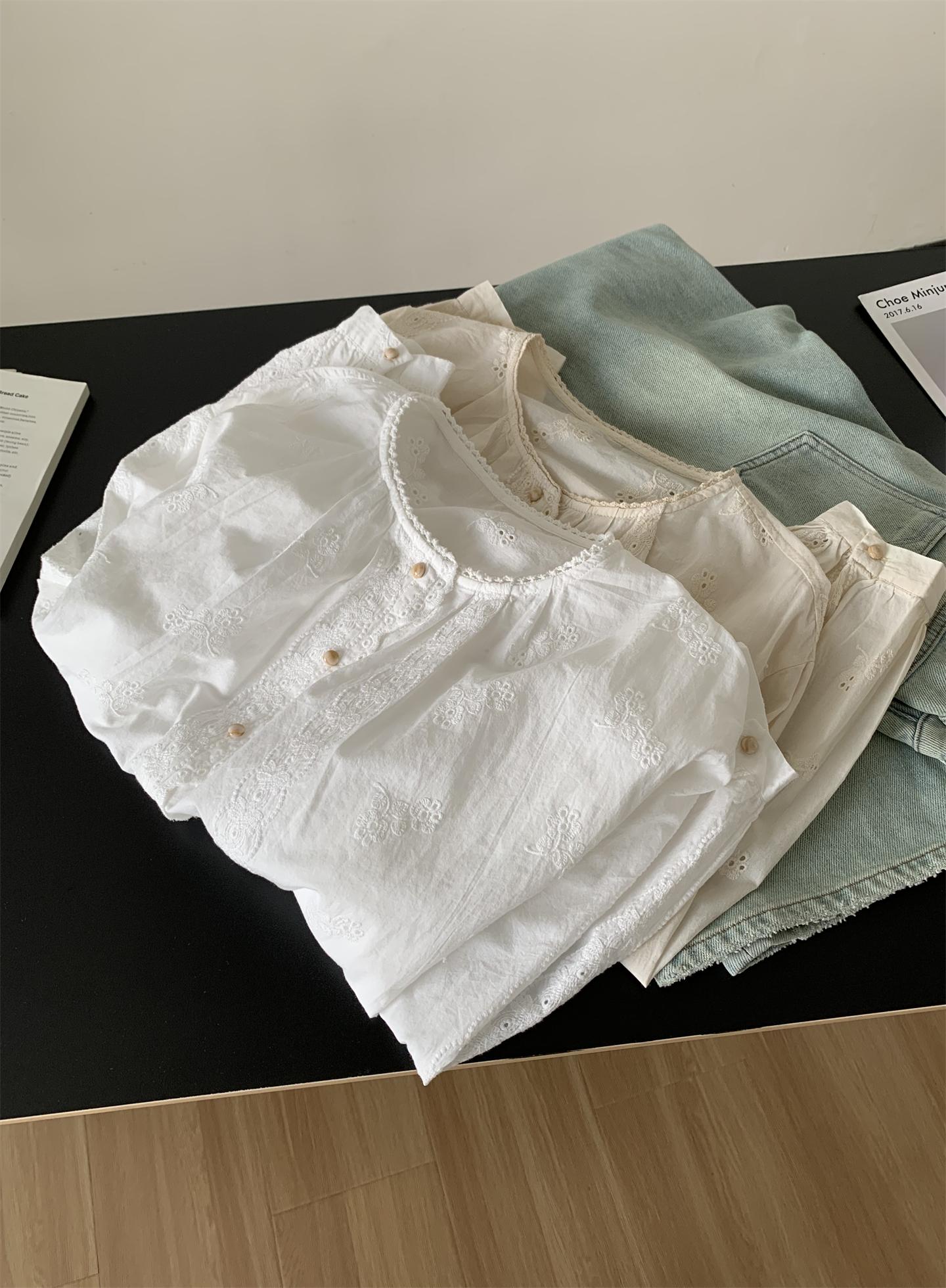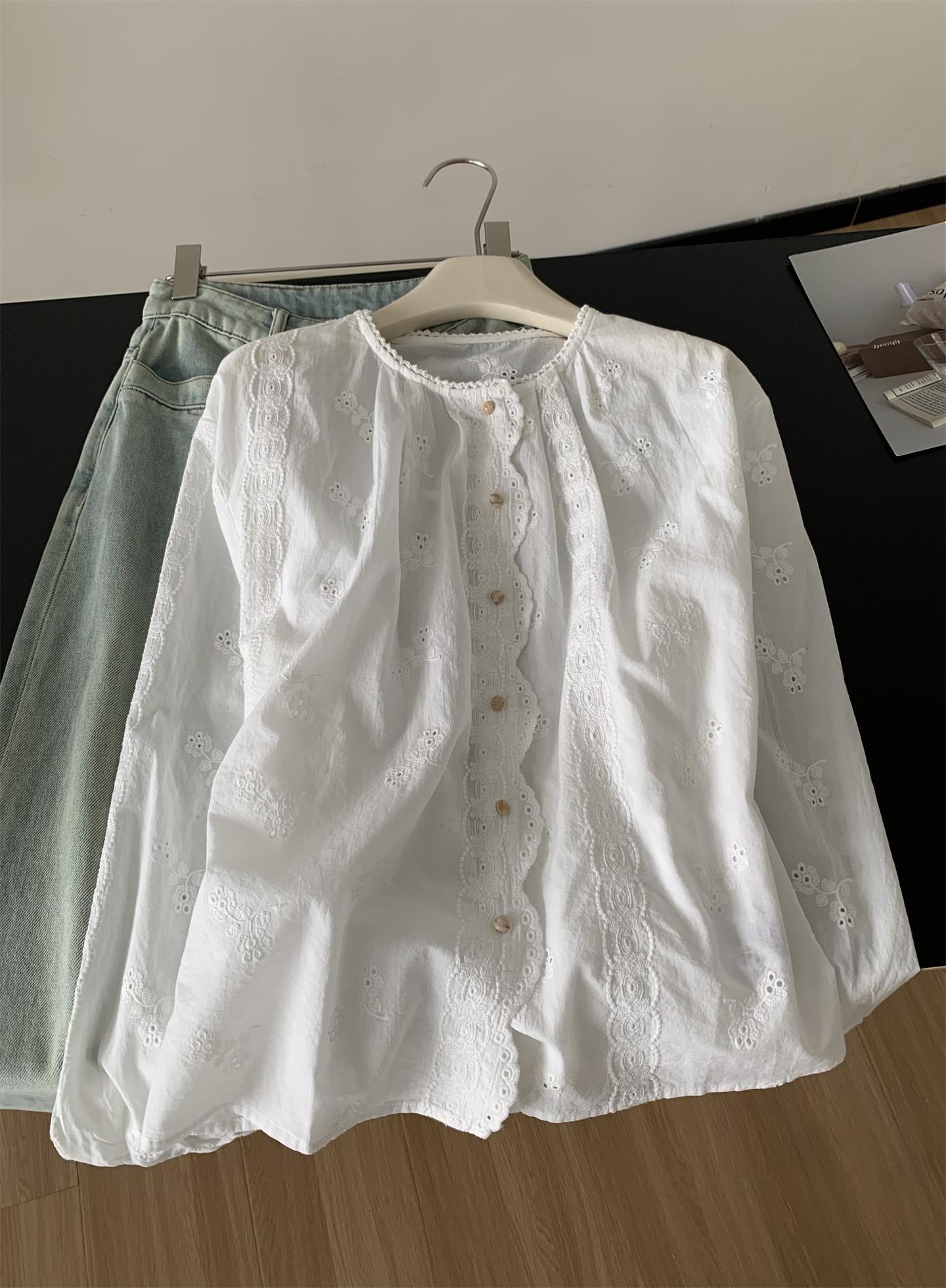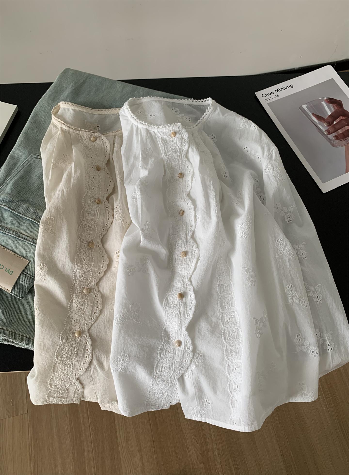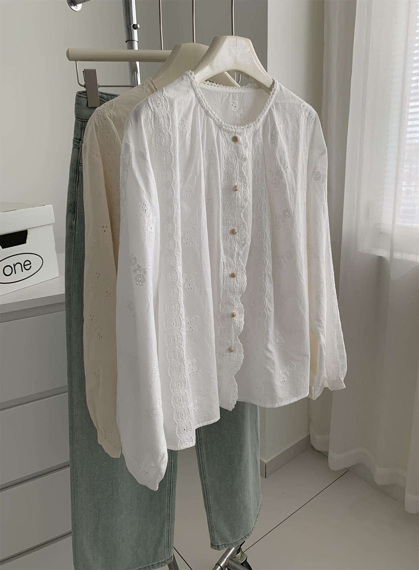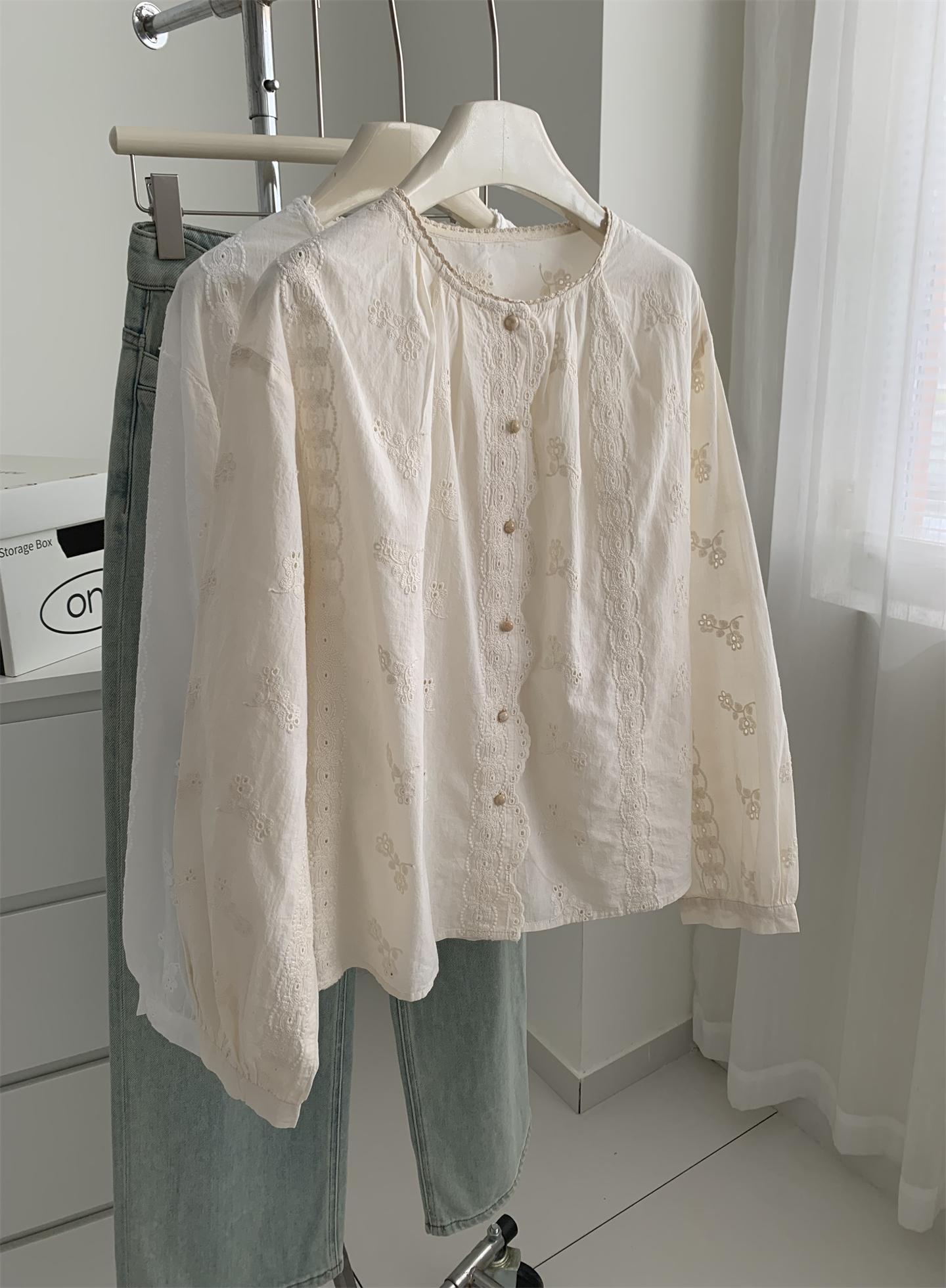 Camisa Retro de Encaje Cuello Redondo Bordada para Mujer Dulce Japonesa Reductora de Edad Jacquard Linterna Manga Larga Cárdigan Otoño 2025