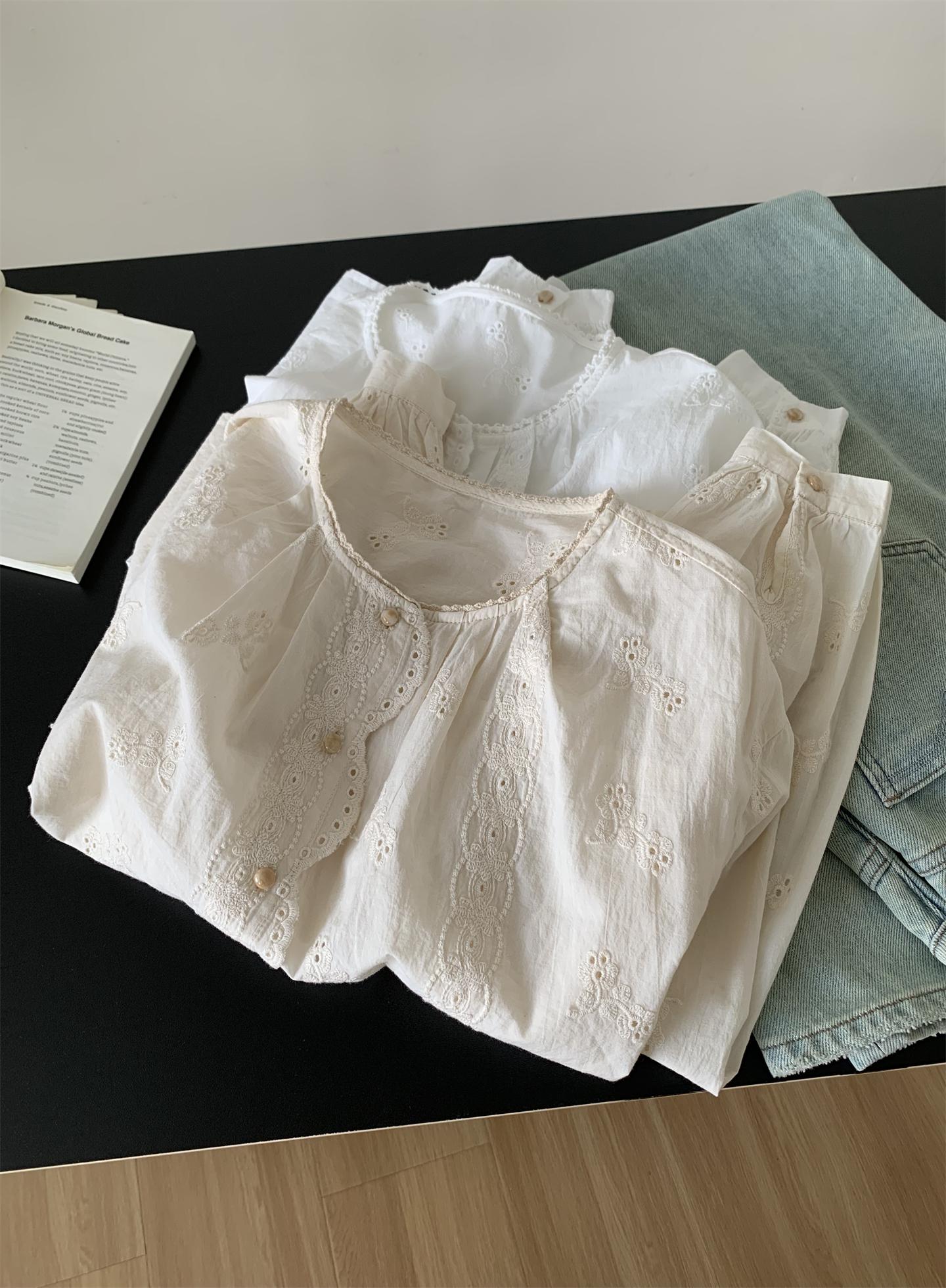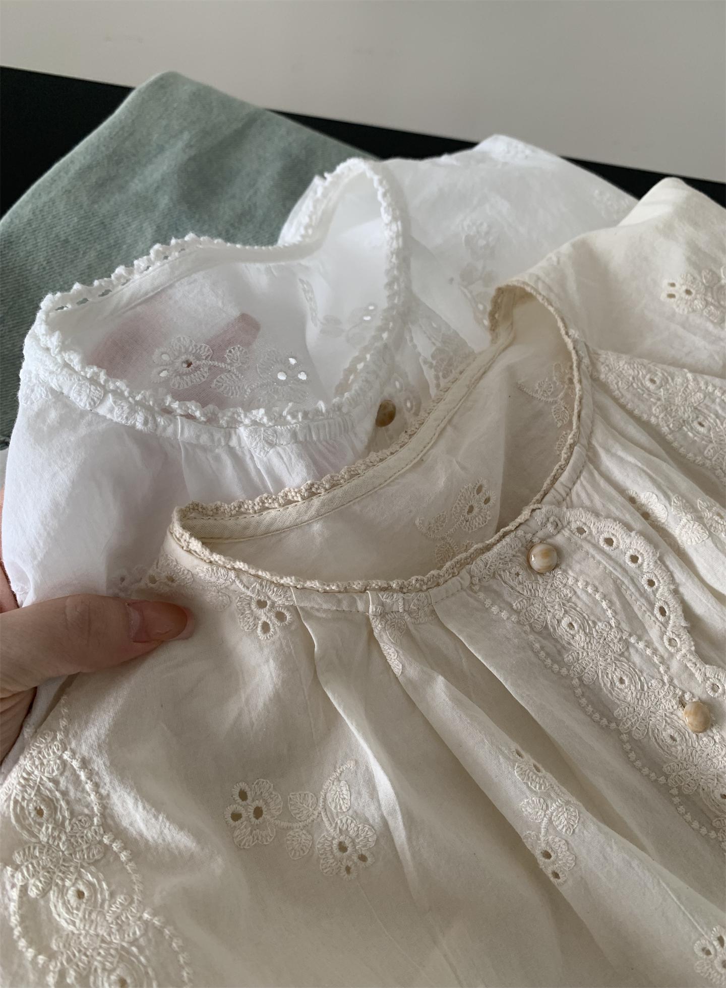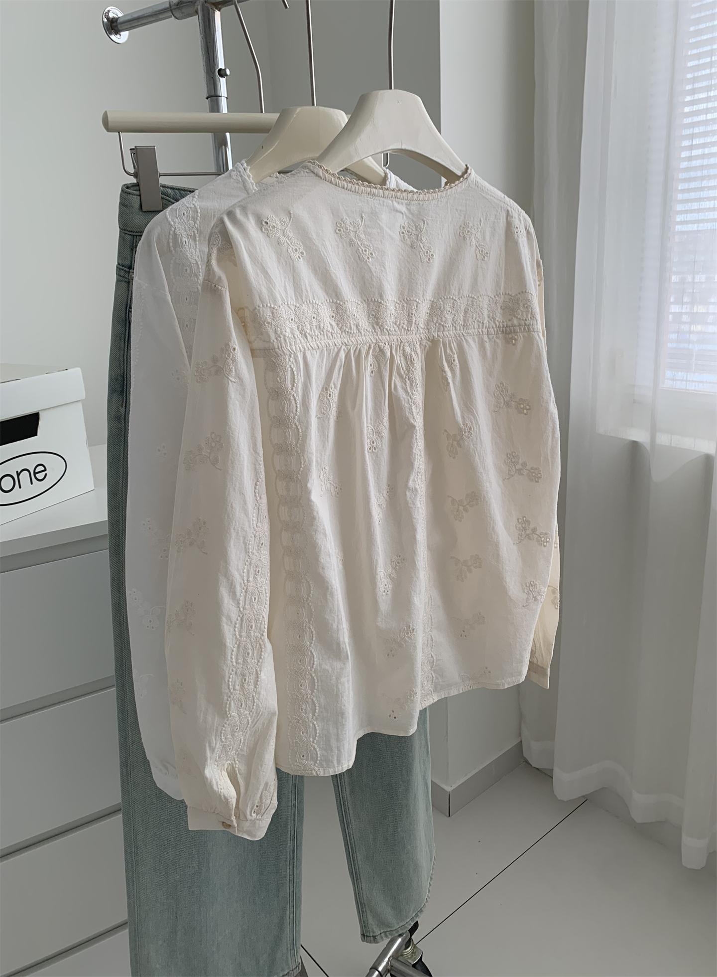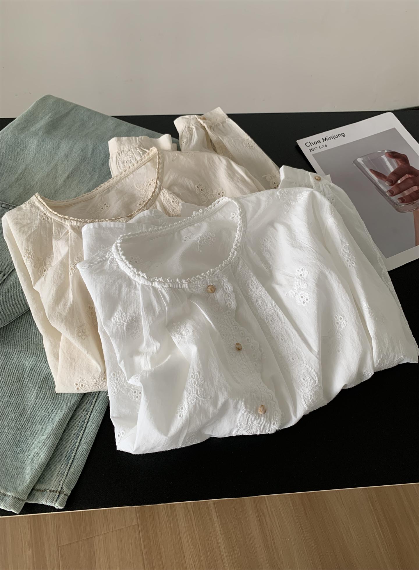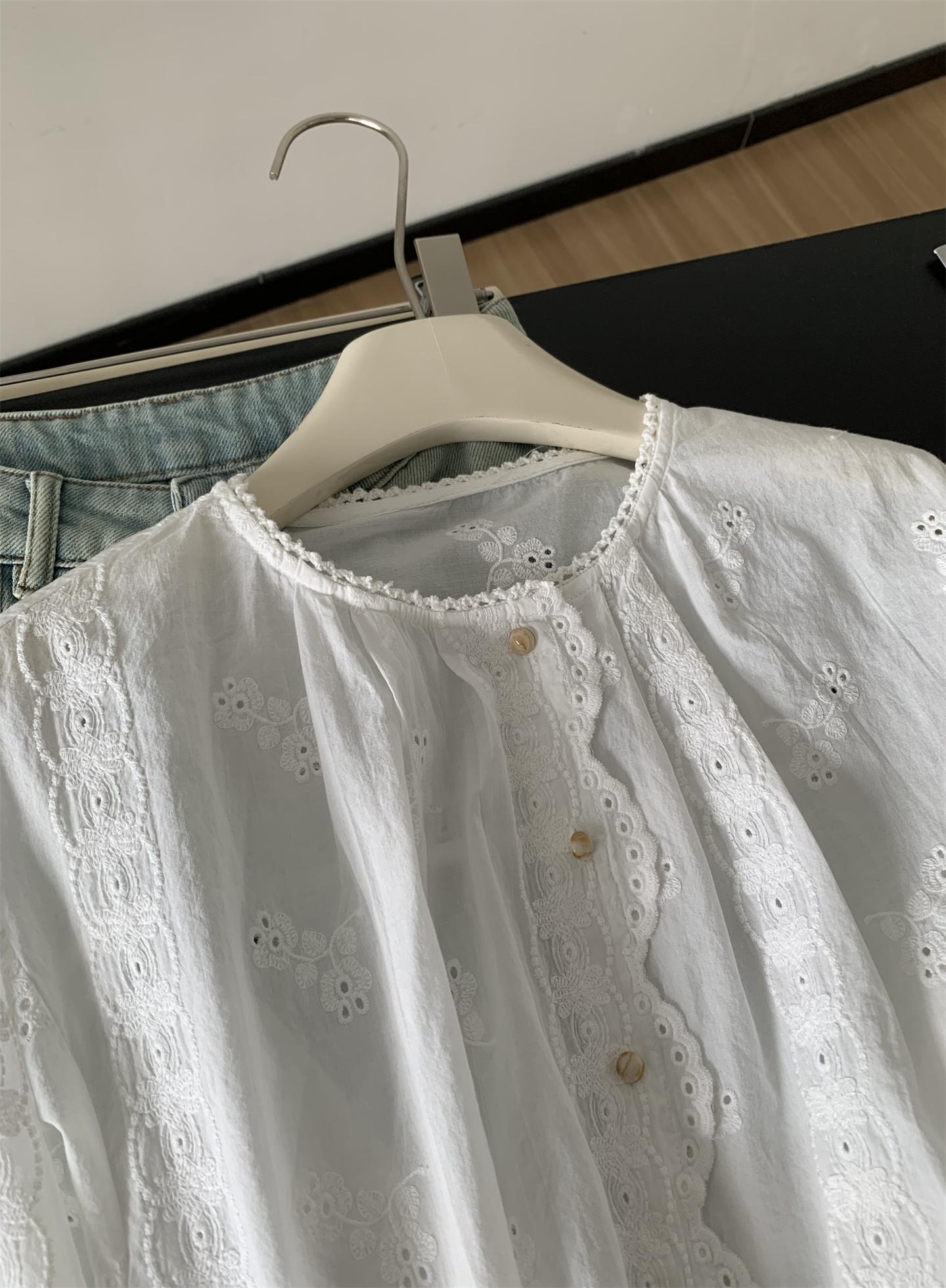 Camisa Retro de Encaje Cuello Redondo Bordada para Mujer Dulce Japonesa Reductora de Edad Jacquard Linterna Manga Larga Cárdigan Otoño 2025