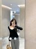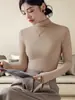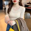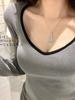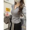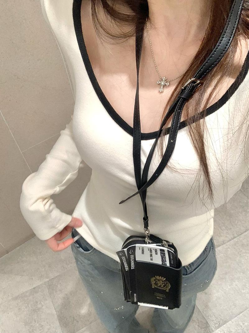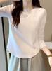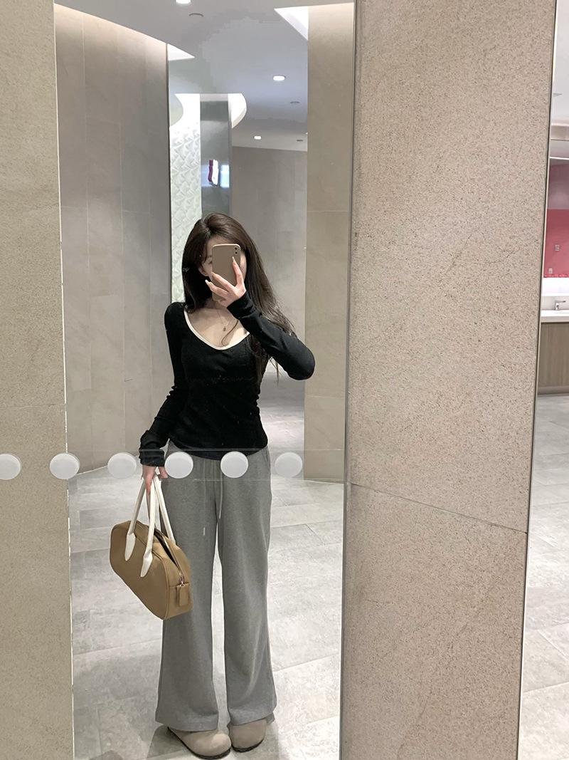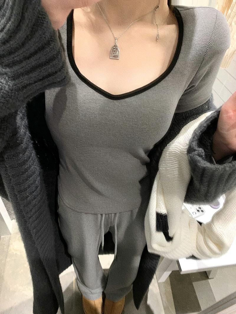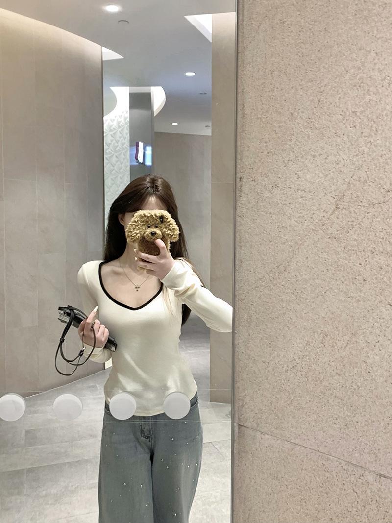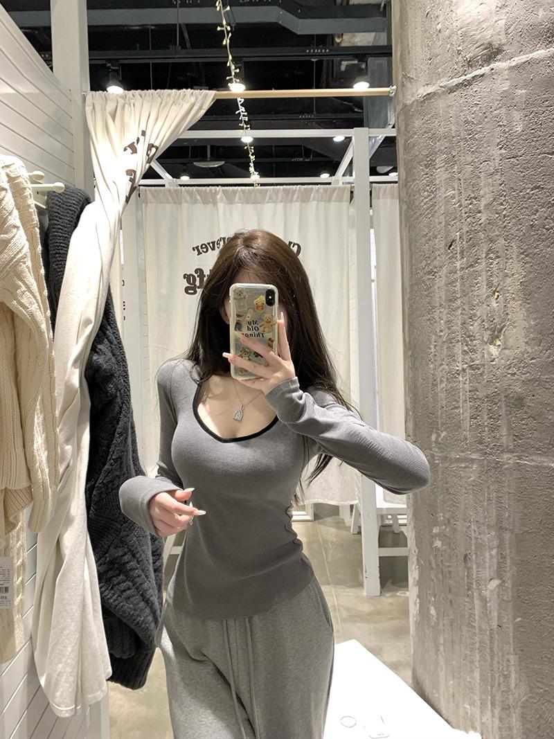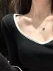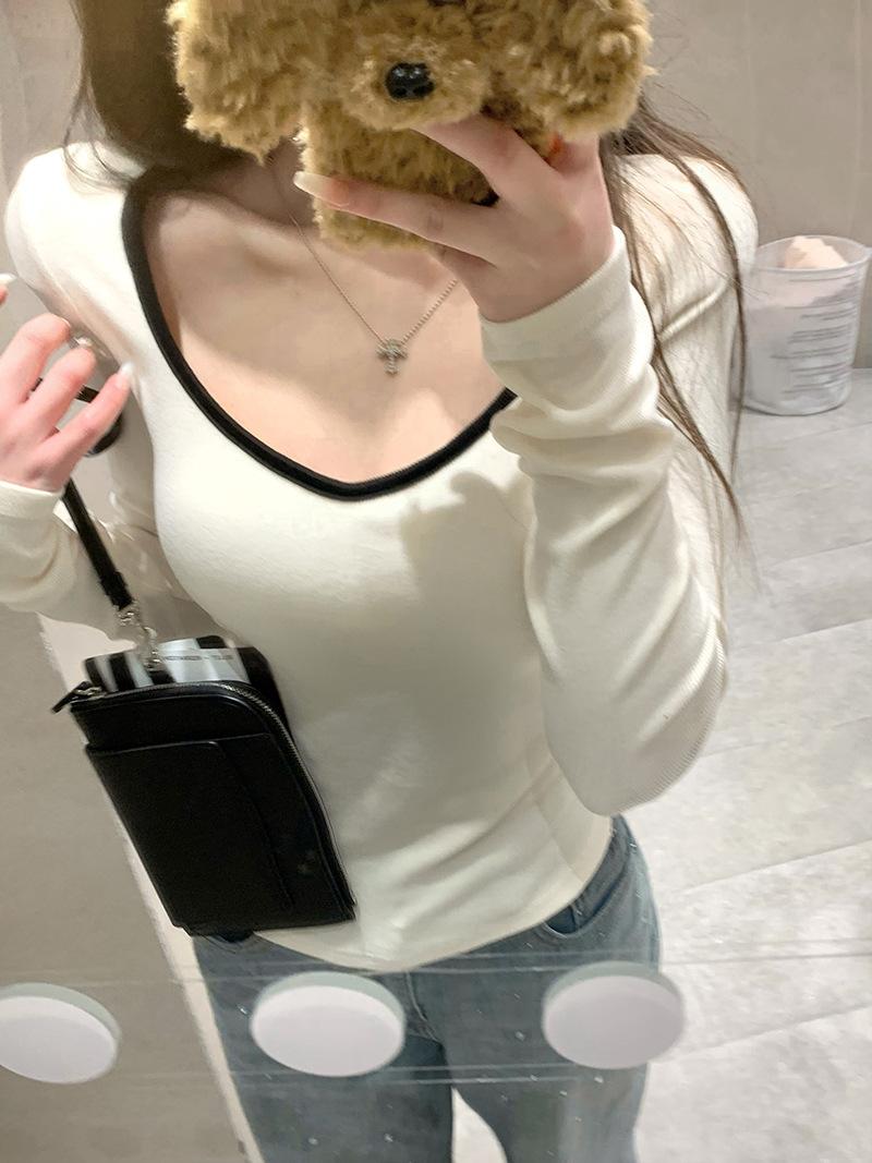 Playera de Manga Larga de Color Contrastante con Cuello Redondo y Almohadilla en el Pecho para Mujer 2025 Invierno Nuevo Estilo Forro Polar Aspecto Adelgazante Camiseta Base Top Ins