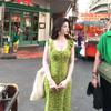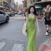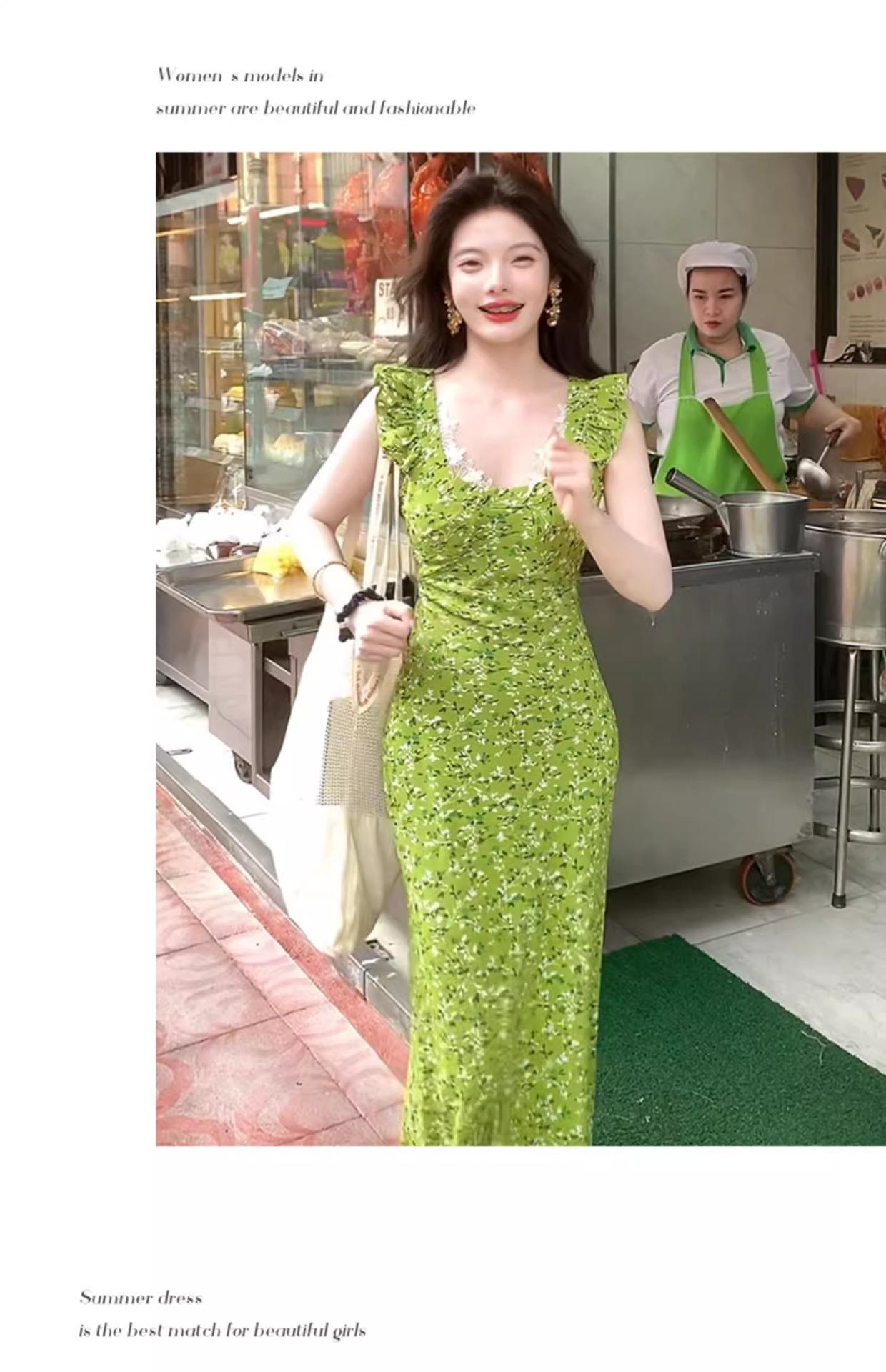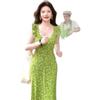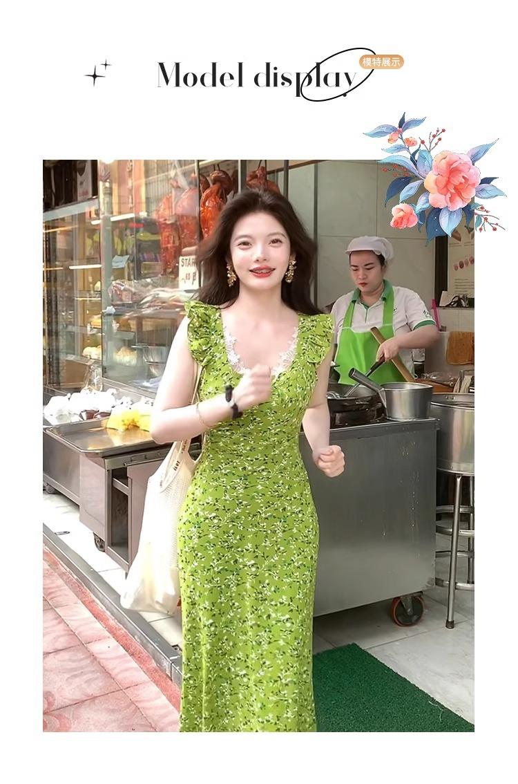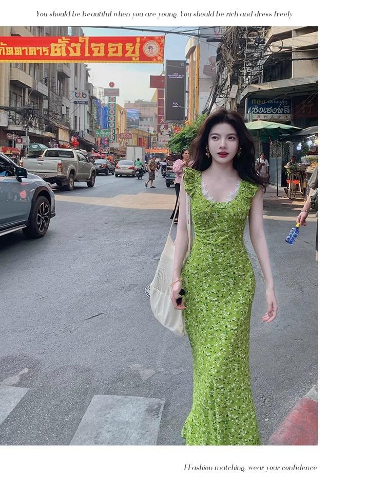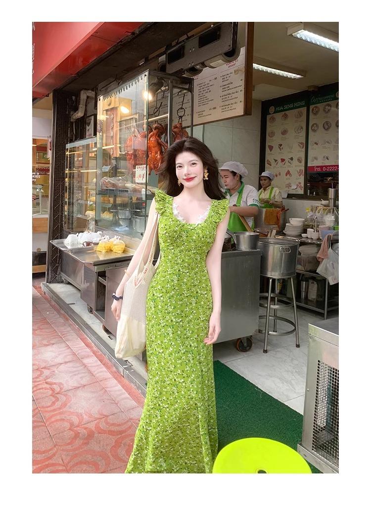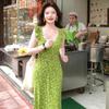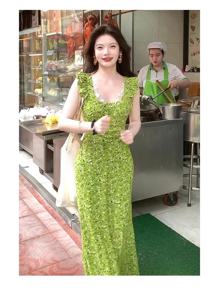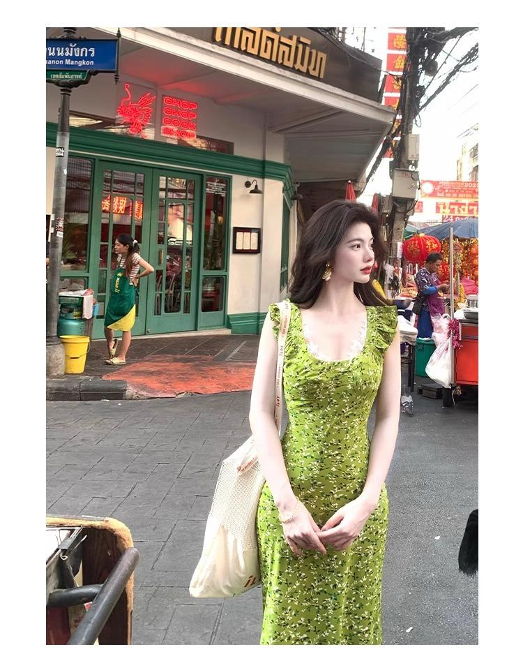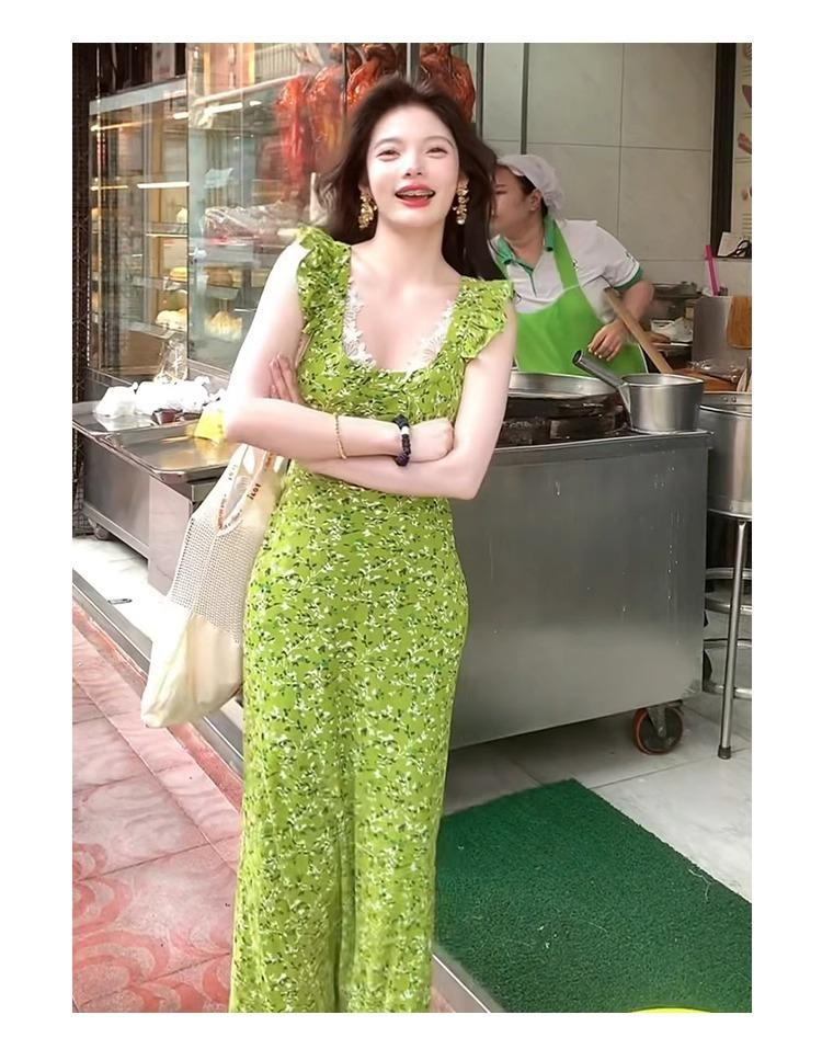 Vestido Estilo Floral Francés Adelgazante de Cintura Vacaciones en la Playa Cuello Cuadrado Chifón Pequeño Fresco Verde Vestido Largo para Mujer
