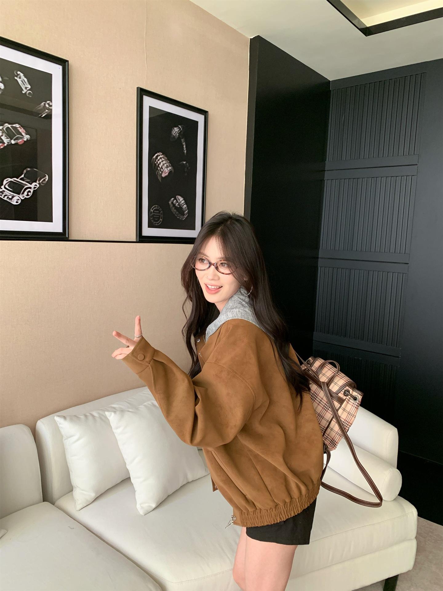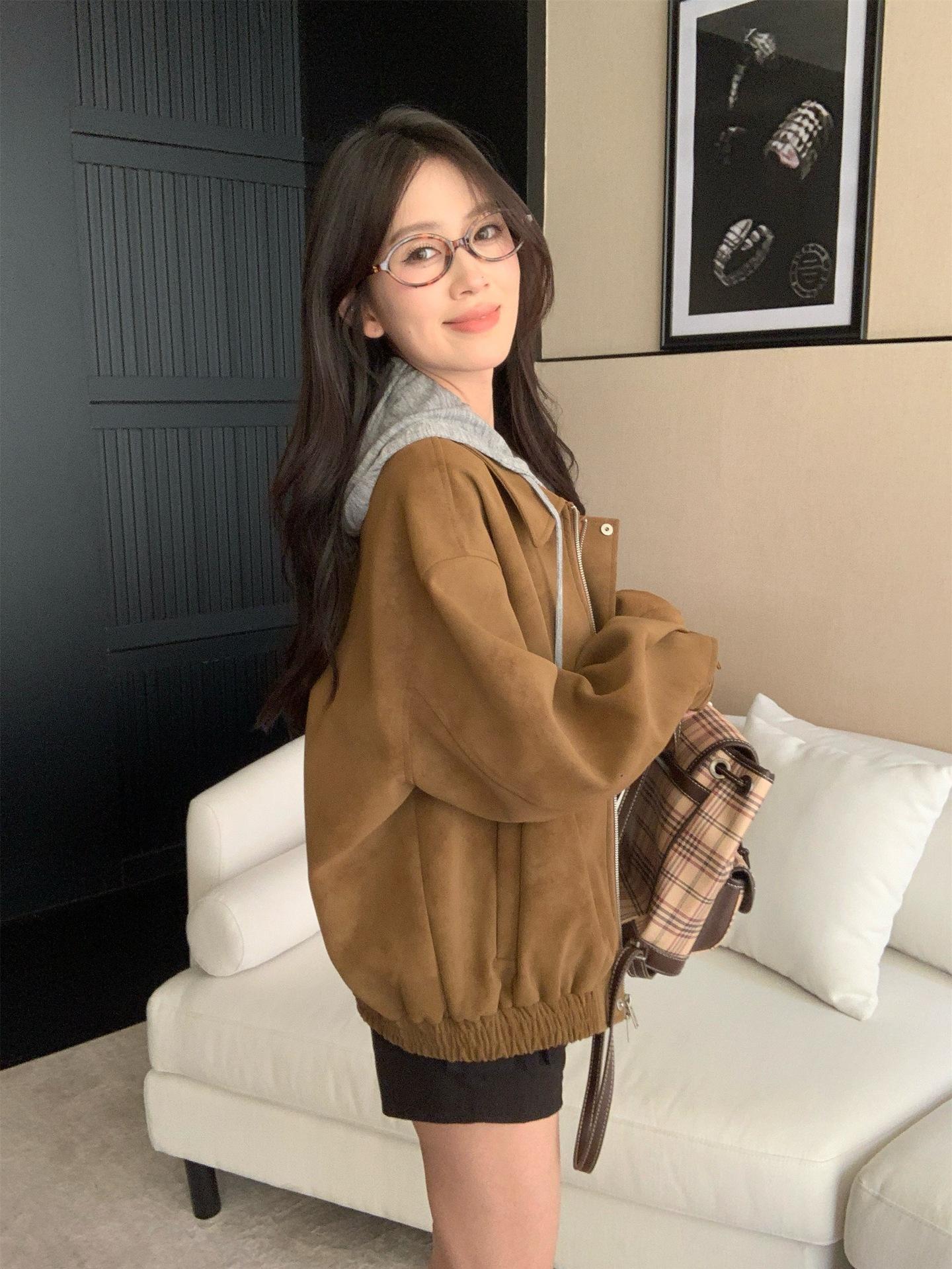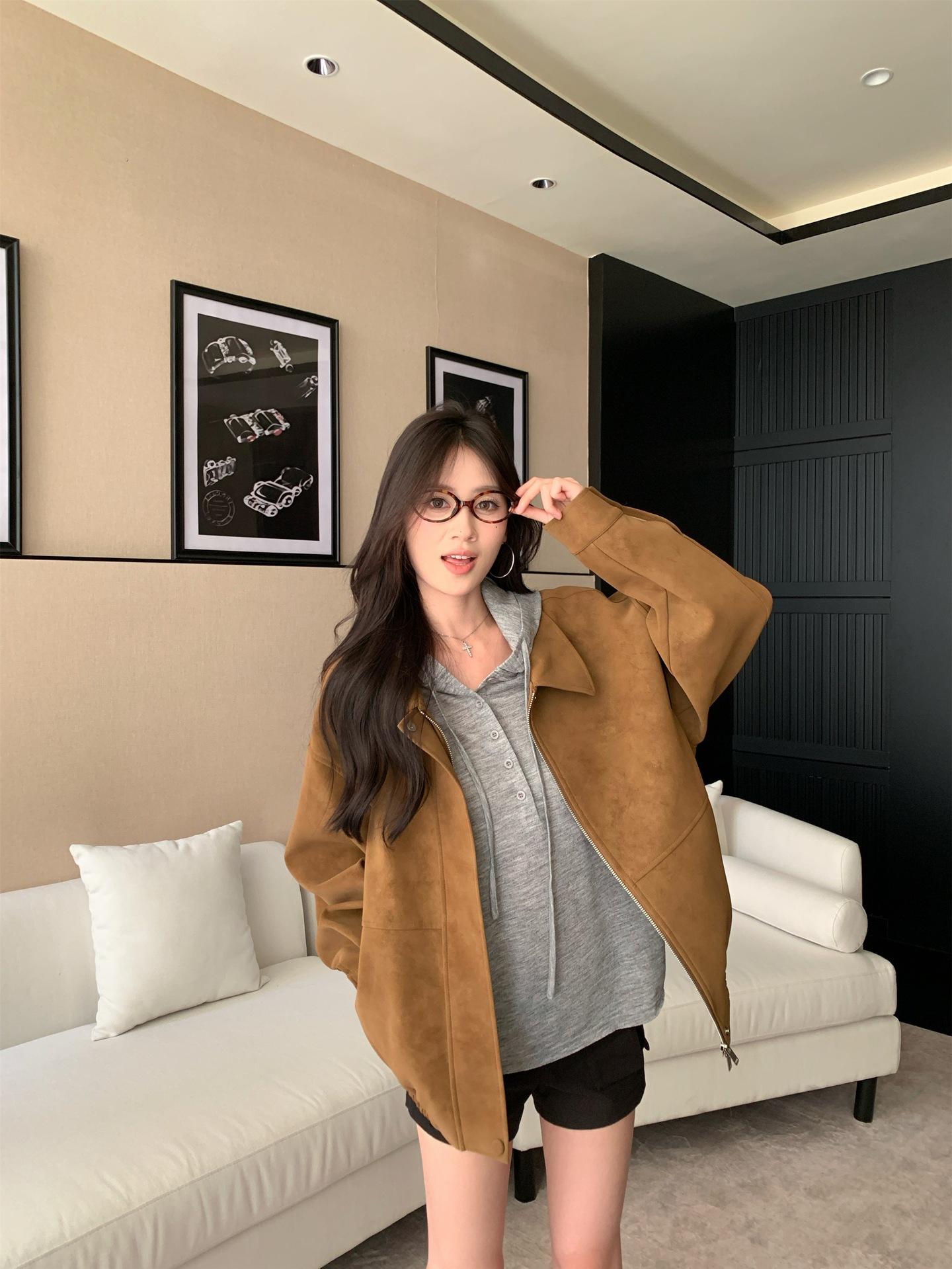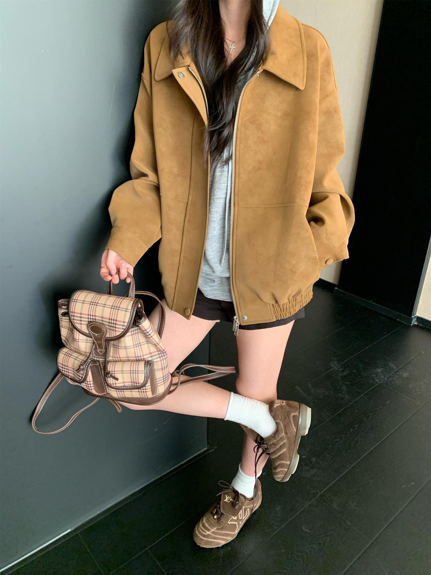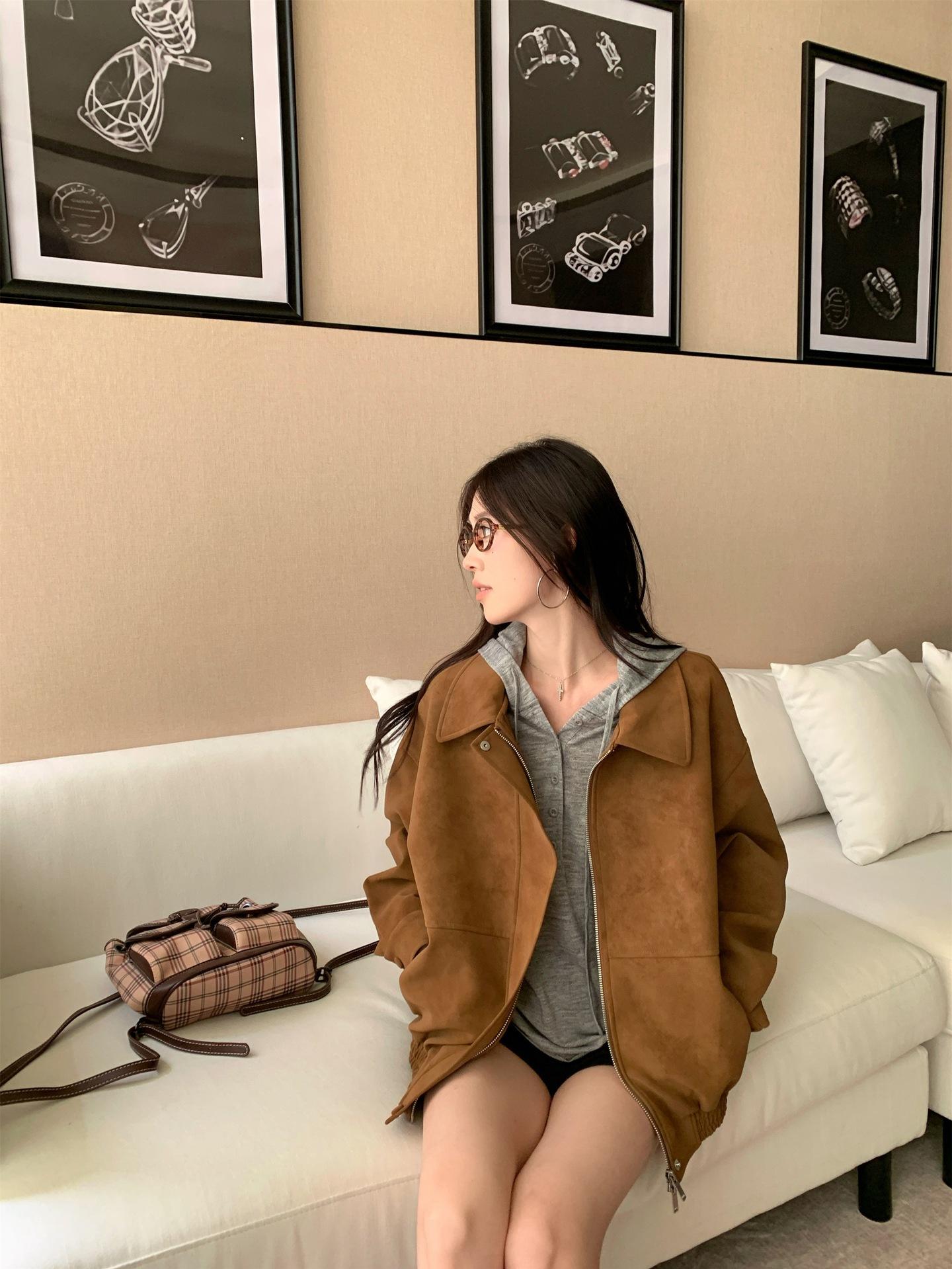 Foto Real Chaqueta de Gamuza Retro Mujer Otoño 2025 Americana Holgada Cuello Solapa Casual Versátil Adelgazante Abrigo Top
