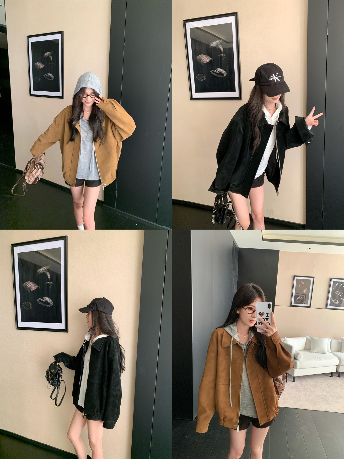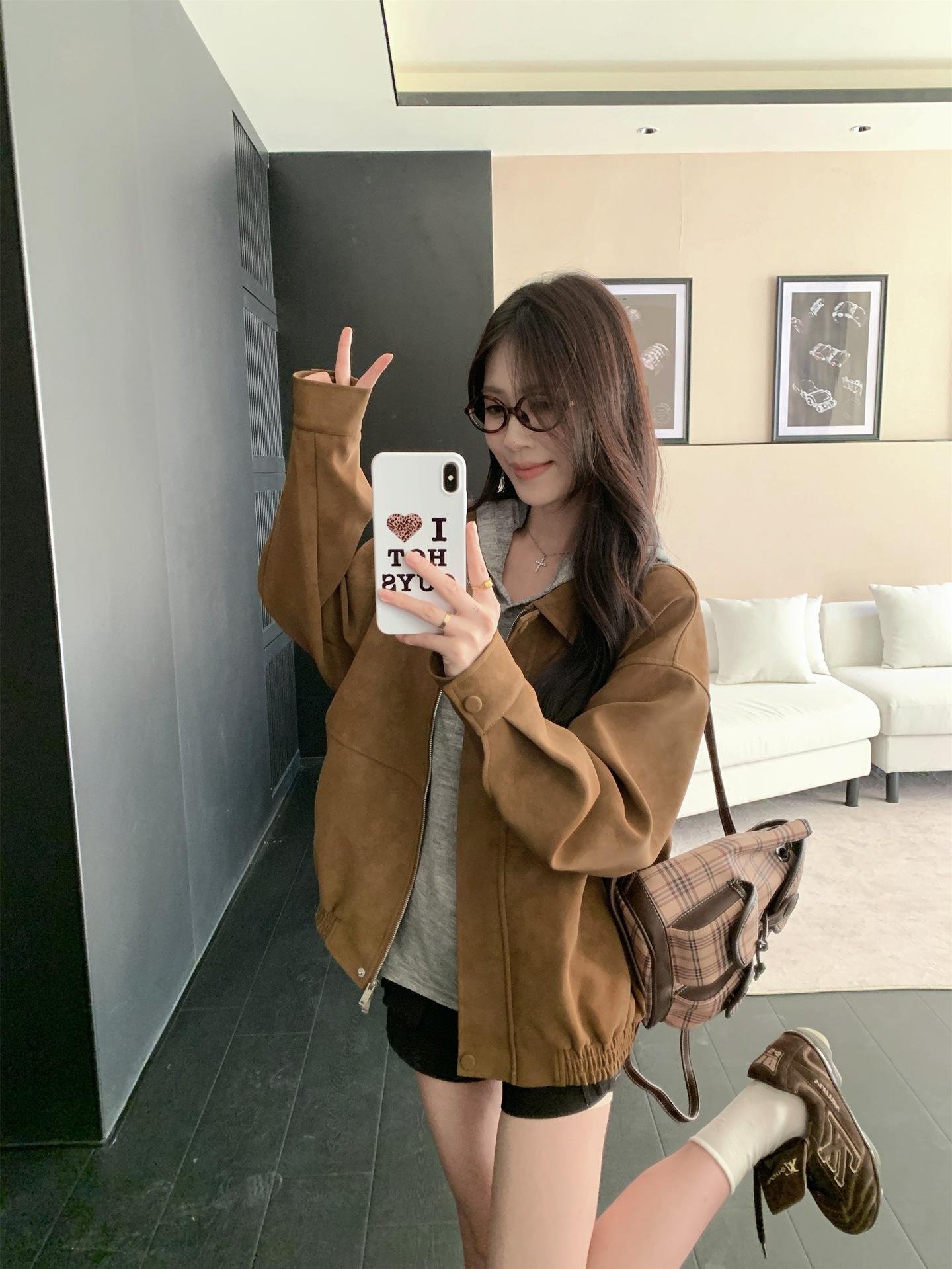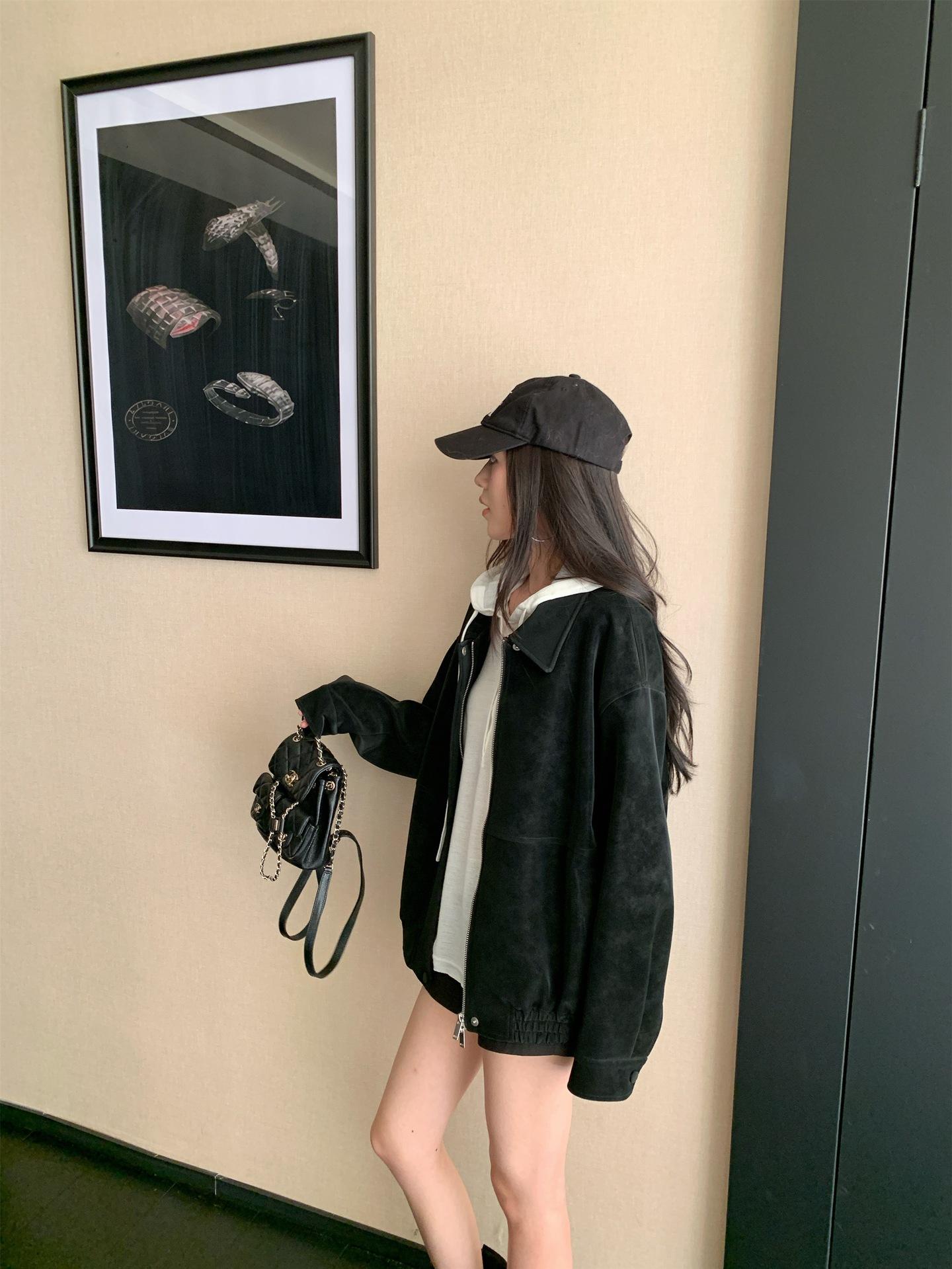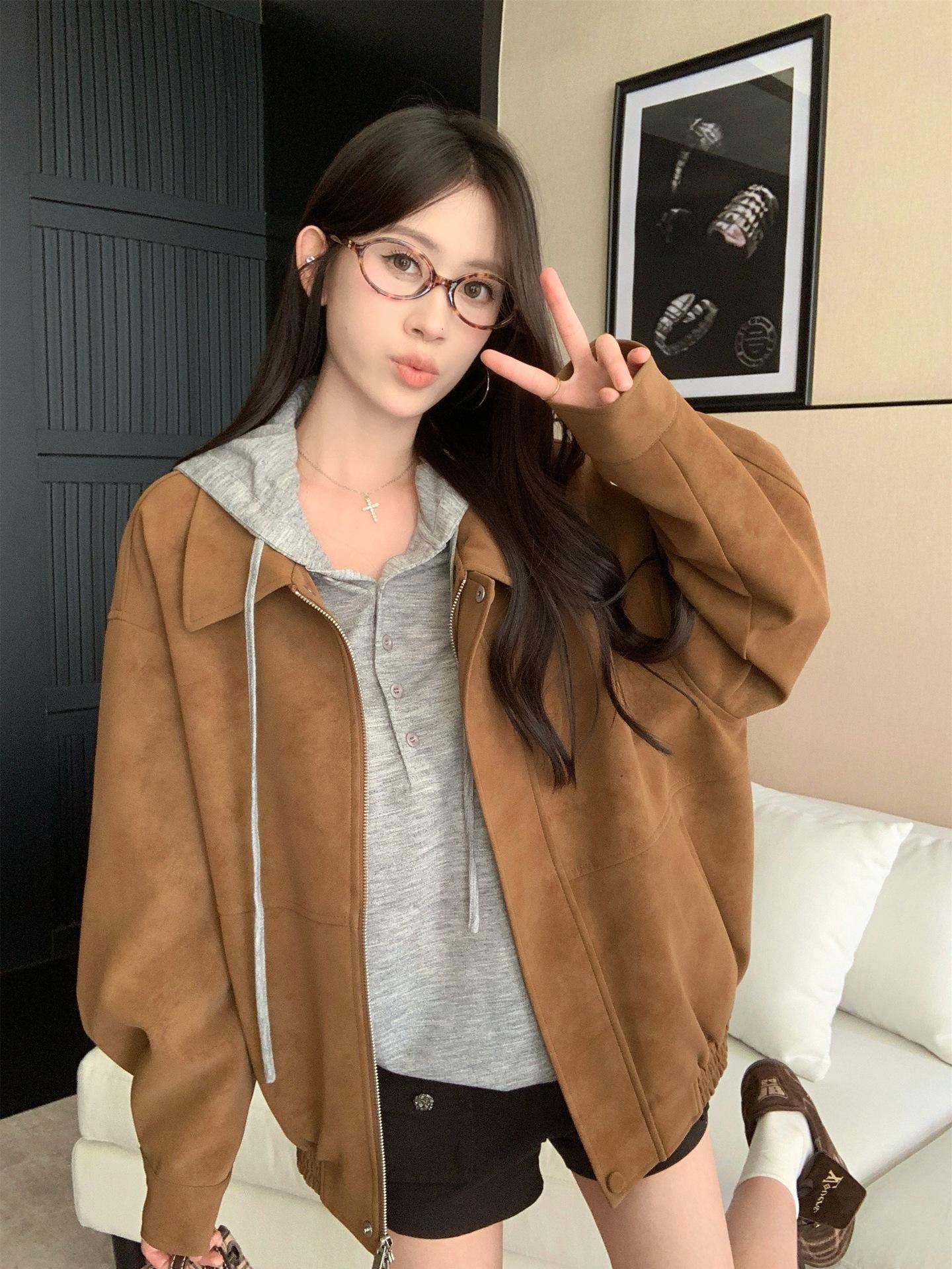 Foto Real Chaqueta de Gamuza Retro Mujer Otoño 2025 Americana Holgada Cuello Solapa Casual Versátil Adelgazante Abrigo Top