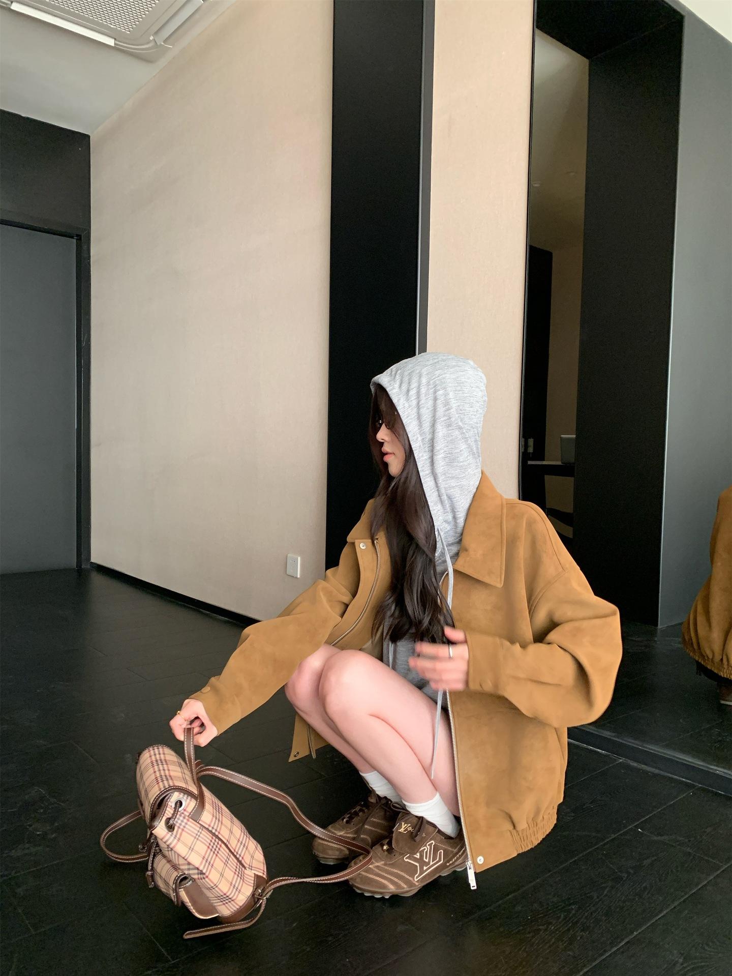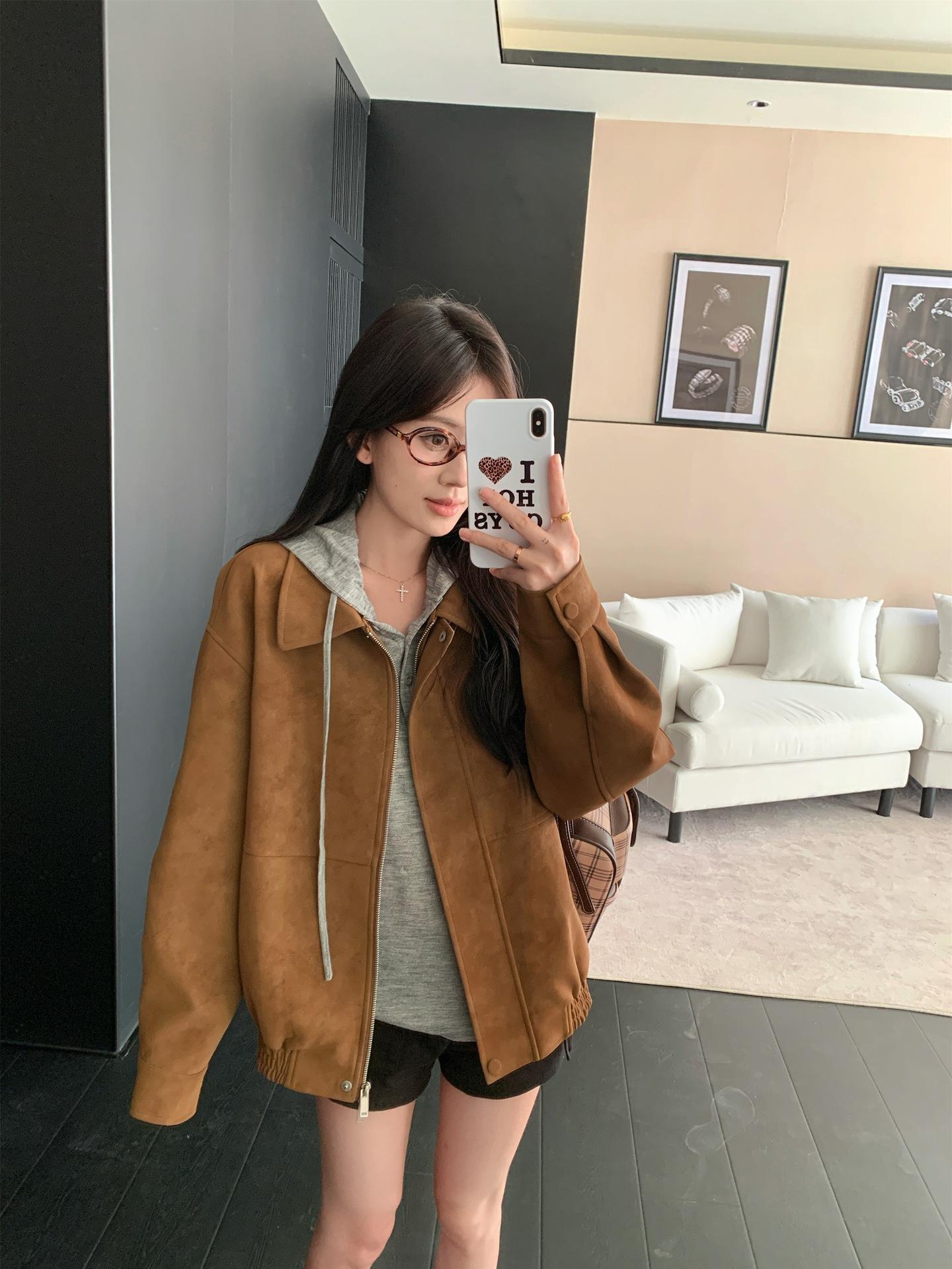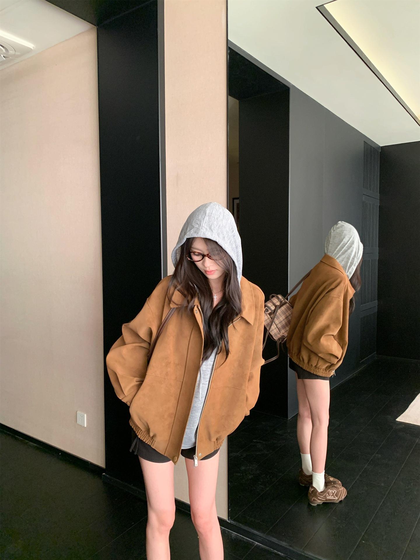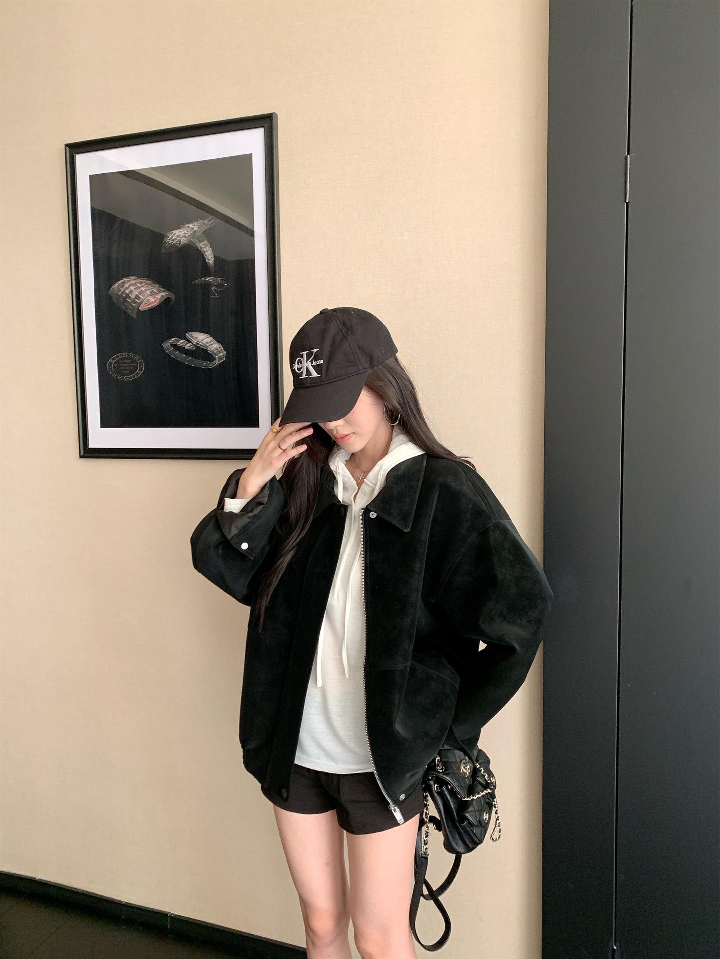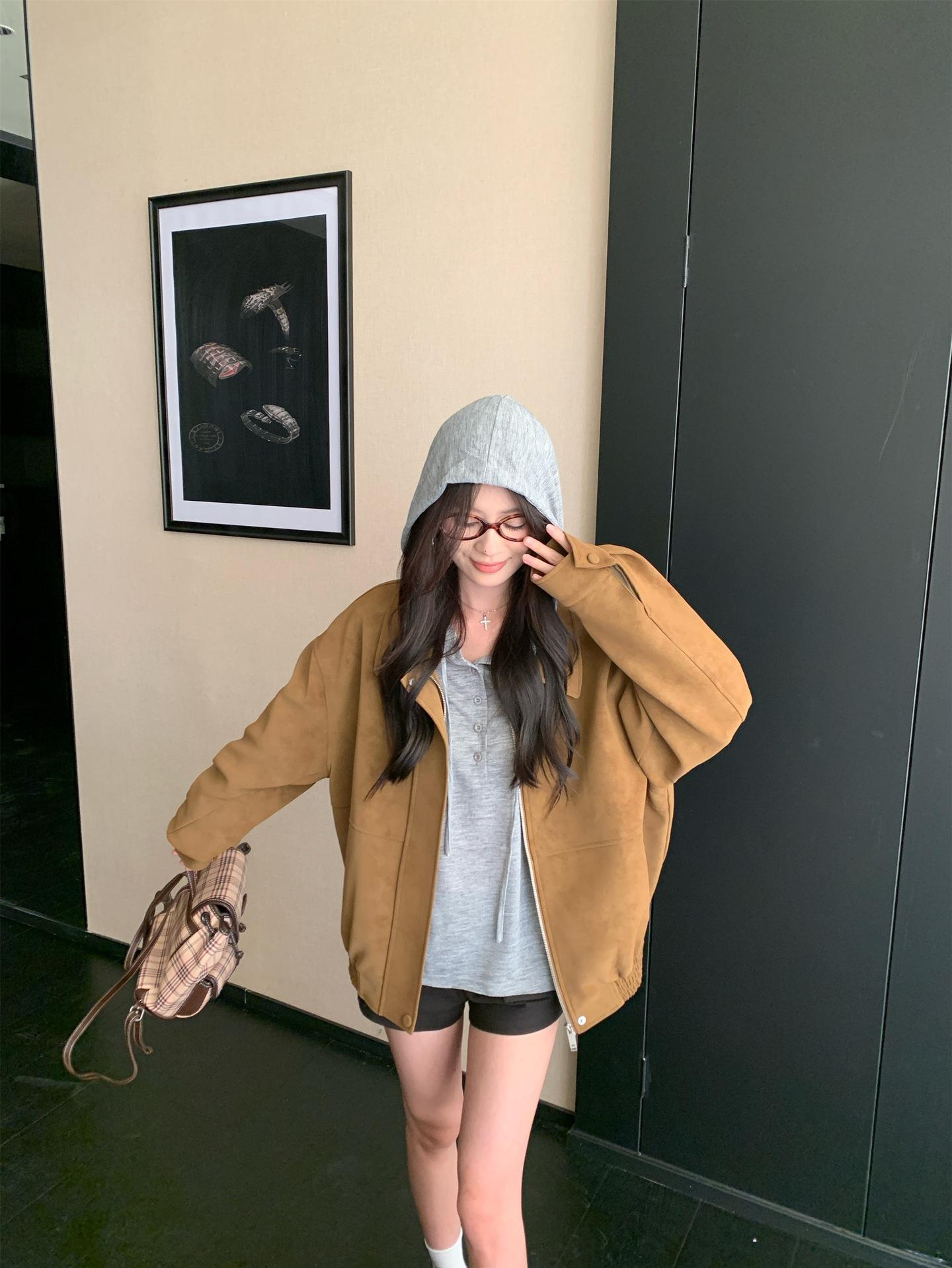 Foto Real Chaqueta de Gamuza Retro Mujer Otoño 2025 Americana Holgada Cuello Solapa Casual Versátil Adelgazante Abrigo Top